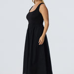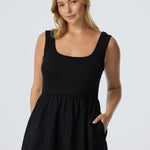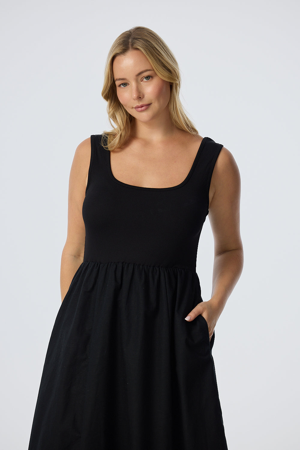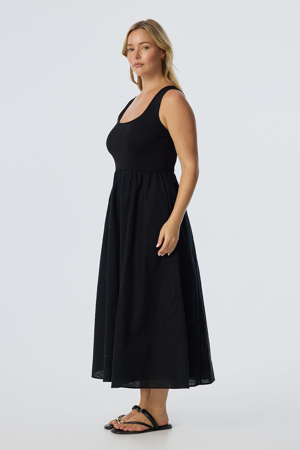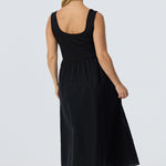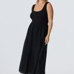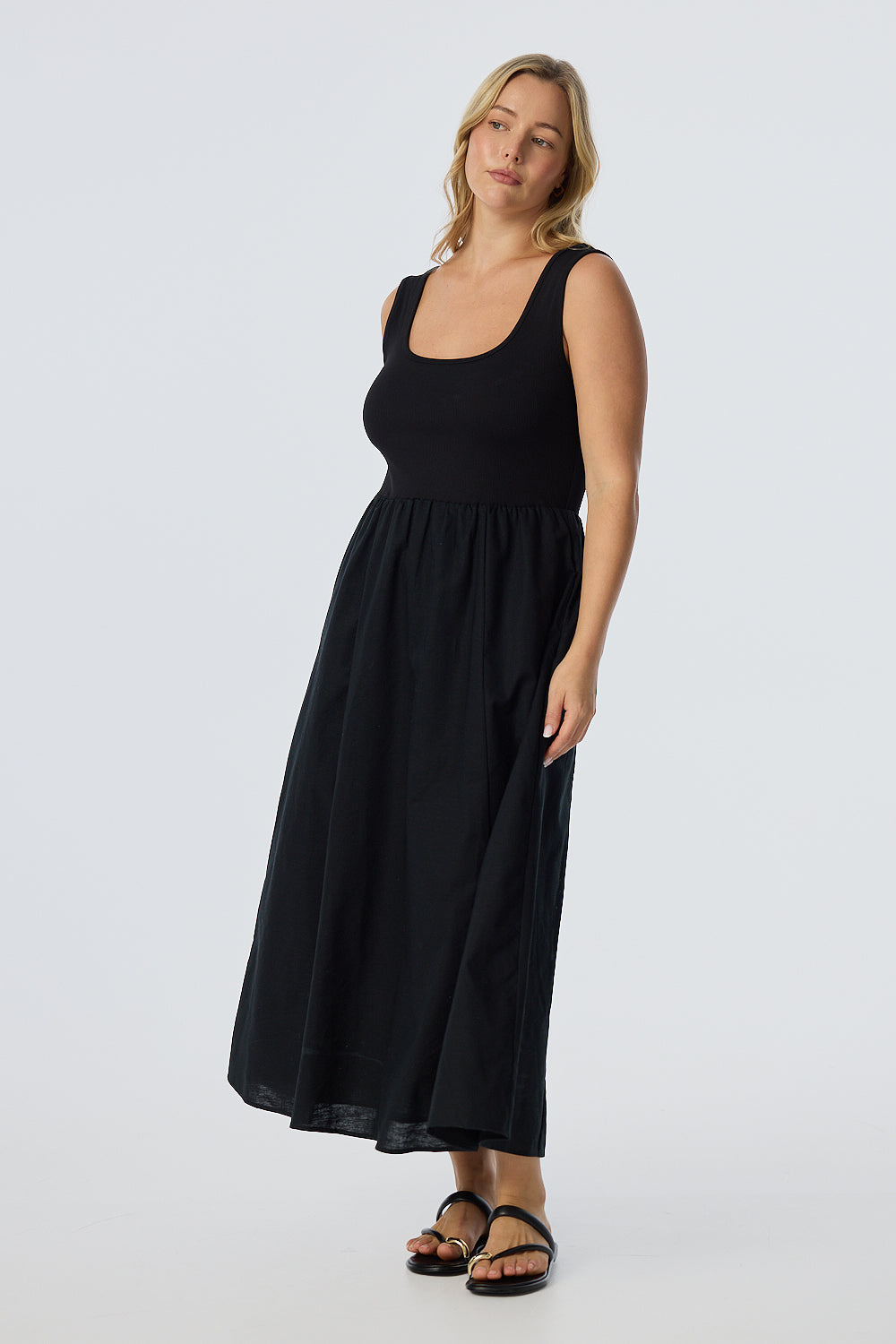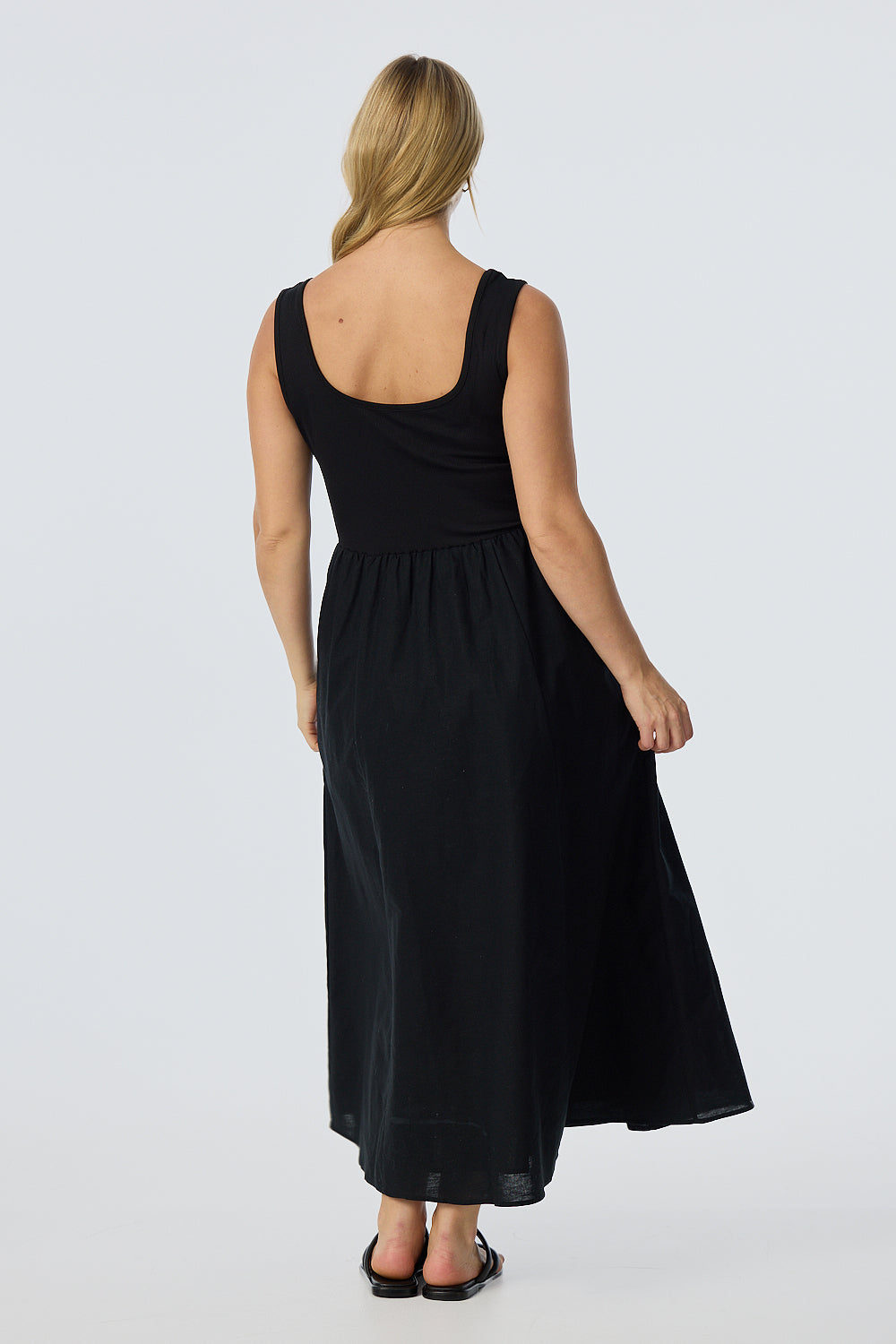 The Square Neck Gathered Dress in Black features a flattering square neckline with contrast rib and an internal elasticated waist for shape. Cut in an A-line midi silhouette with inseam pockets, it combines a jersey bodice with a cotton-linen skirt for all-day comfort.