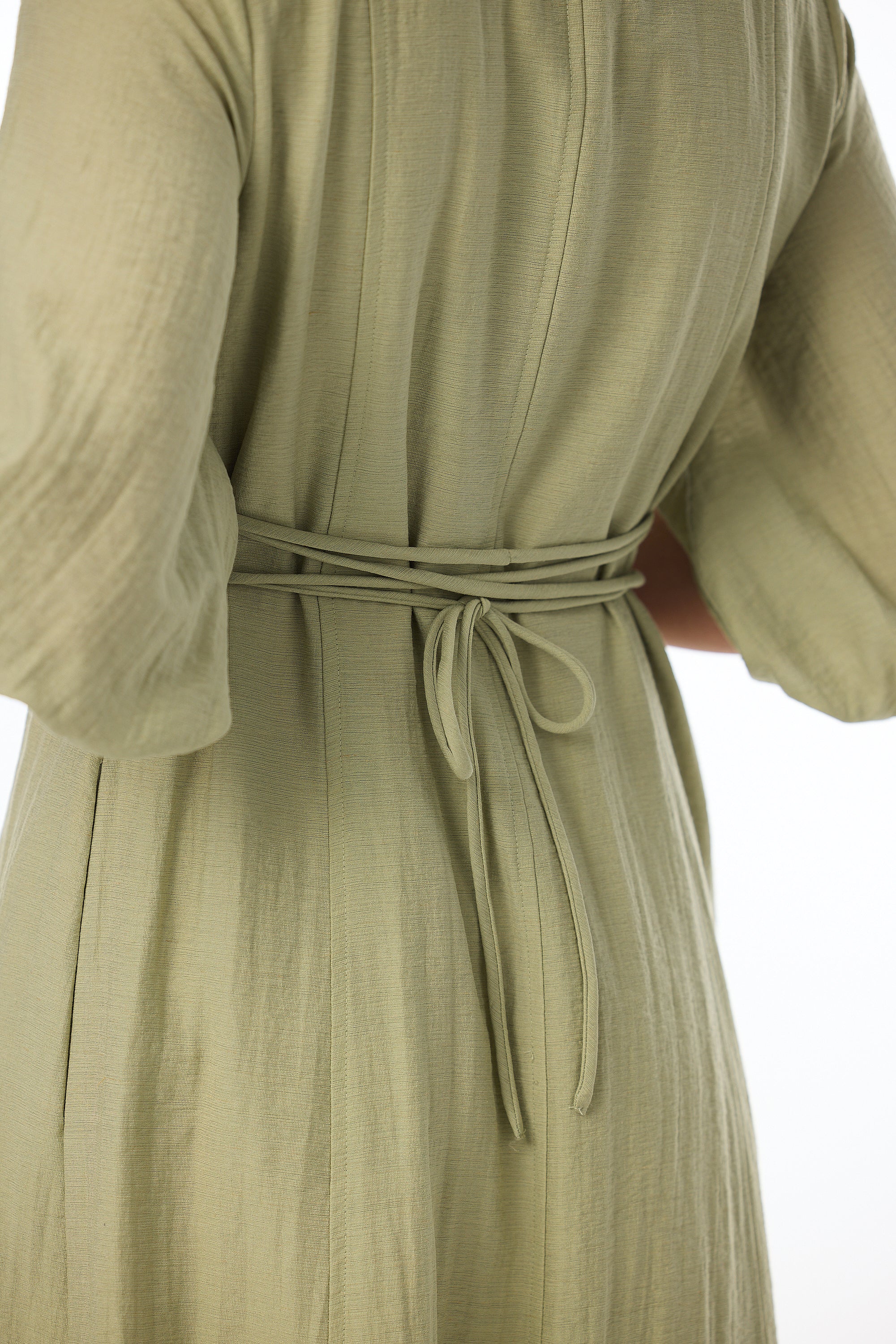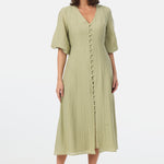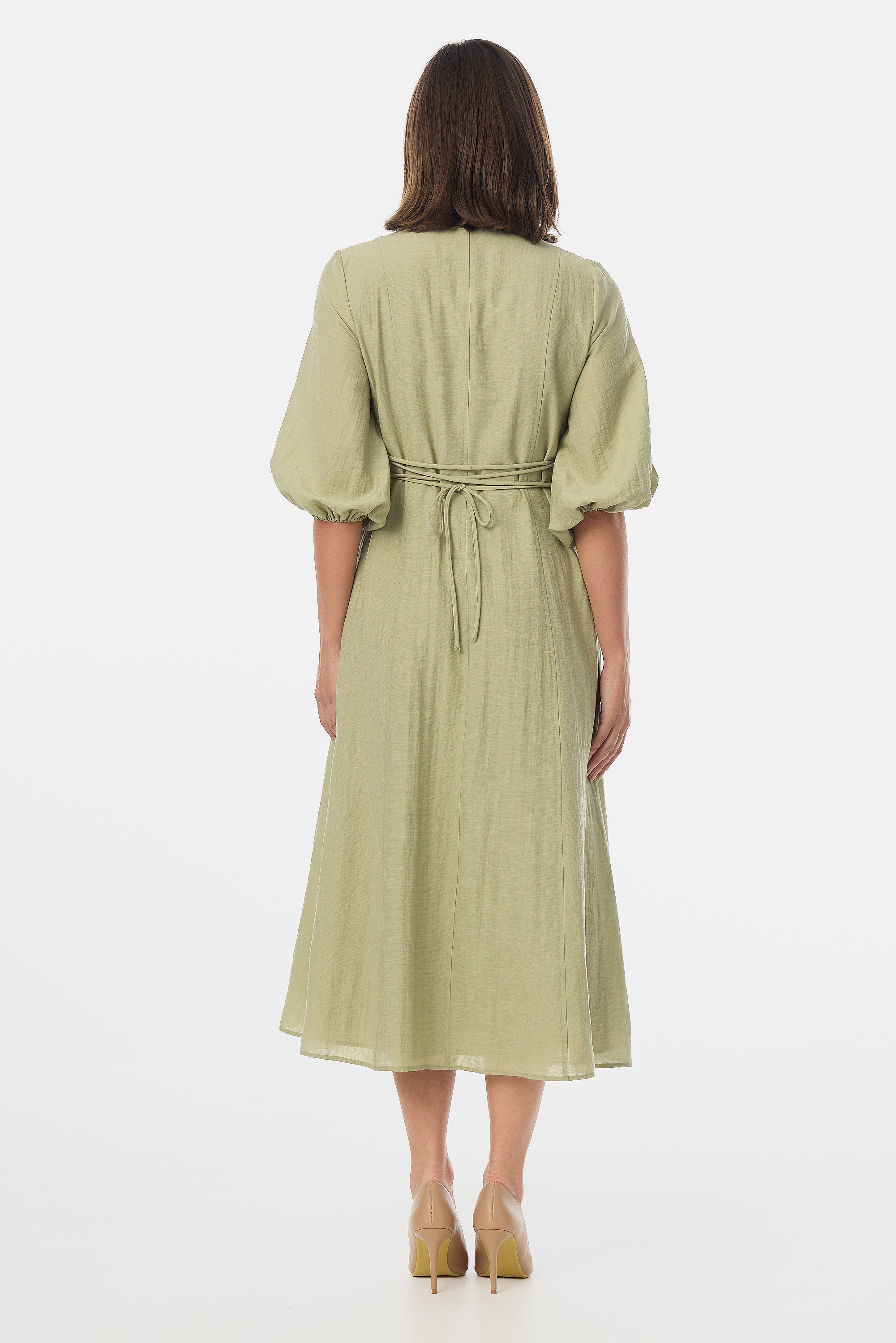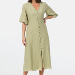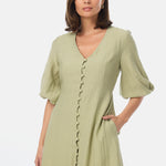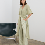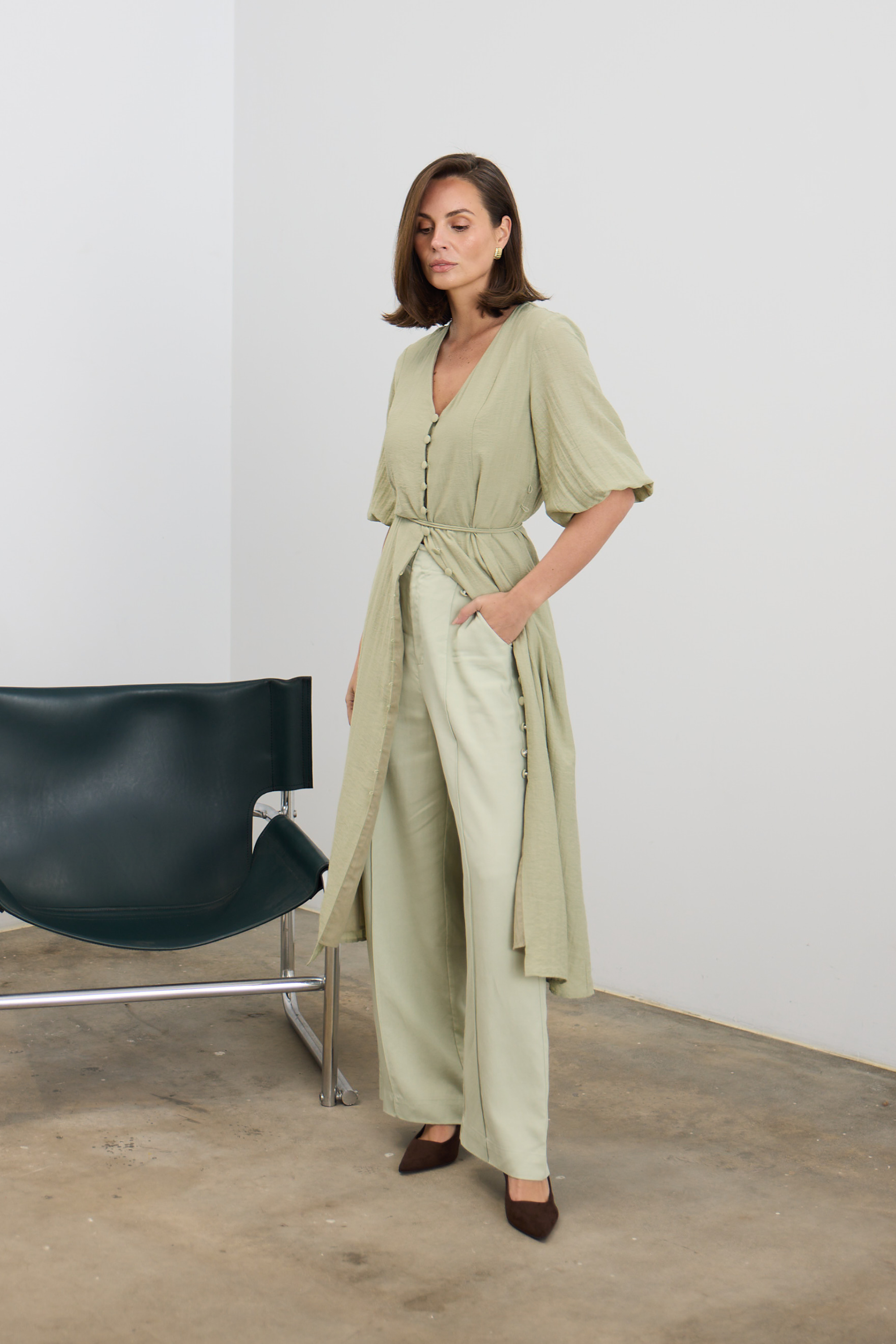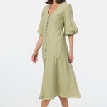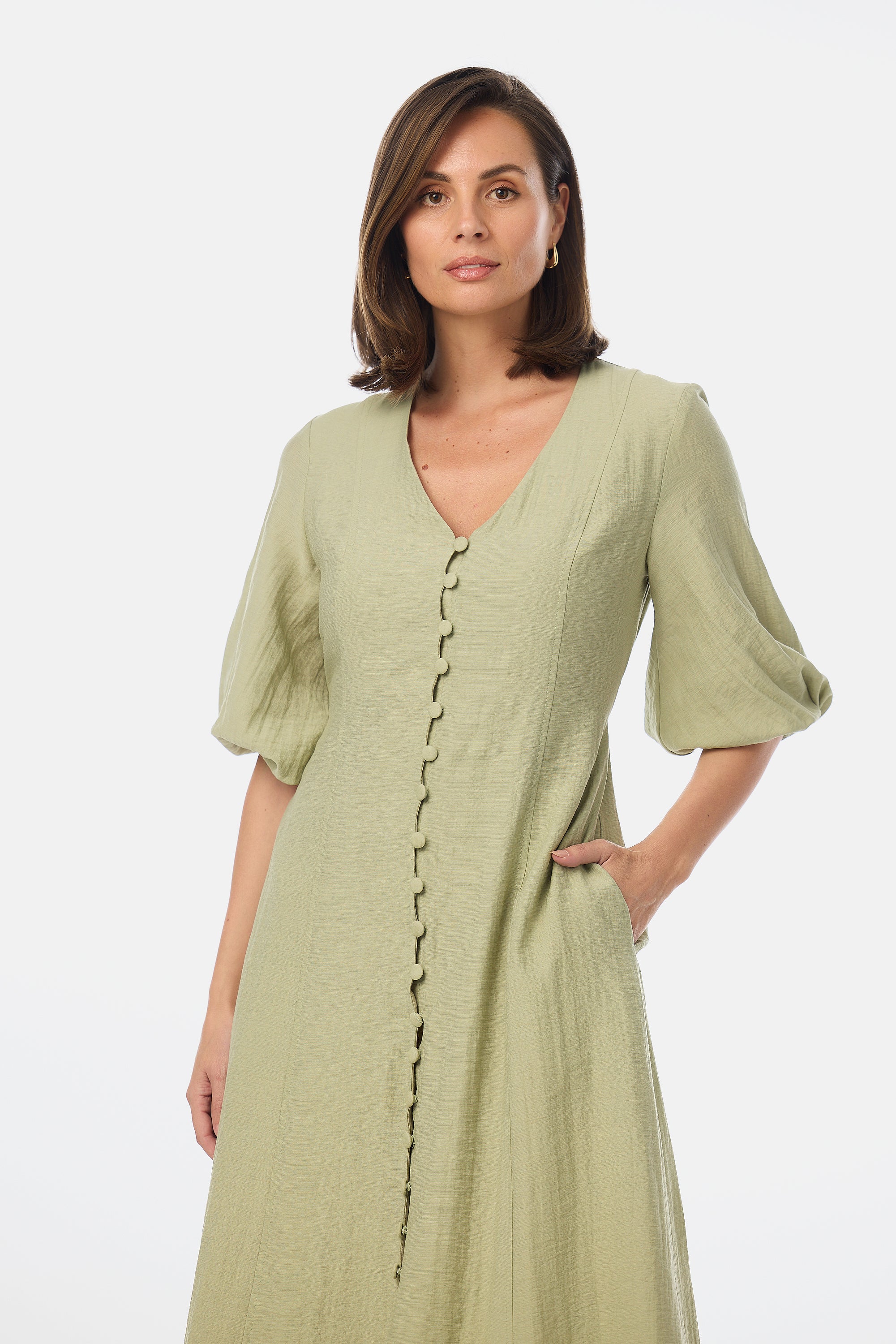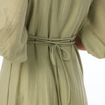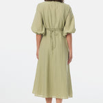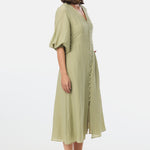 The Gathered Sleeve Midi Dress in Sage balances soft volume with thoughtful tailoring. Designed in a textured linen blend, this dress features gently gathered sleeves, and a removable waist tie for versatile styling across seasons.