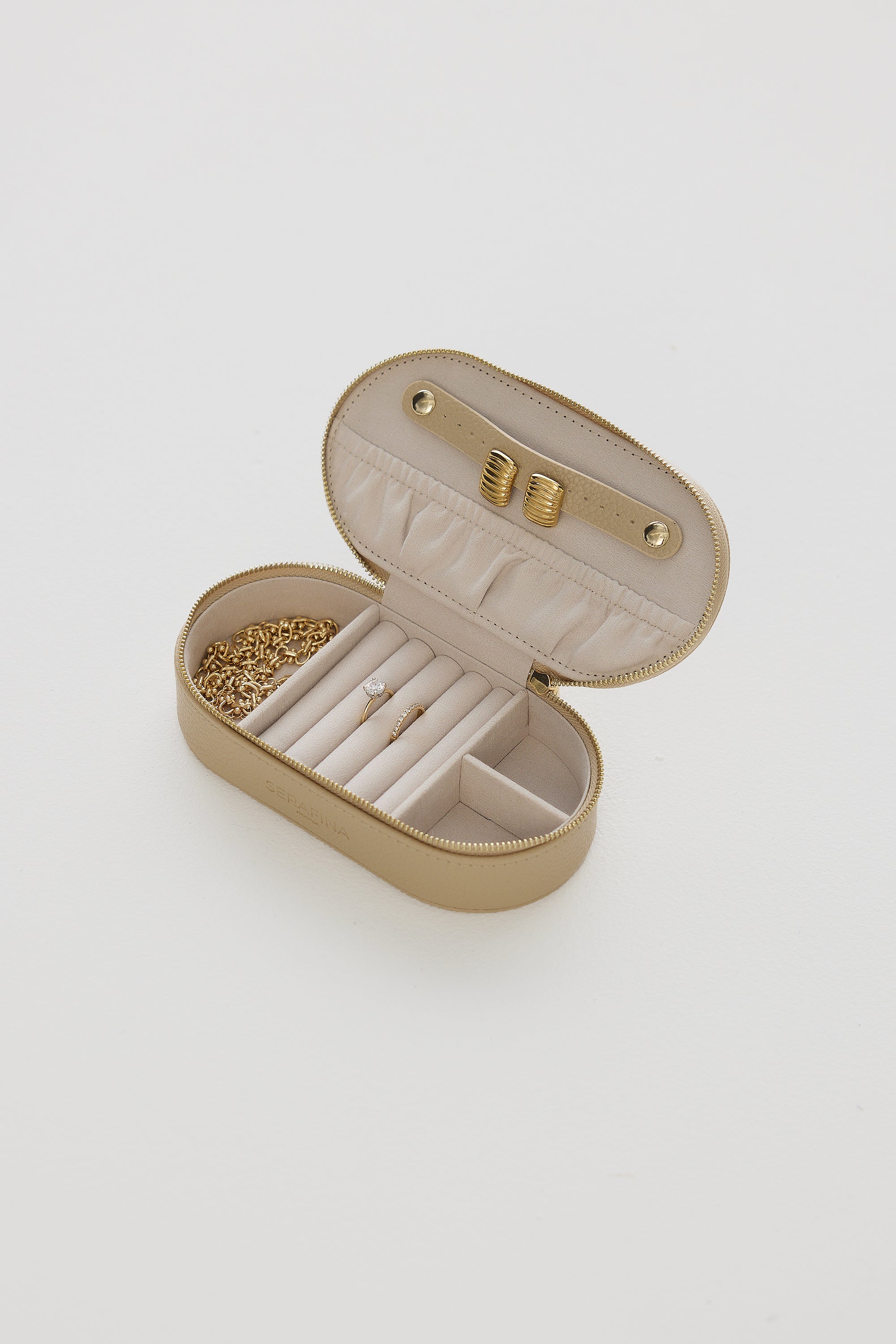 This is a great little jewellery case , the perfect size when travelling to fit these few essential pieces you need. Love the sand colour too.