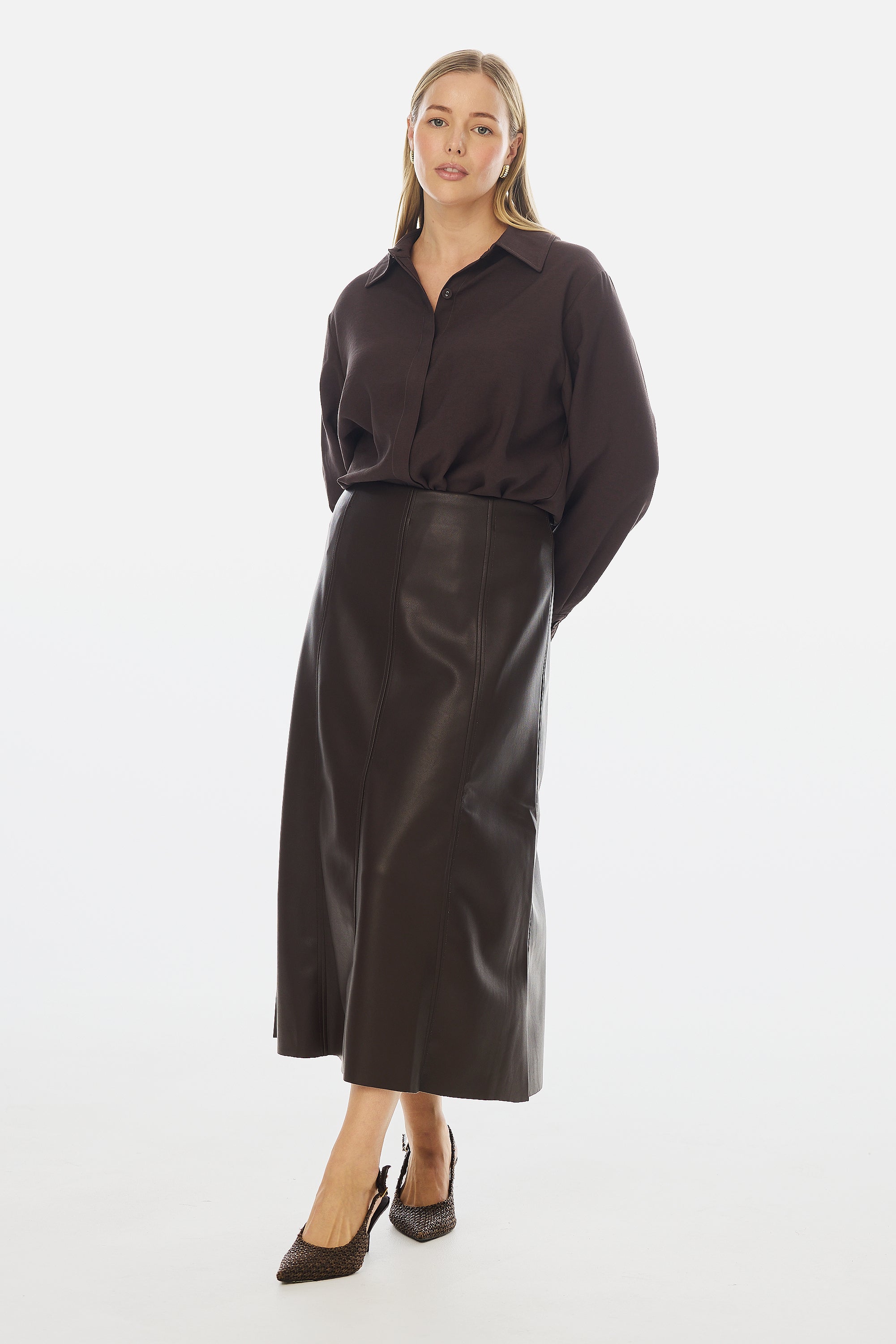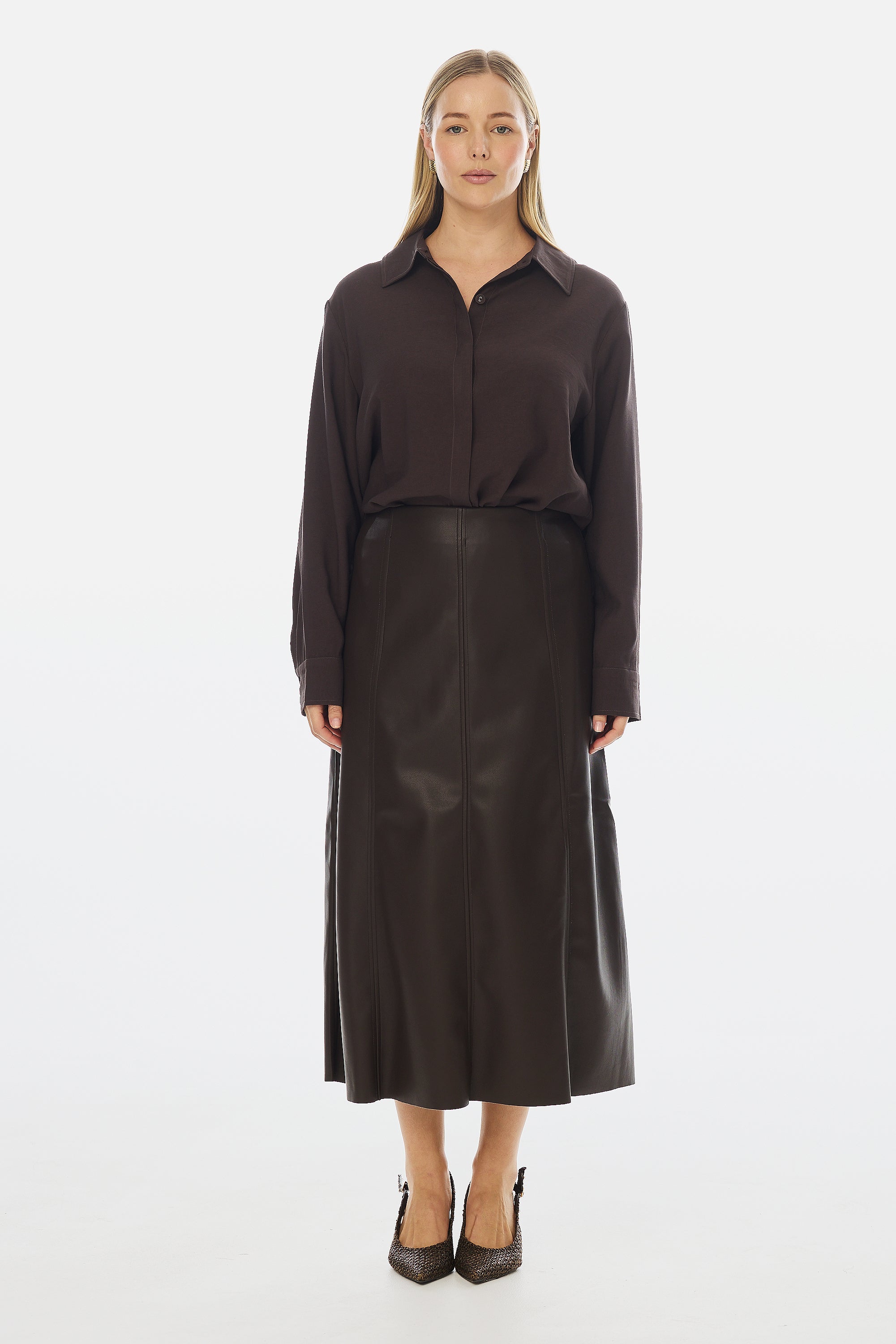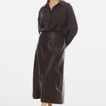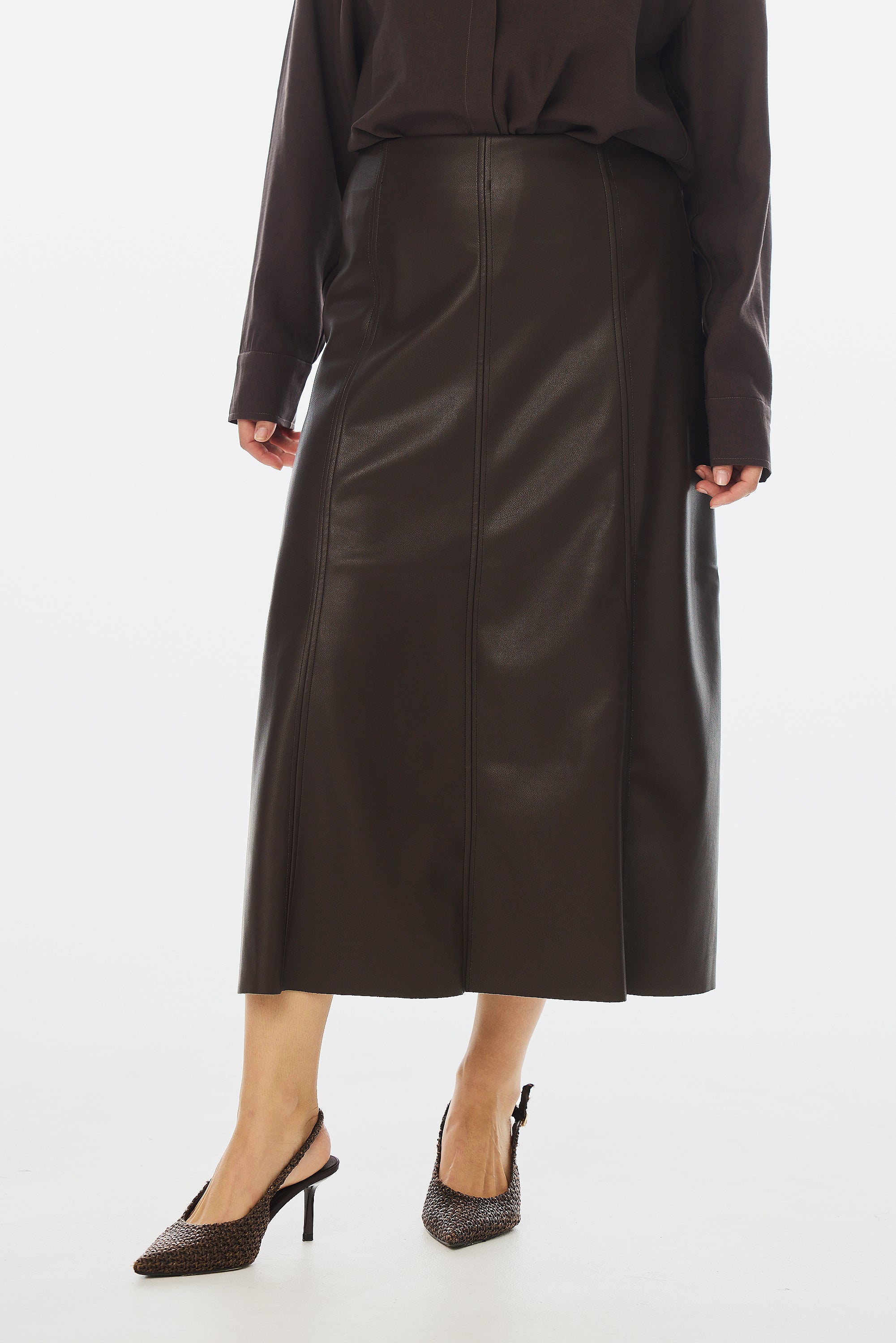 Modern edge meets everyday elegance in the Vegan Leather Panelled Skirt in Chocolate. Cut in a flattering A-line silhouette, this high-waisted midi skirt features topstitched seam detailing and a sleek finish that transitions effortlessly from day to night. Style with knits or shirting for elevated appeal.