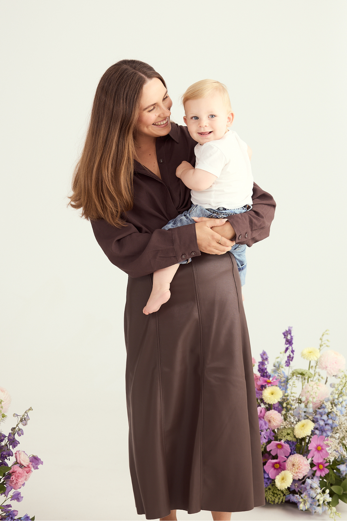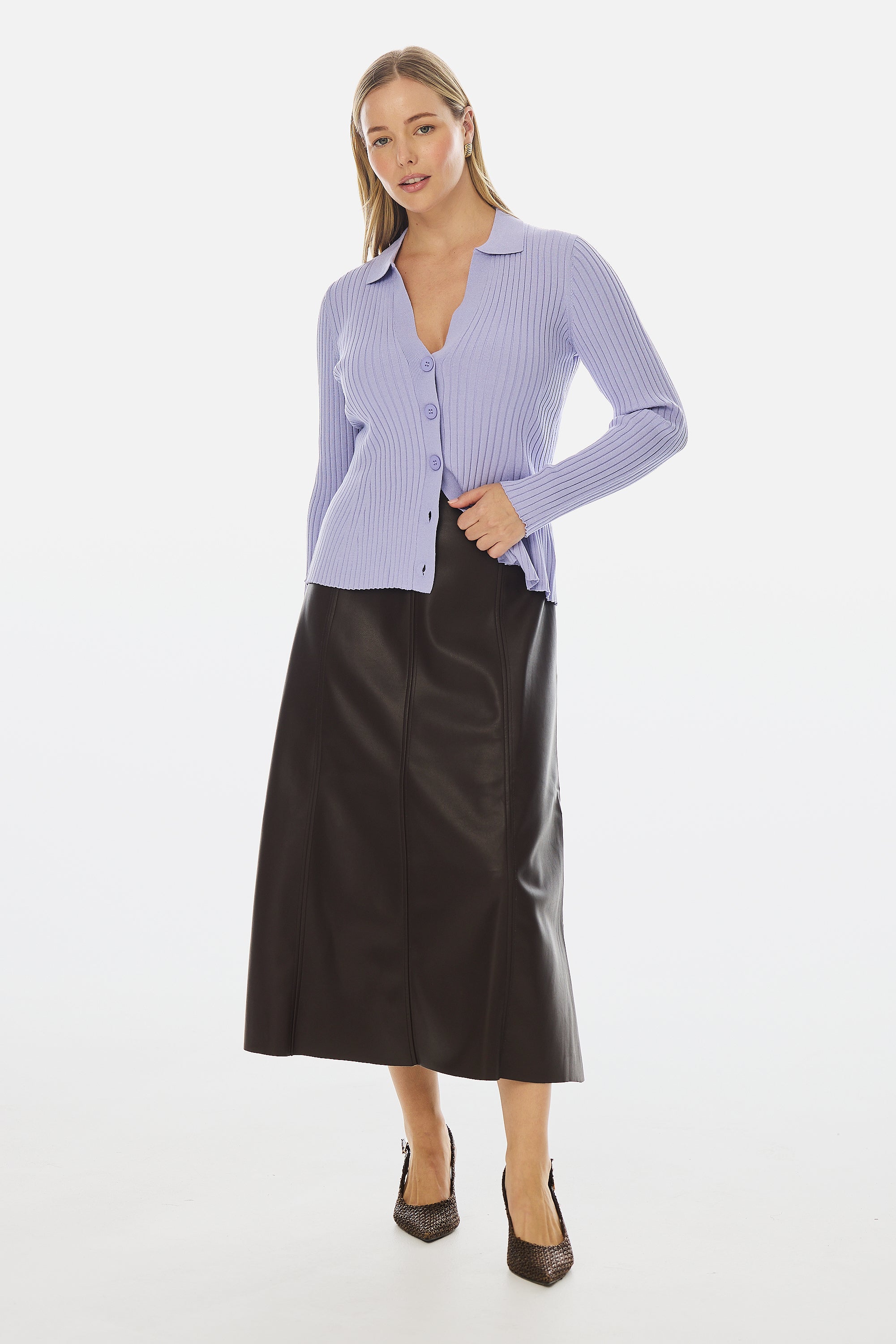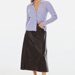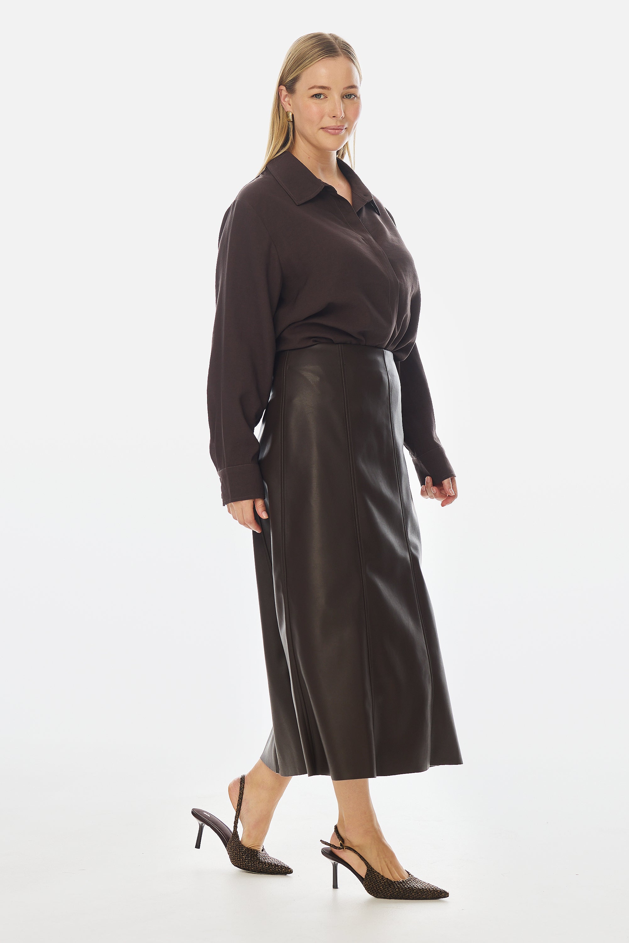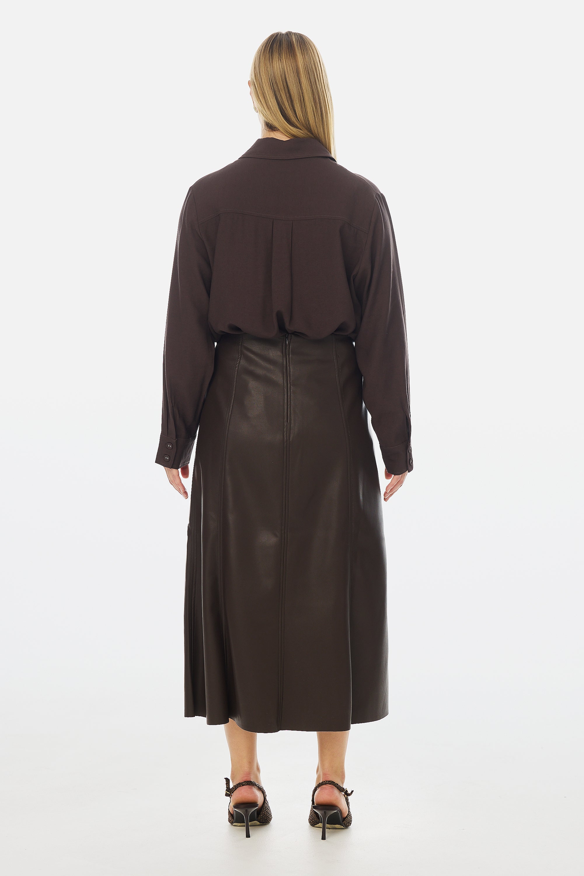 Modern edge meets everyday elegance in the Vegan Leather Panelled Skirt in Chocolate. Cut in a flattering A-line silhouette, this high-waisted midi skirt features topstitched seam detailing and a sleek finish that transitions effortlessly from day to night. Style with knits or shirting for elevated appeal.