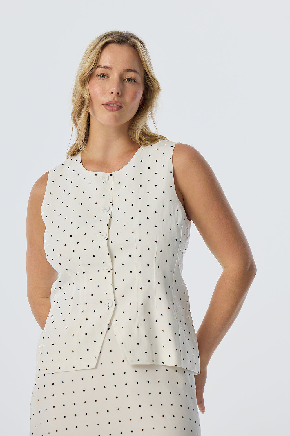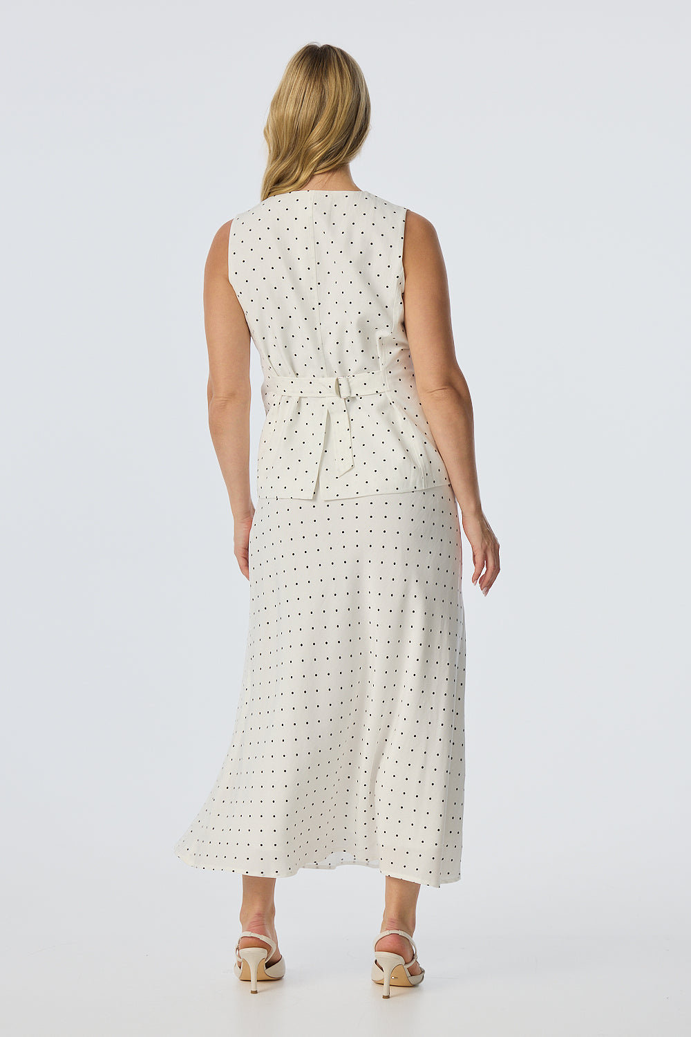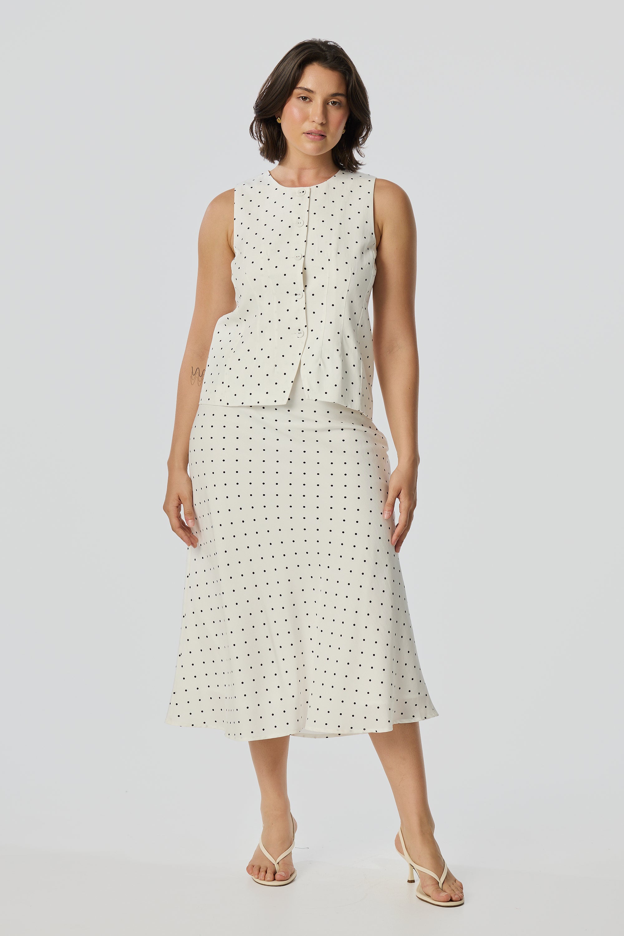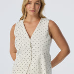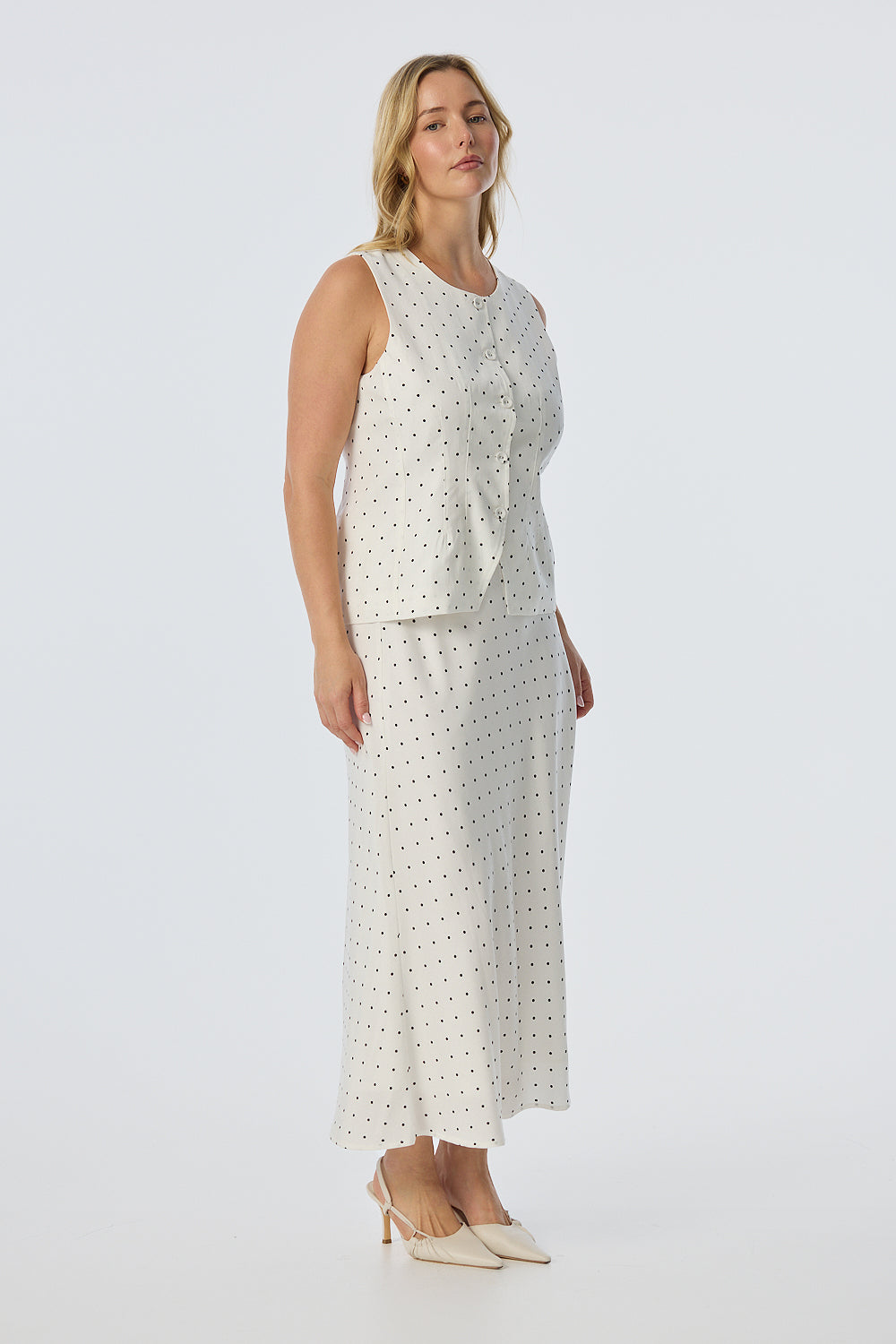 The Adjustable Waist Vest in White/Black Spot delivers clean tailoring with considered detail. Designed with a high round neckline and a fitted, sleeveless silhouette, the adjustable back belt with slider allows for a personalised fit. This vest pairs back seamlessly with the Slip Midi Skirt in White/Black Spot.