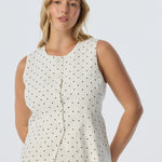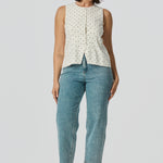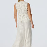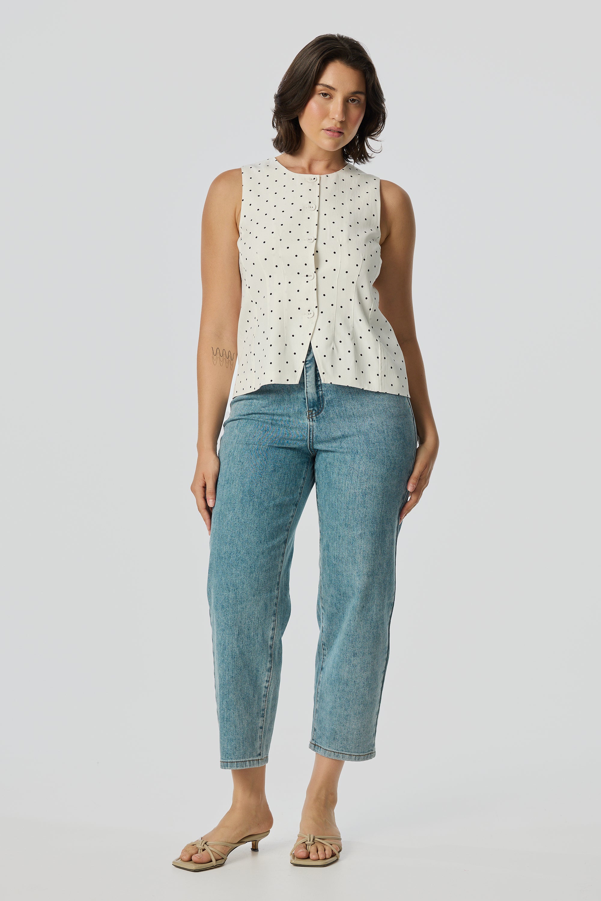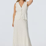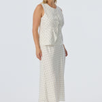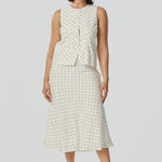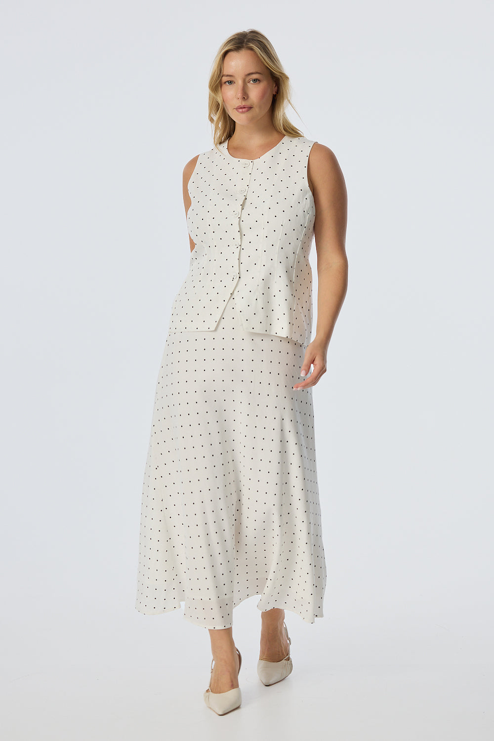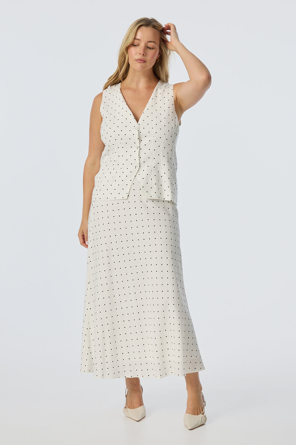 The Adjustable Waist Vest in White/Black Spot delivers clean tailoring with considered detail. Designed with a high round neckline and a fitted, sleeveless silhouette, the adjustable back belt with slider allows for a personalised fit. This vest pairs back seamlessly with the Slip Midi Skirt in White/Black Spot.