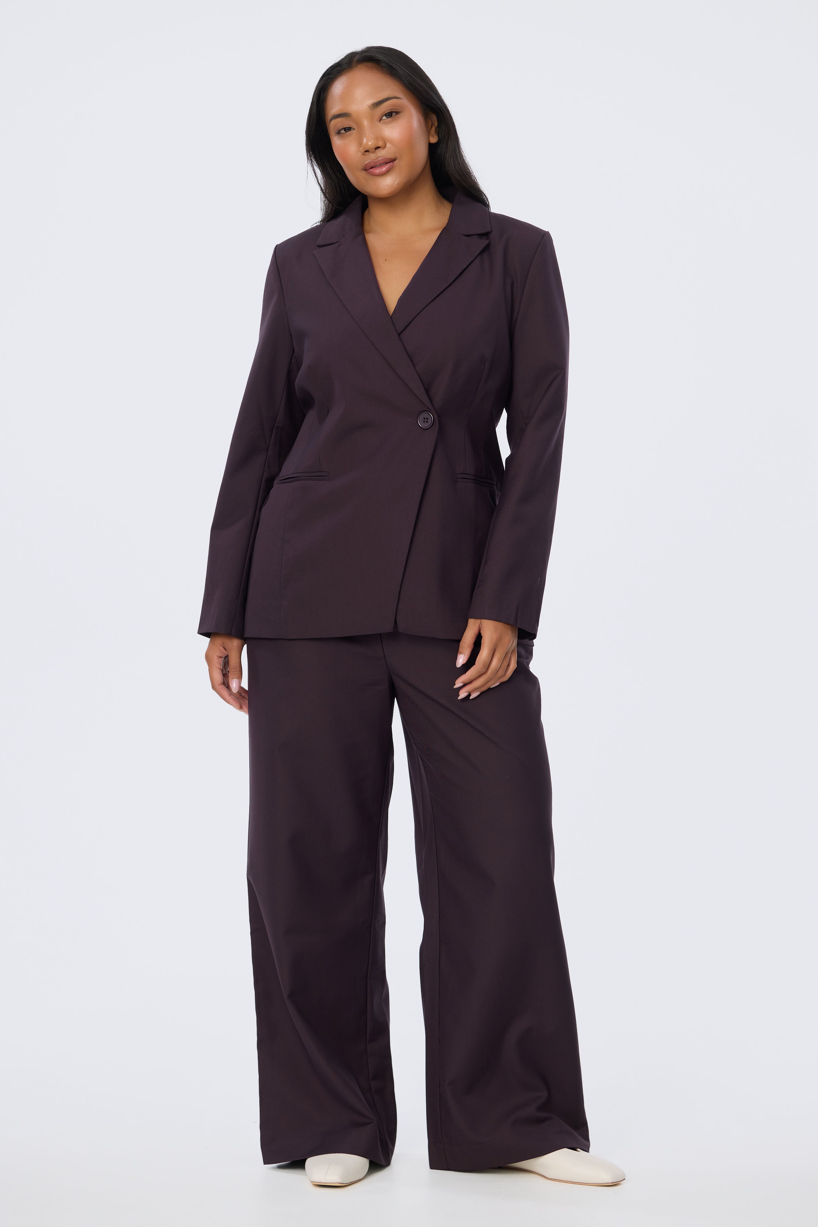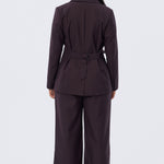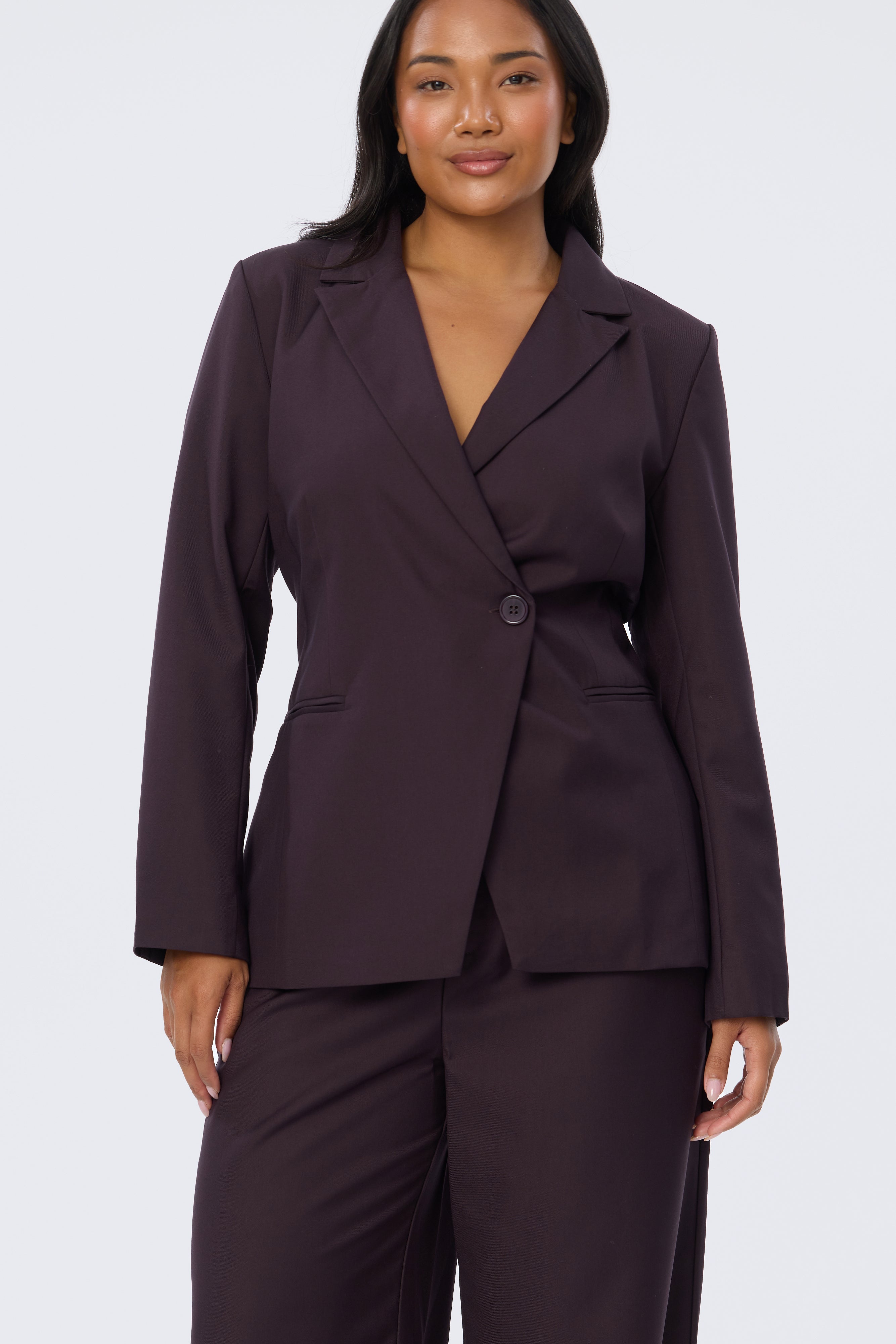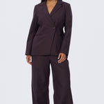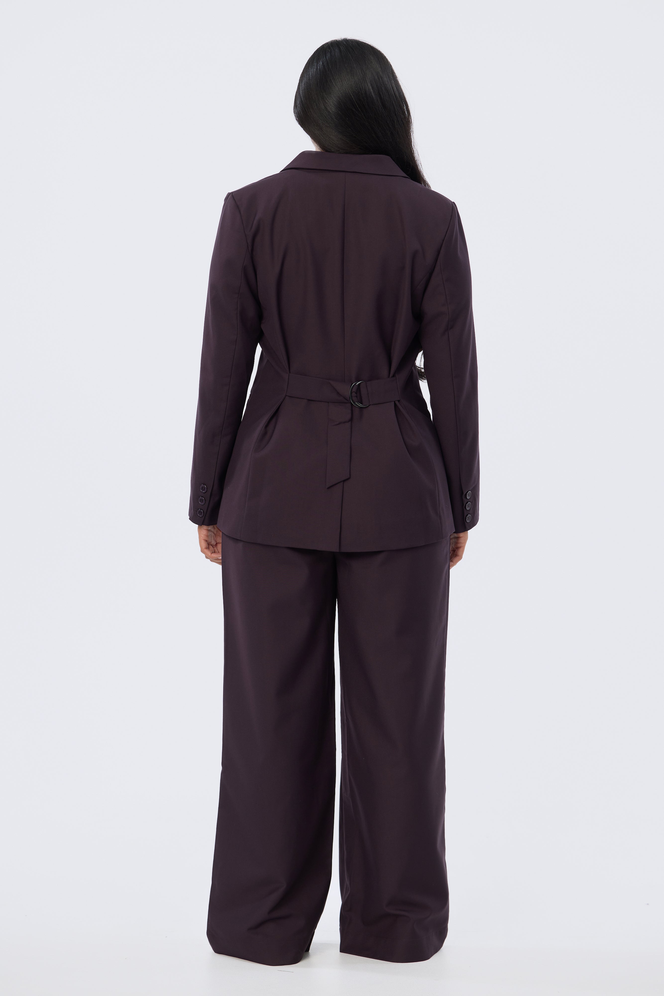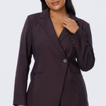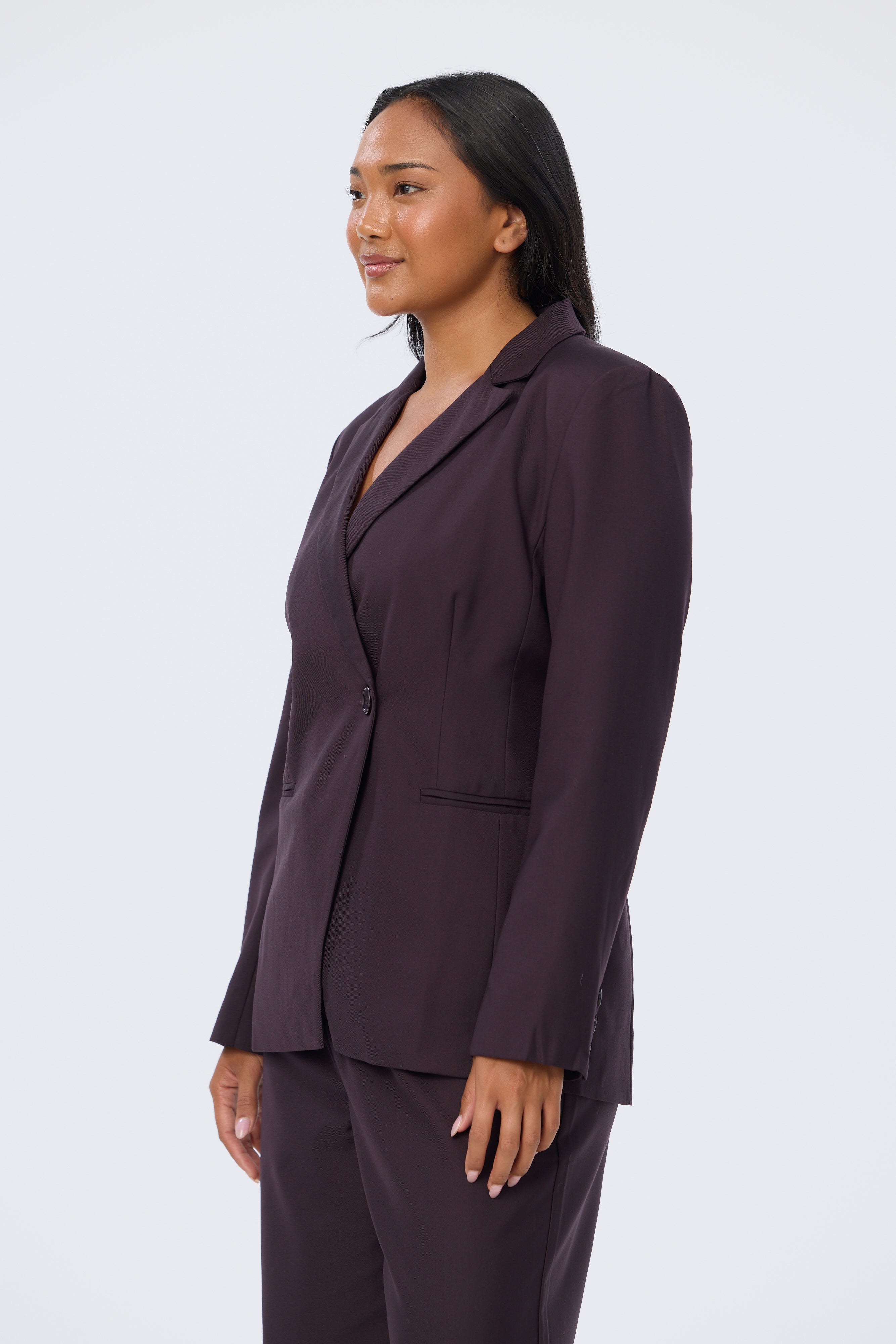 The Asymmetric Blazer in Aubergine is tailored for a structured yet flattering fit. Designed in a double-breasted silhouette with a single button closure, it falls to a regular length with functional welt pockets and a back hem vent. Fully lined for a polished finish, pair it back with the matching Detachable Belt Pant for a coordinated suiting set.