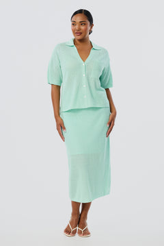 The Crochet Short Sleeve Shirt in Mint offers a modern take on a summer classic. Featuring a breathable open-knit texture and relaxed silhouette, it's ideal for layering or wearing on its own.