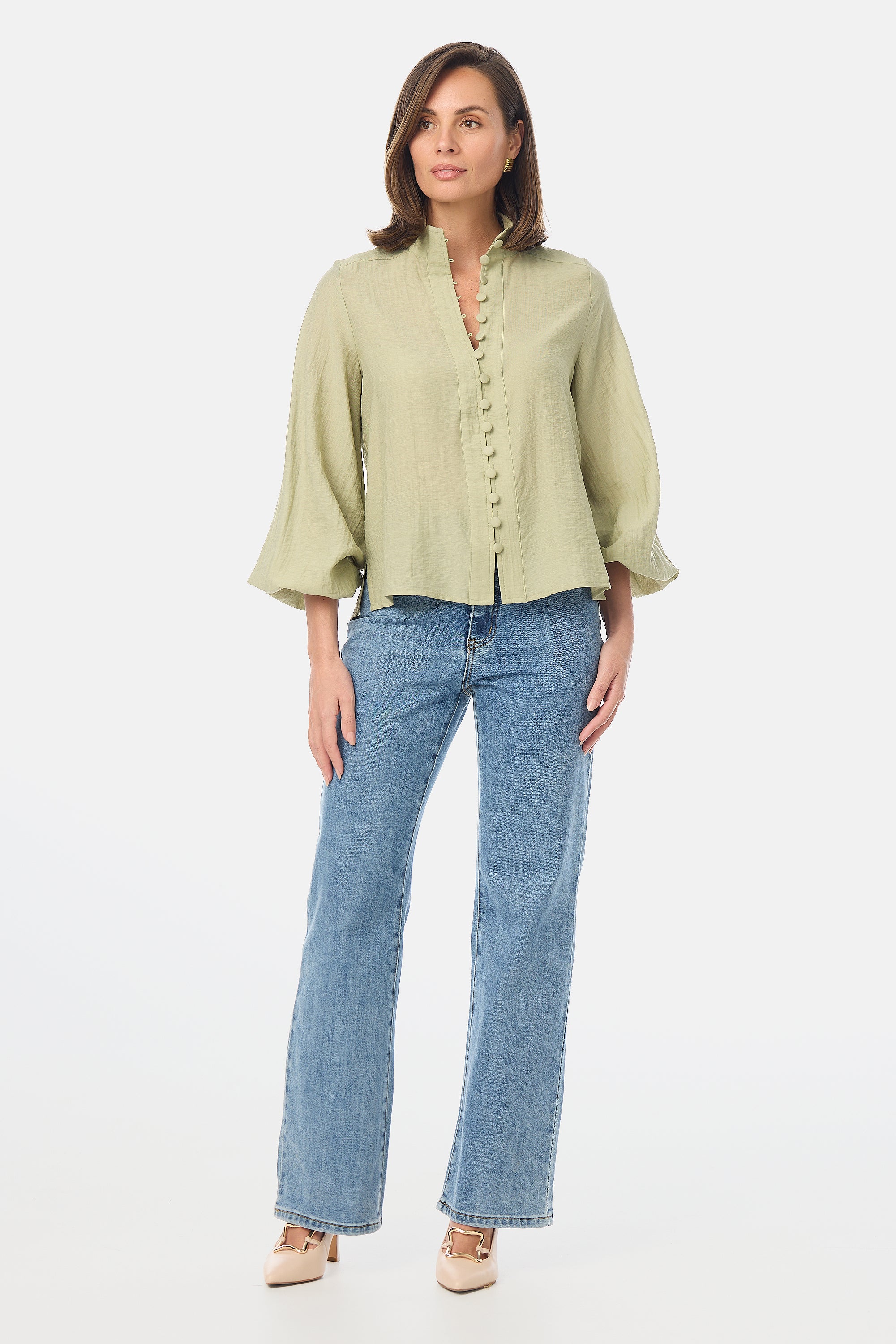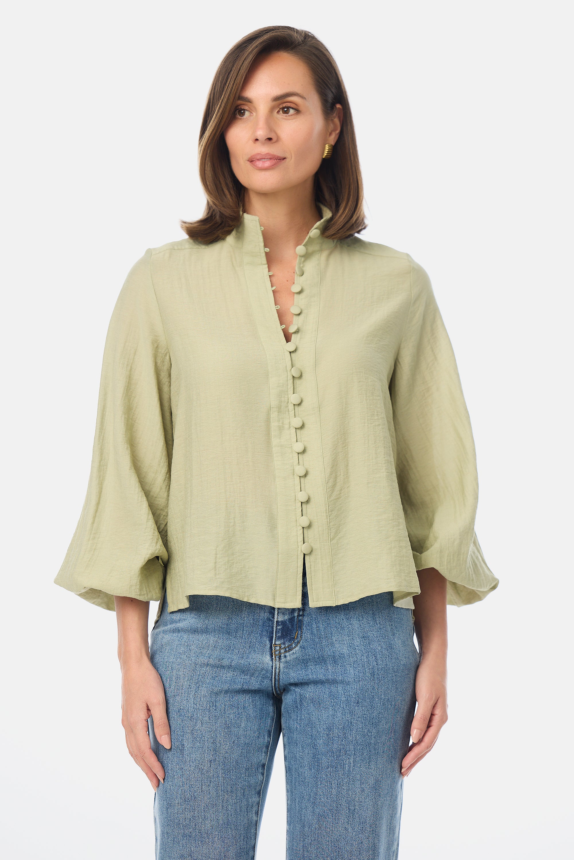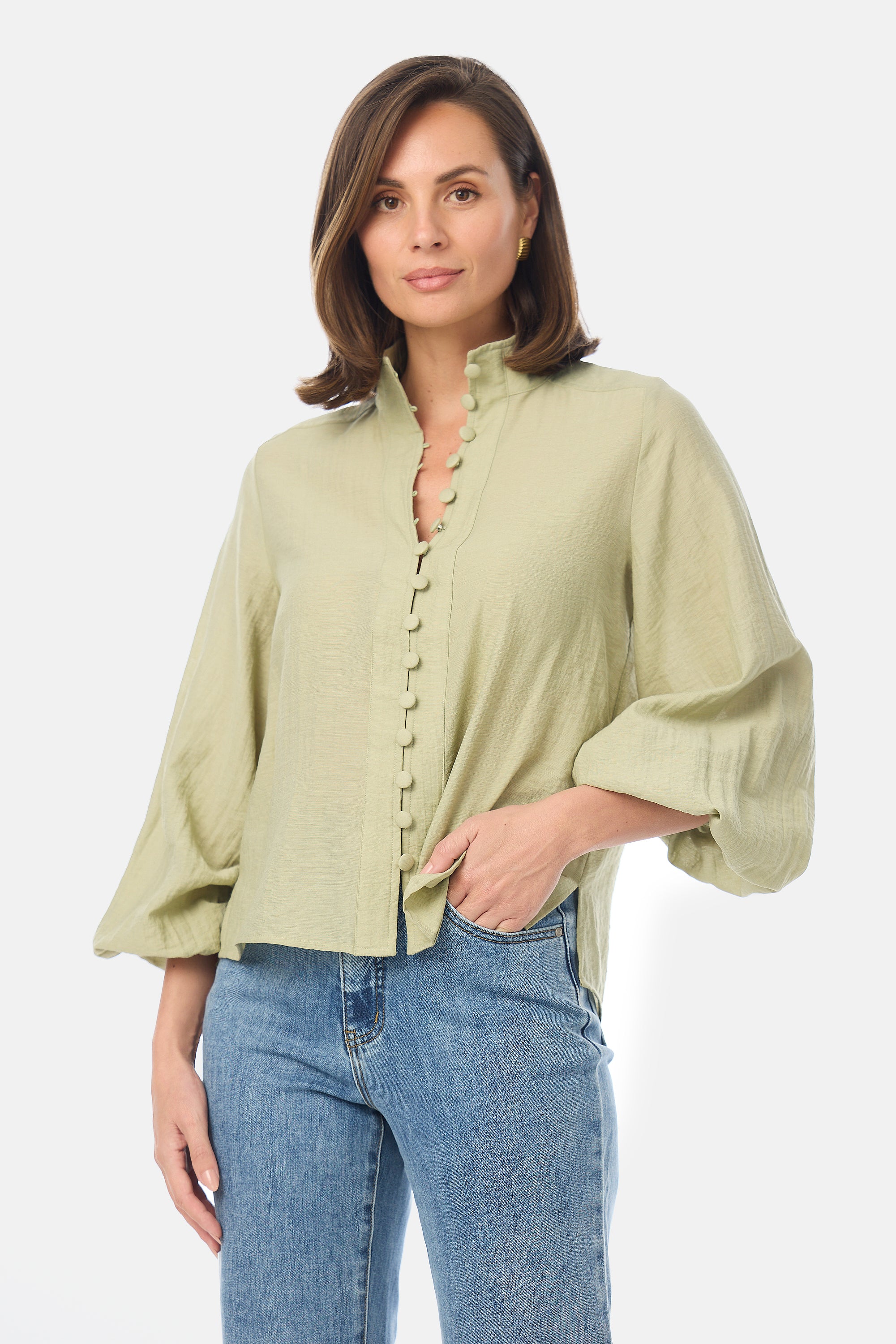 Softly structured with thoughtful detail, the Gathered Sleeve Shirt in Sage is crafted from a breathable textured linen blend. Its relaxed shape and voluminous sleeves deliver day-long comfort, while the side hem splits offer movement and polish.
