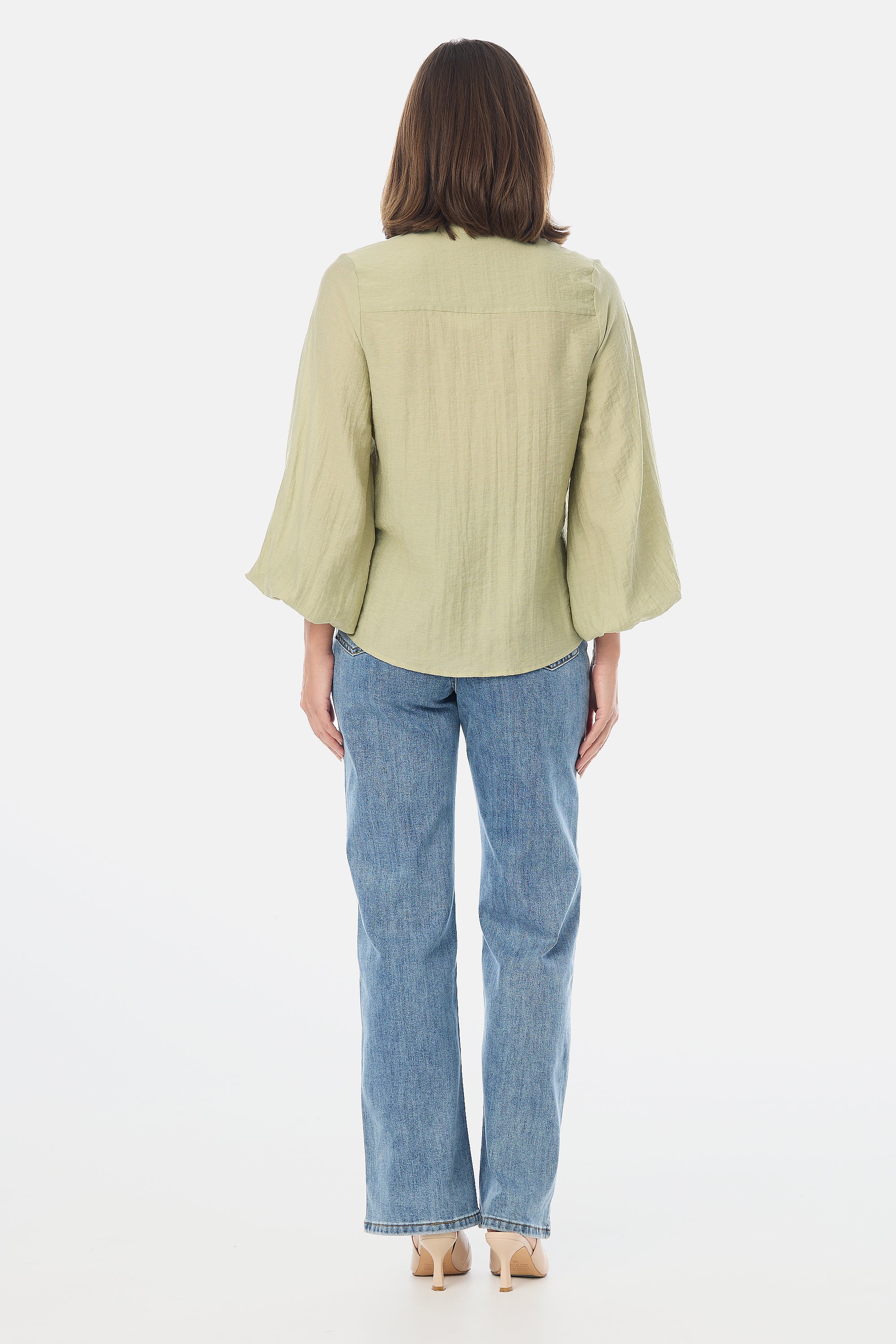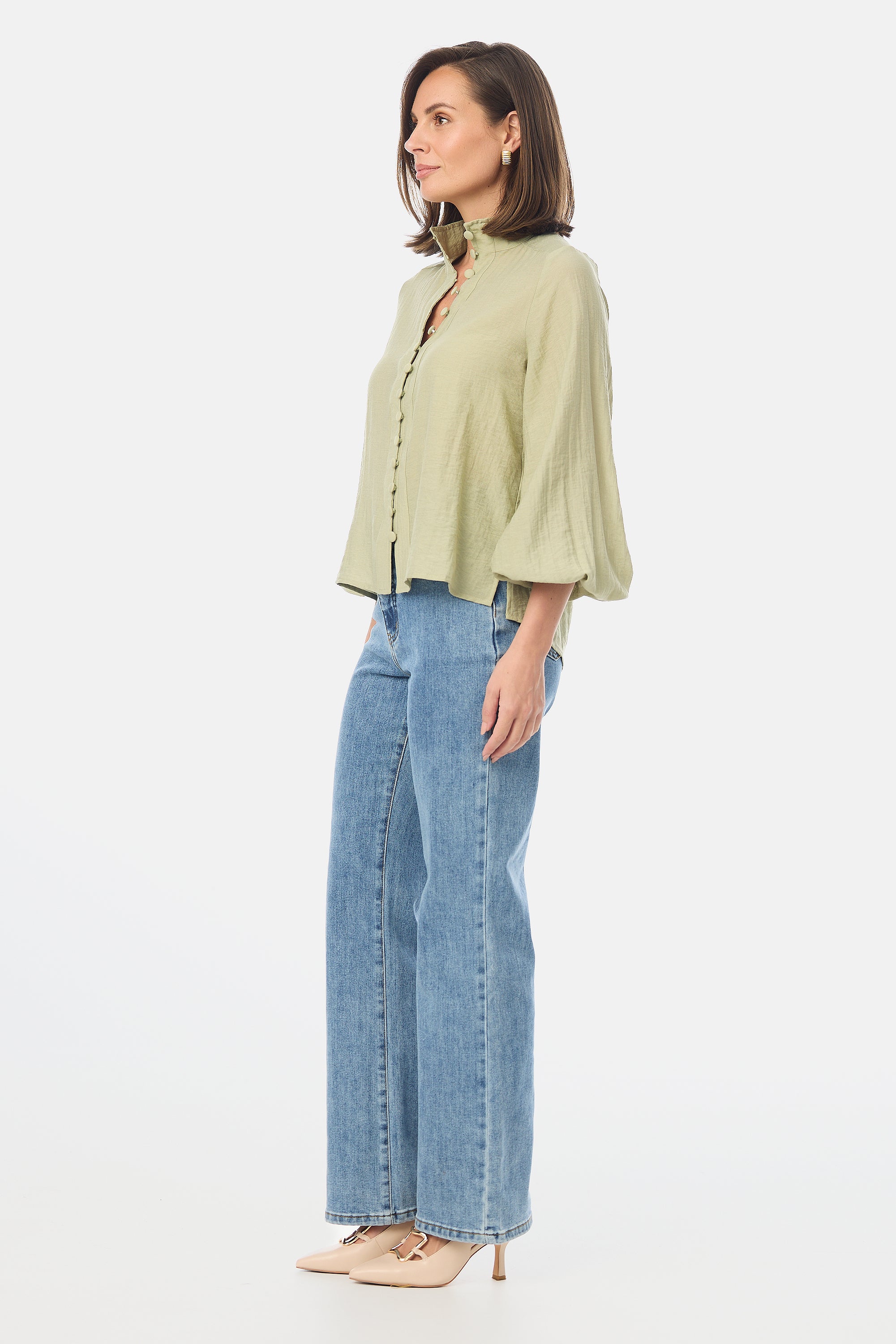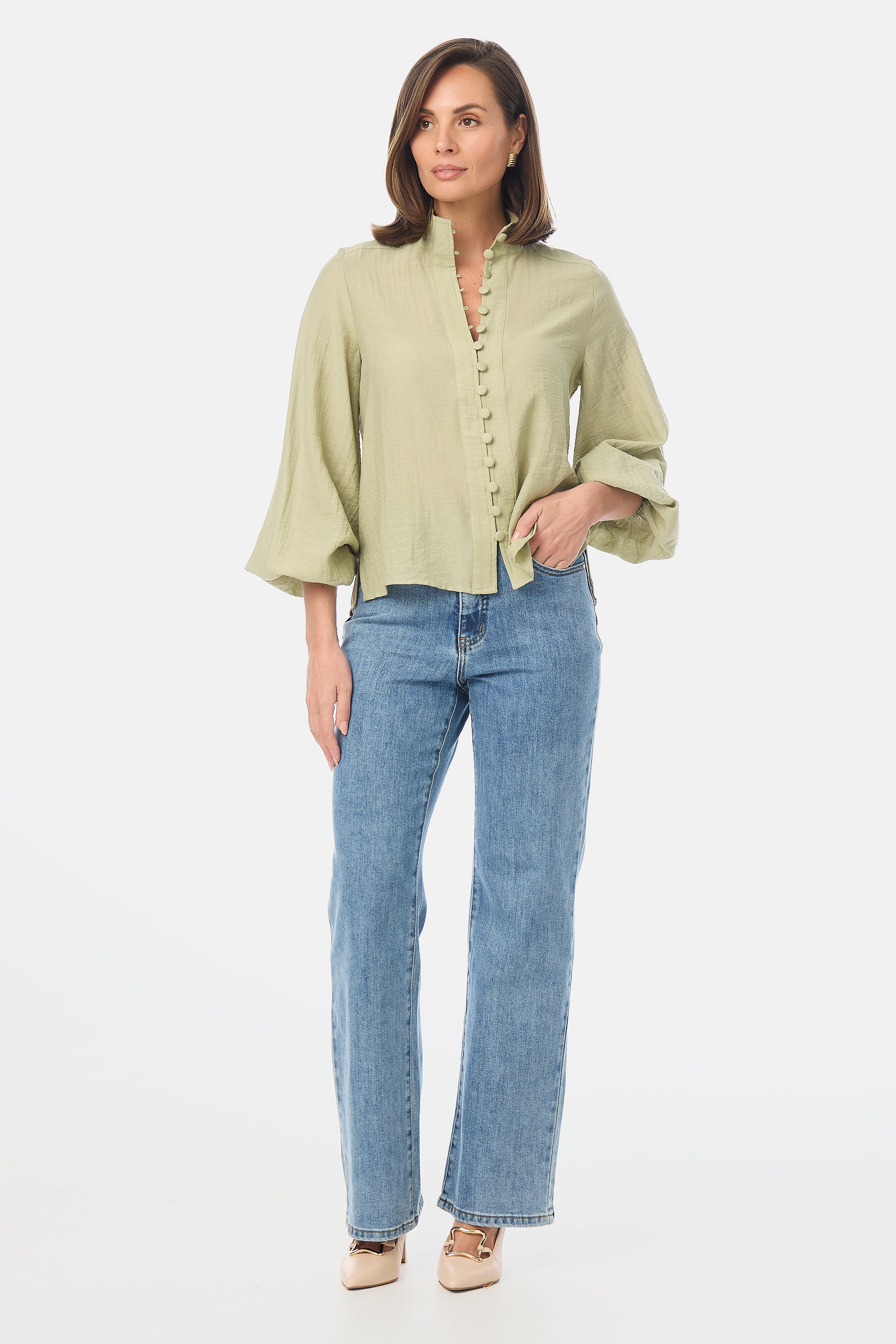 Softly structured with thoughtful detail, the Gathered Sleeve Shirt in Sage is crafted from a breathable textured linen blend. Its relaxed shape and voluminous sleeves deliver day-long comfort, while the side hem splits offer movement and polish.