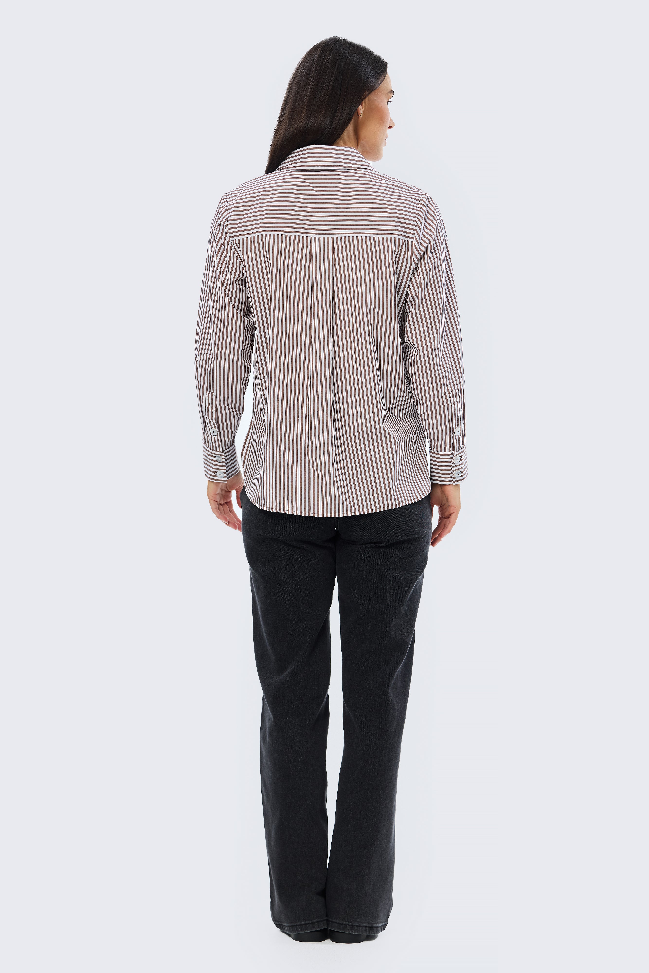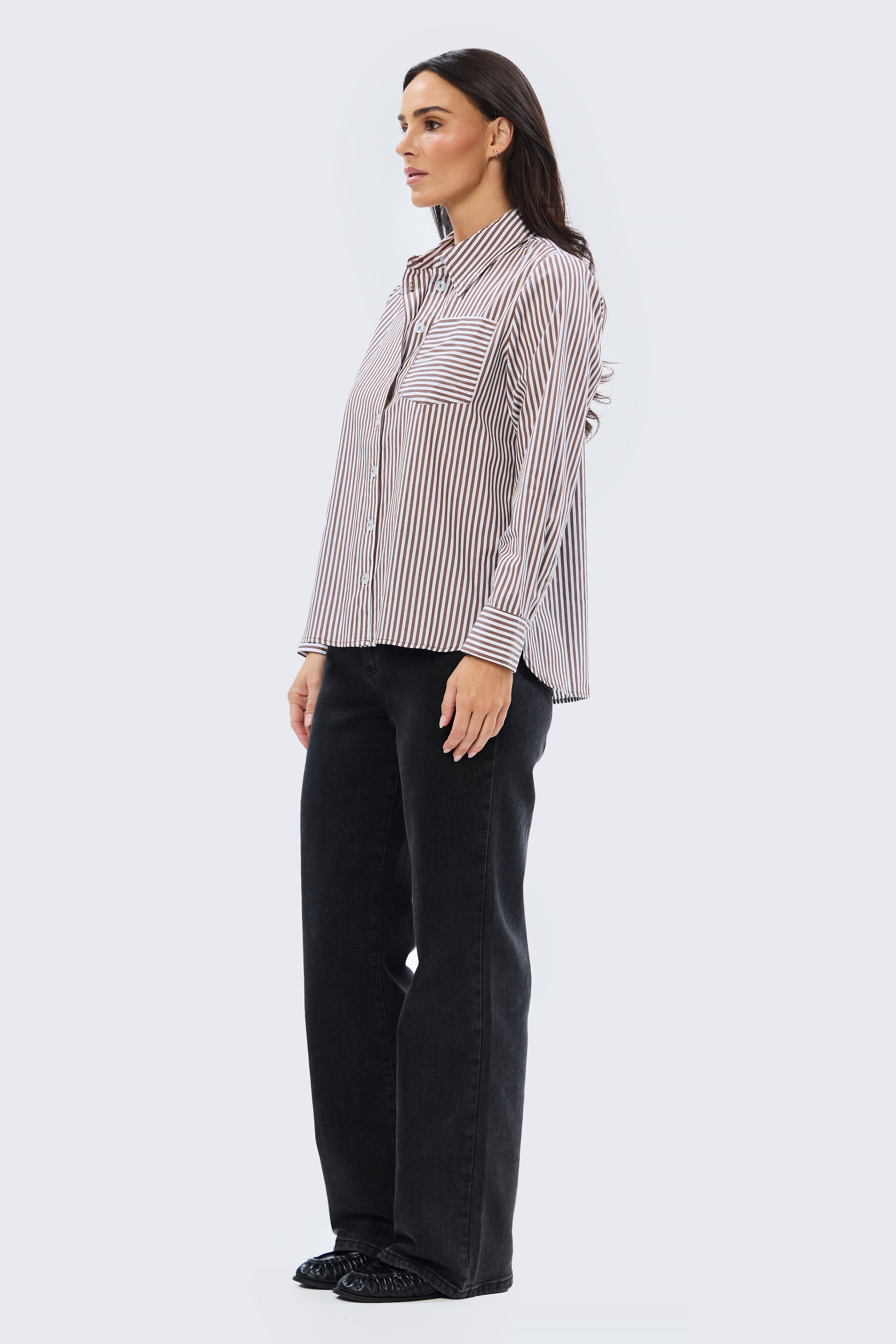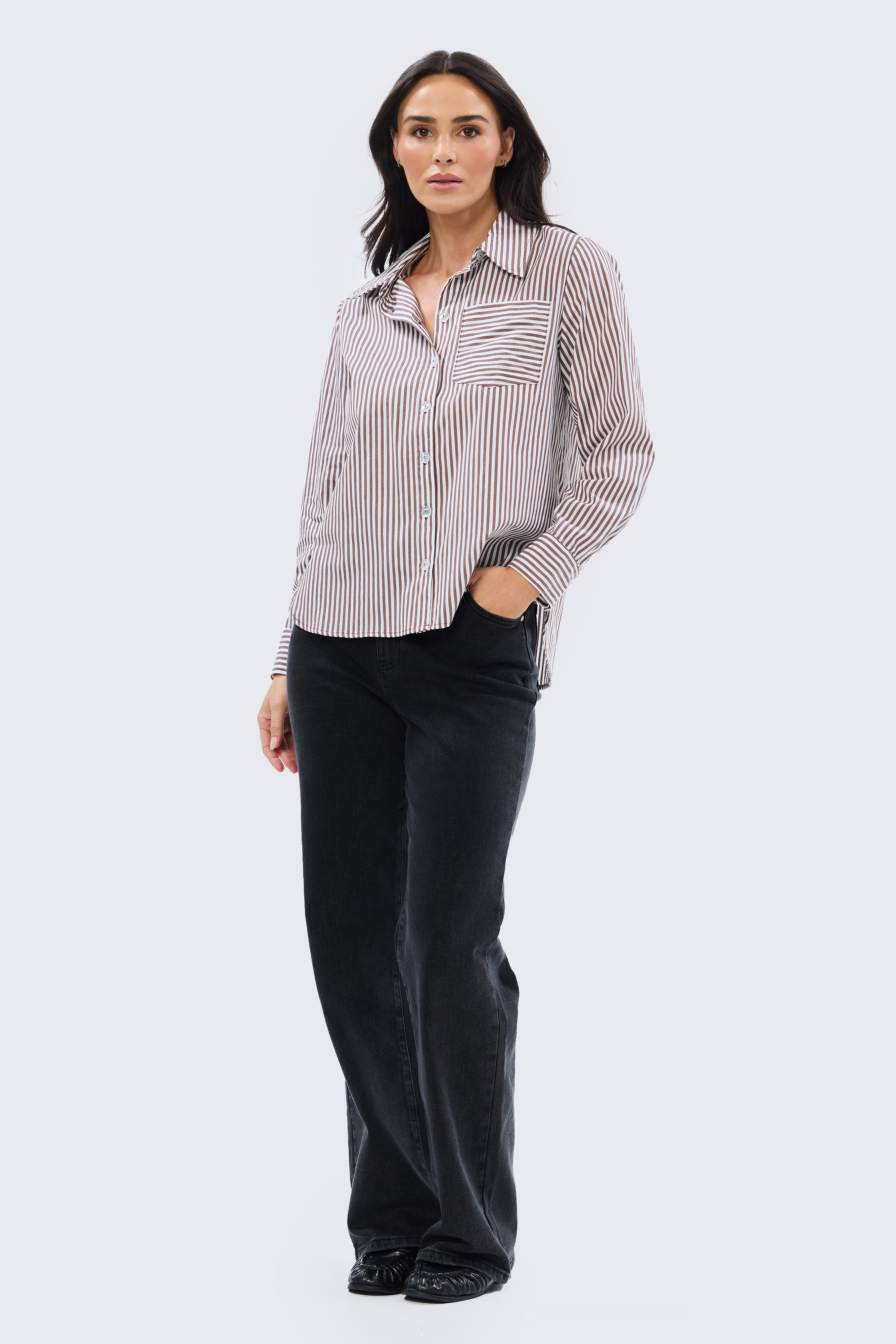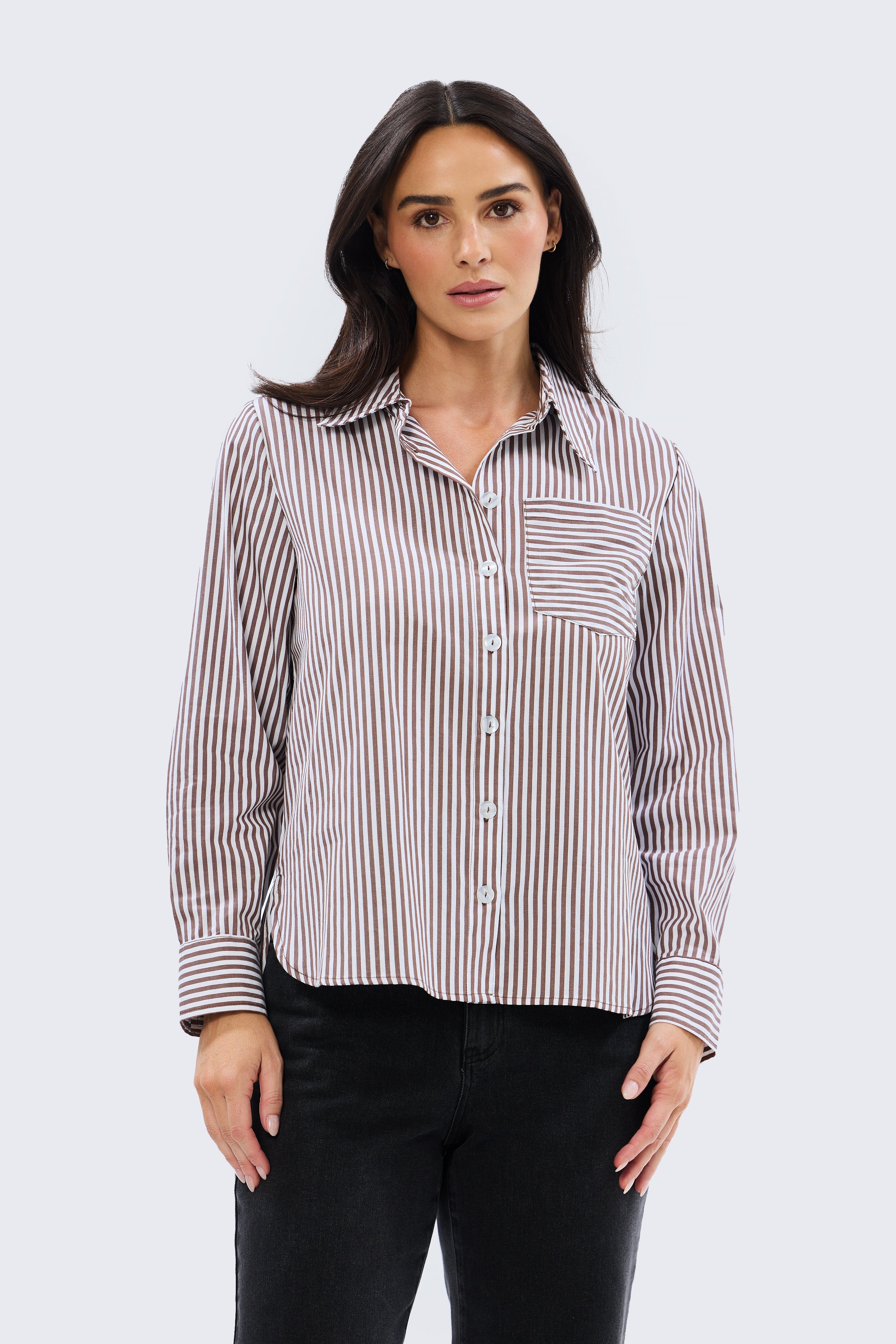 The Pocket Shirt in Dark Chocolate/White Stripe is a versatile wardrobe staple cut in a relaxed fit. Crafted from mid-weight cotton, it features a collared neckline, full-length sleeves with buttoned cuffs, and a patch pocket for subtle detailing. Finished with a curved hem and side splits, it pairs effortlessly with denim or layered under knits and jackets for everyday wear.
