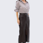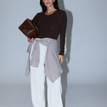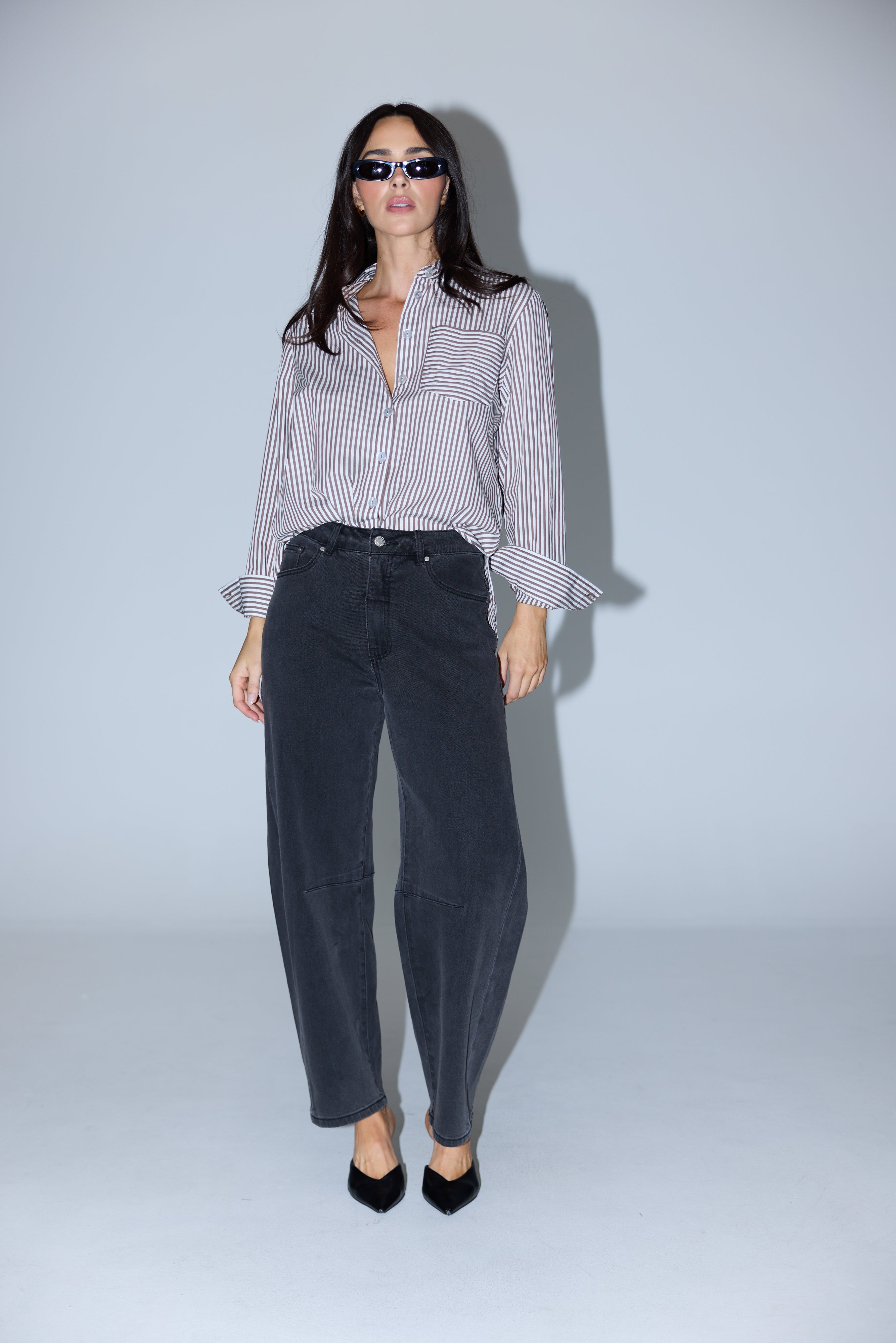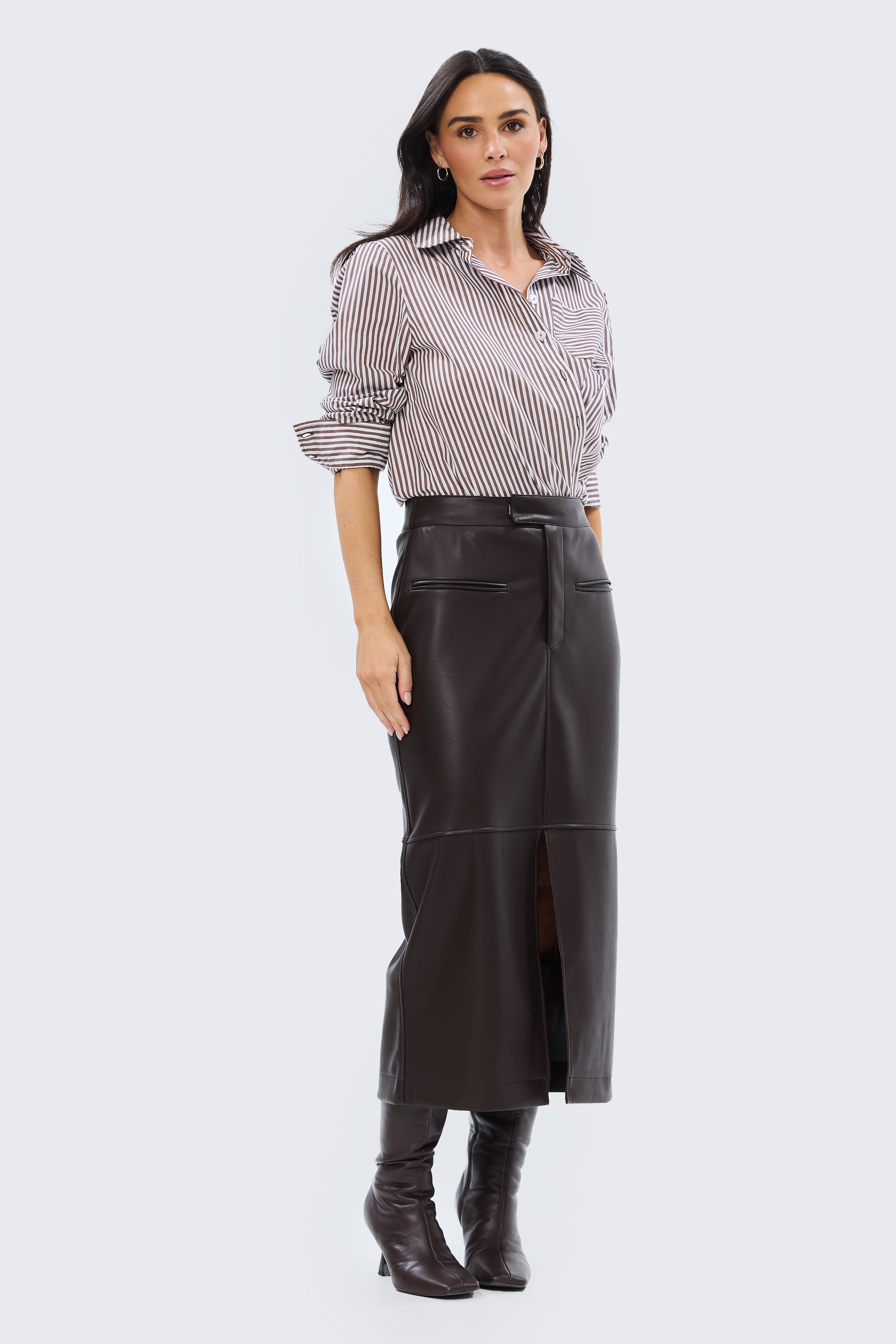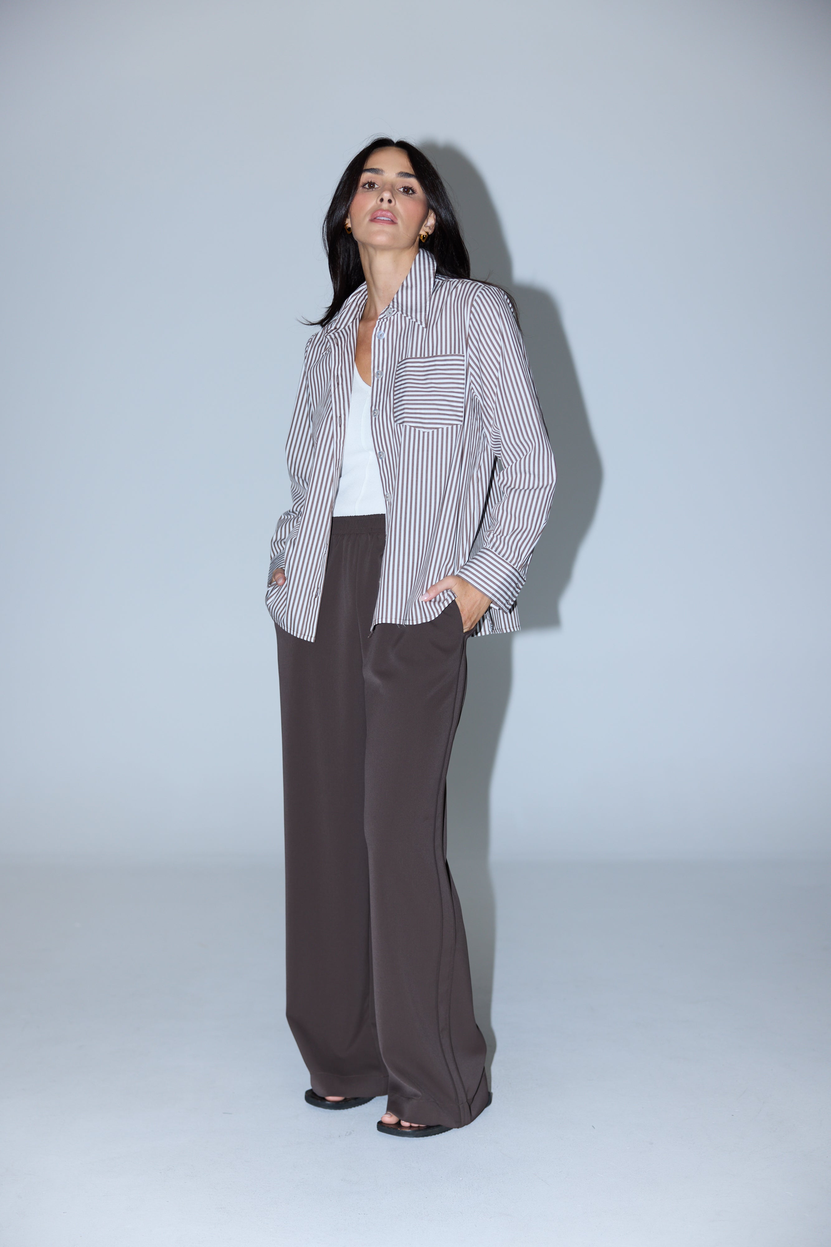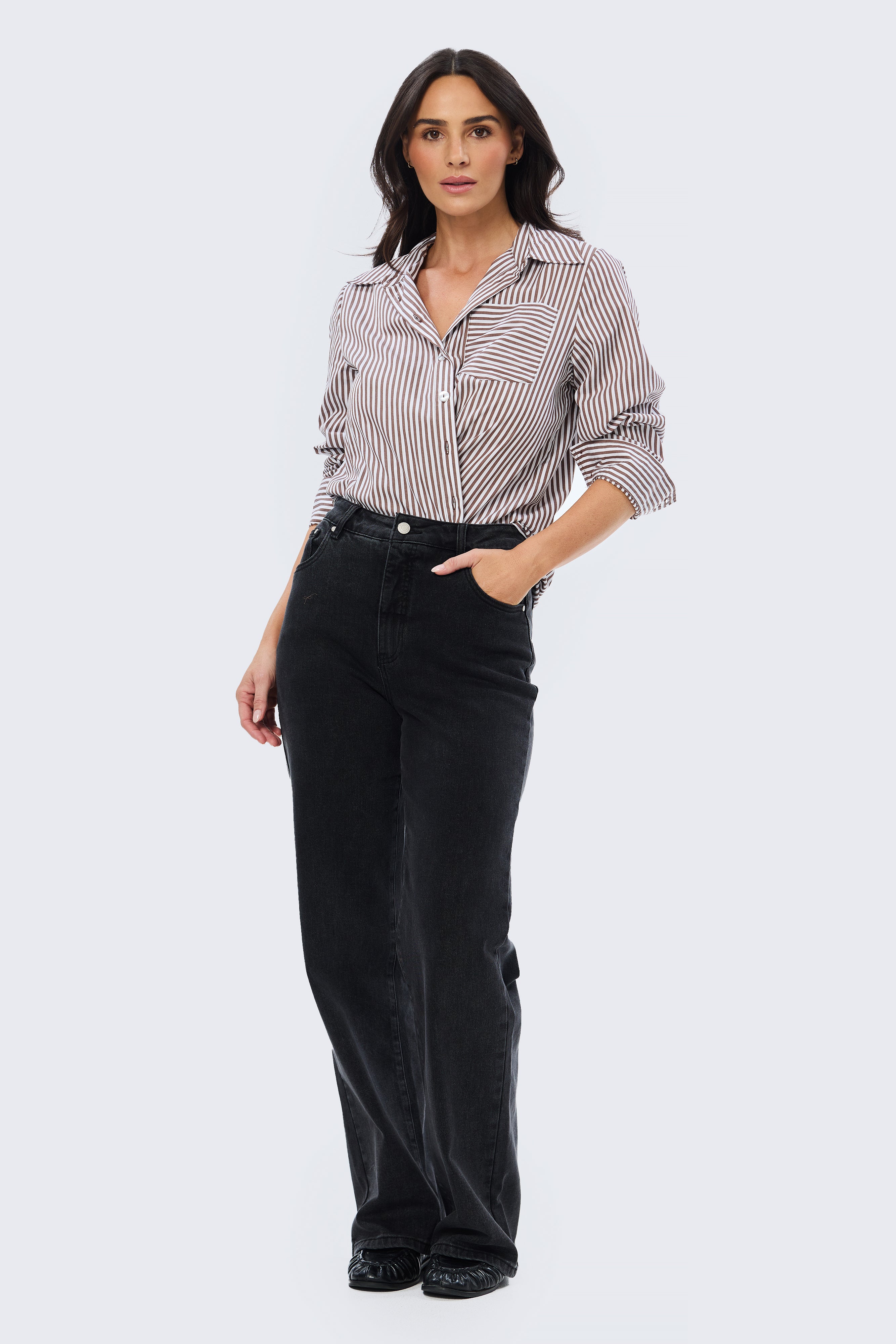 The Pocket Shirt in Dark Chocolate/White Stripe is a versatile wardrobe staple cut in a relaxed fit. Crafted from mid-weight cotton, it features a collared neckline, full-length sleeves with buttoned cuffs, and a patch pocket for subtle detailing. Finished with a curved hem and side splits, it pairs effortlessly with denim or layered under knits and jackets for everyday wear.