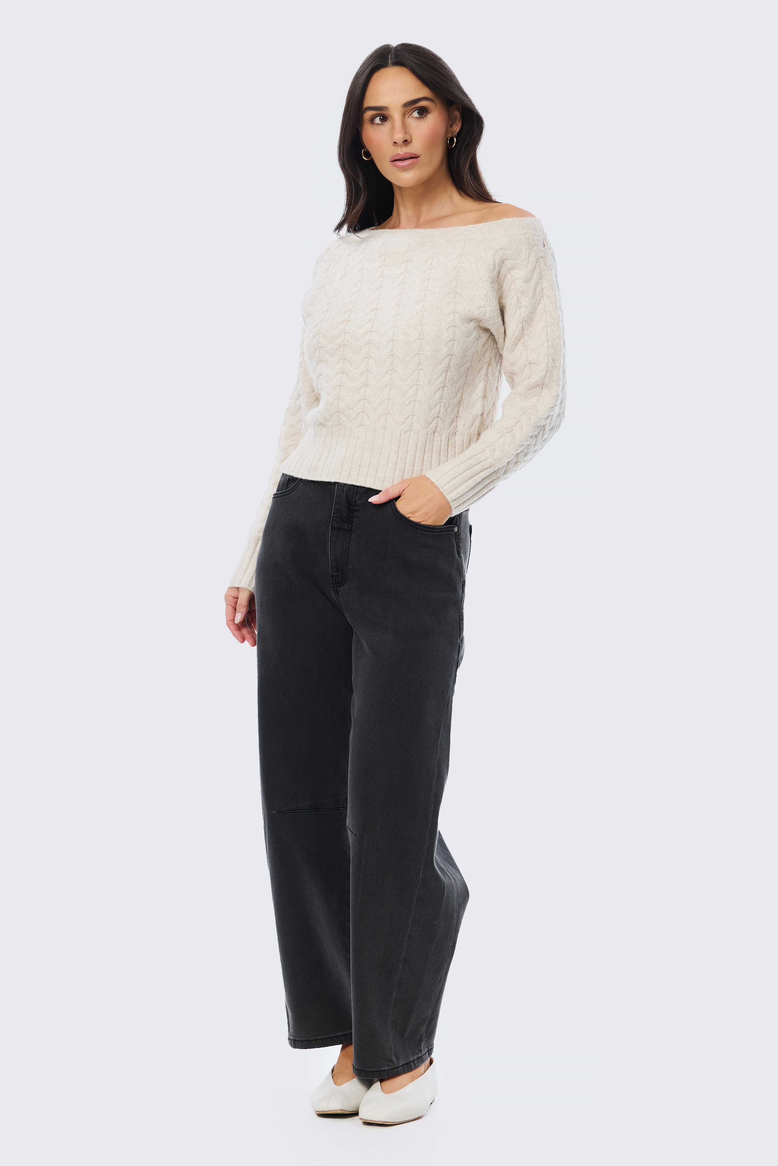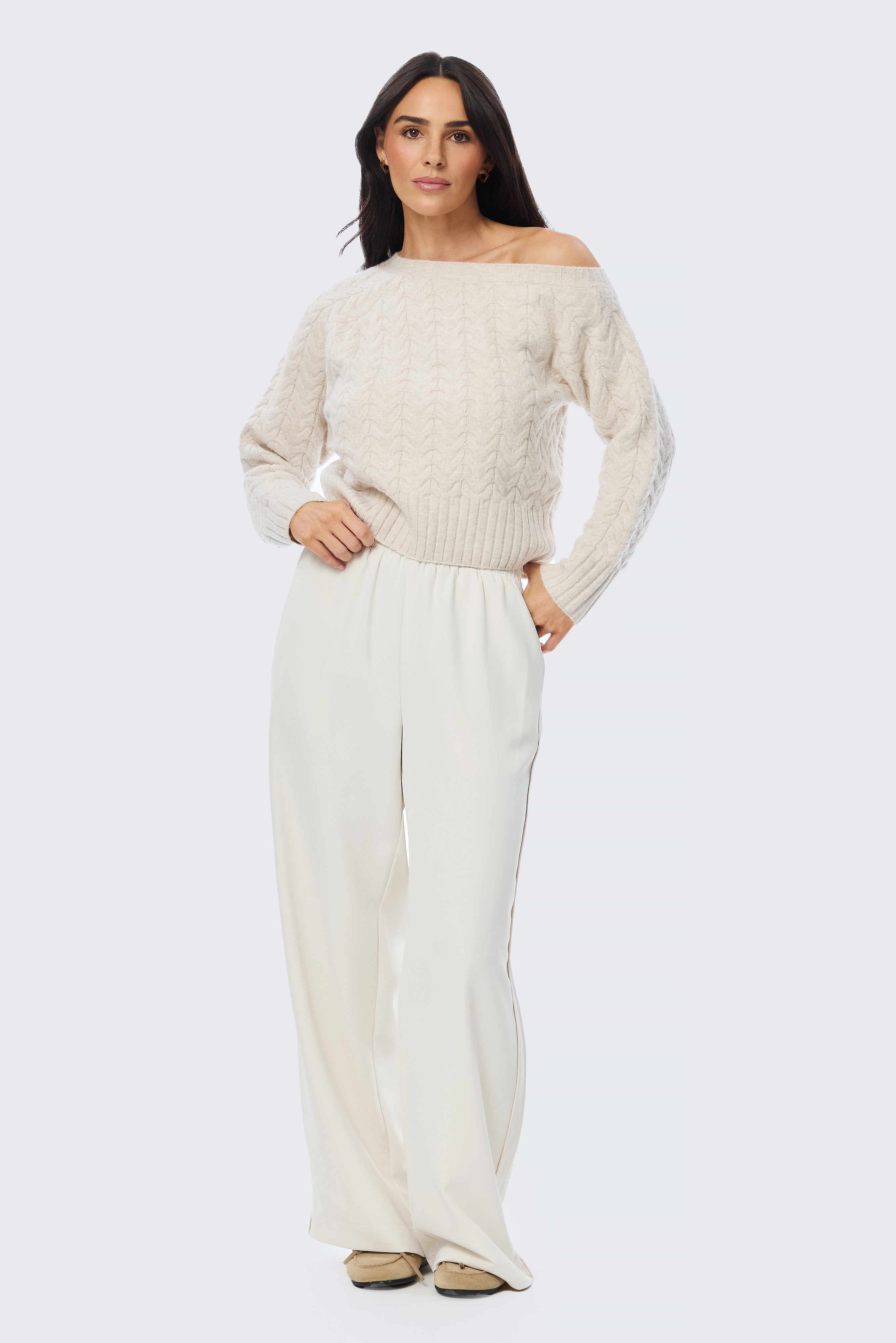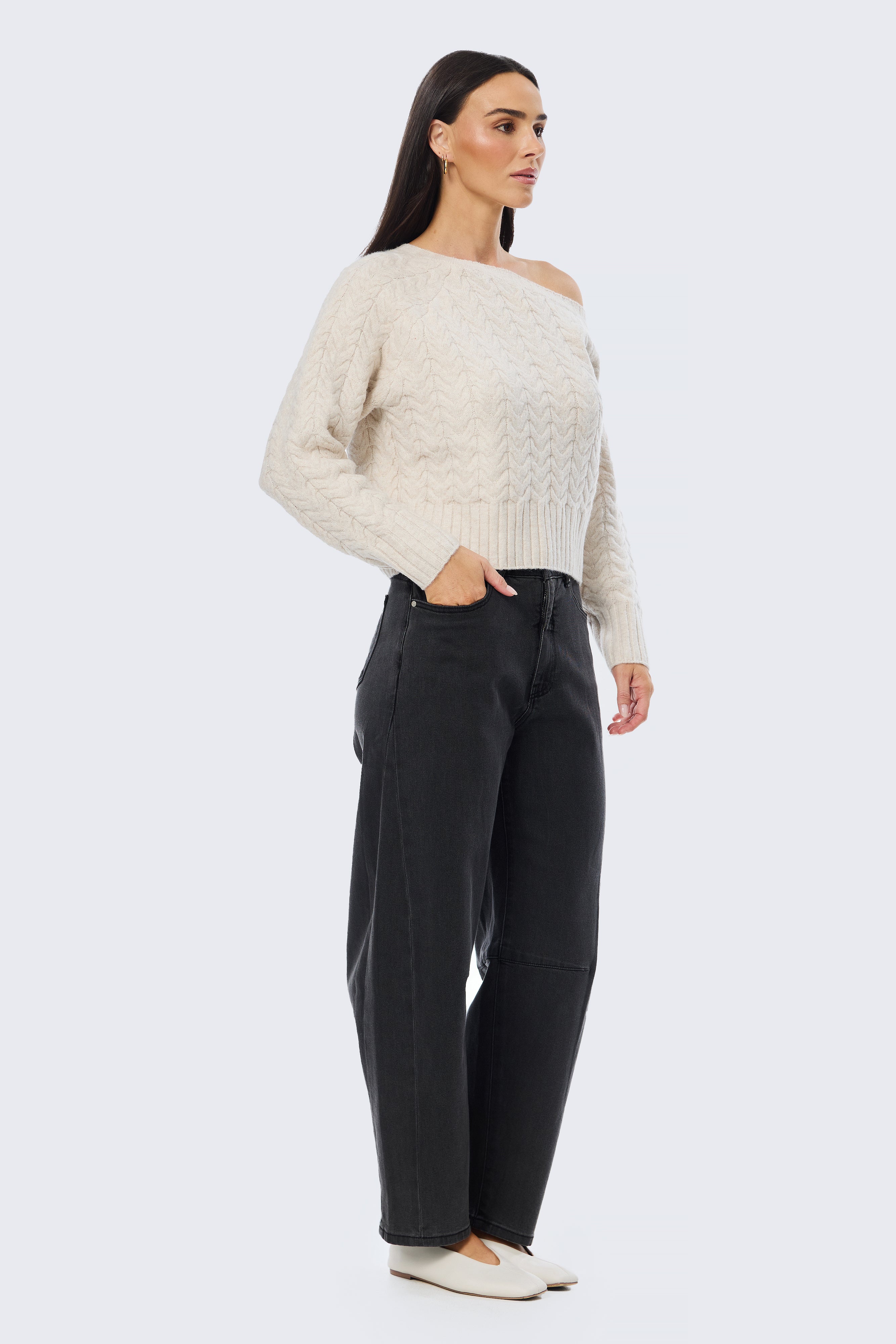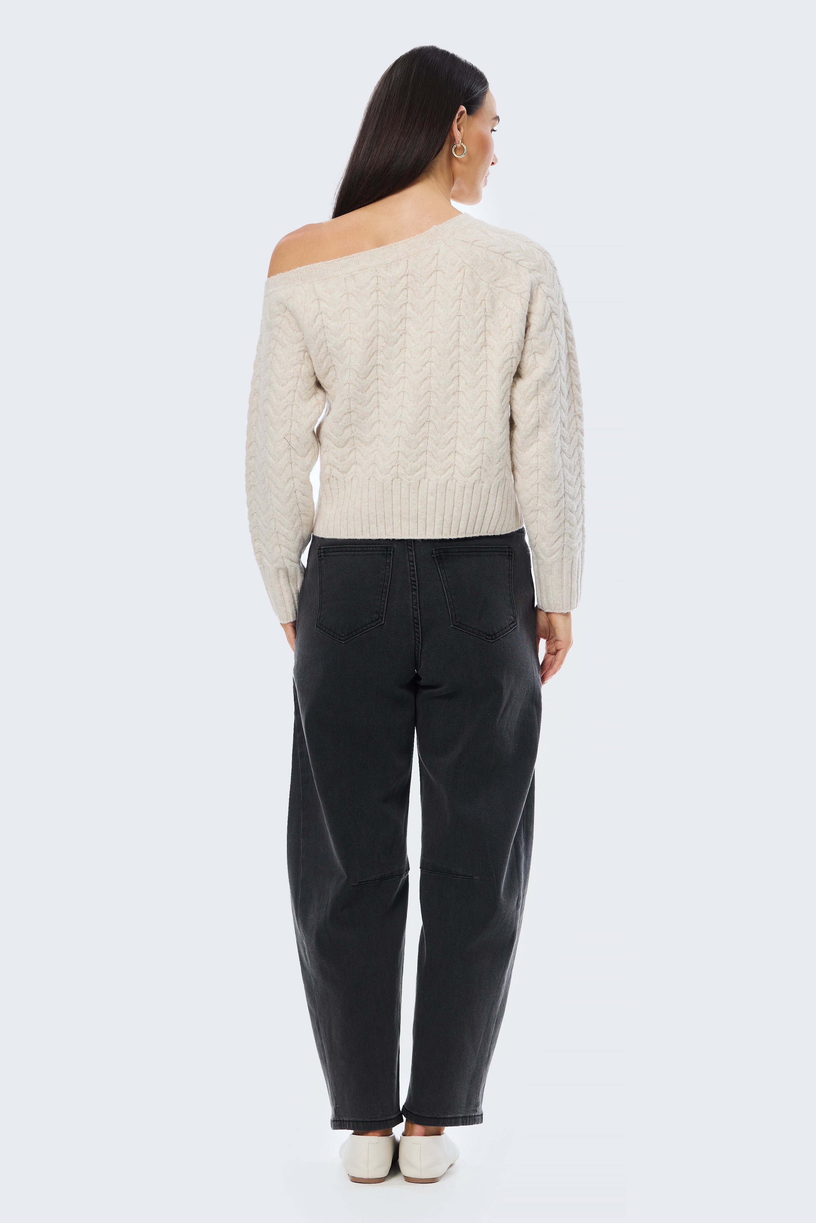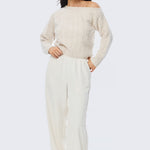 The Asymmetric Cable Knit Jumper in Ecru offers a modern take on classic knitwear. Designed with a one-shoulder neckline and a relaxed silhouette, it’s crafted from a soft cable knit that feels cosy yet refined. Featuring full-length sleeves with ribbed cuffs and a mid-length fit, it’s an effortless piece made for elevated everyday dressing.