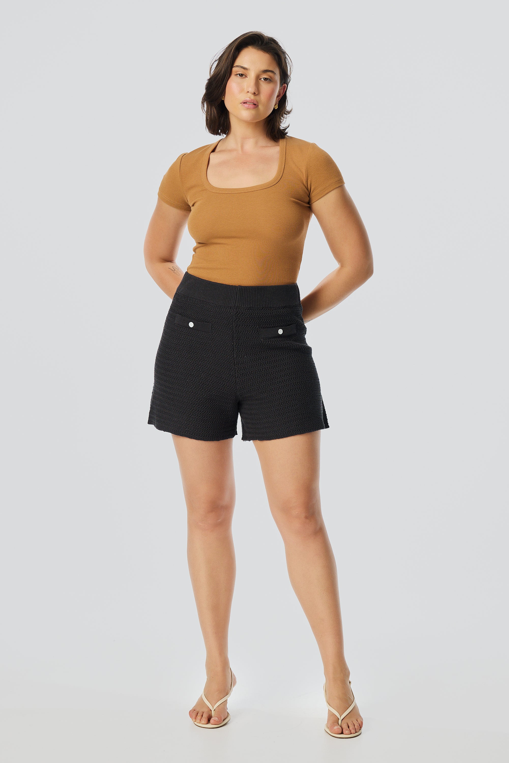 Easy and elevated, the Crochet Shorts in Ink Black are crafted from a mid-weight crochet knit with a softly structured feel. Designed with an elasticated waistband and full lining for comfort, they offer a clean, modern look. A versatile warm-weather staple that pairs effortlessly with any tank or the Matching Crochet Polo Top.