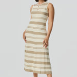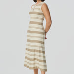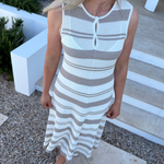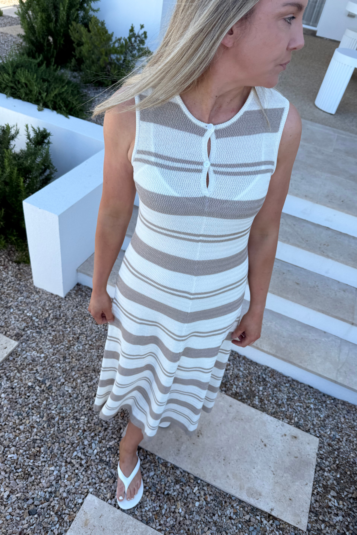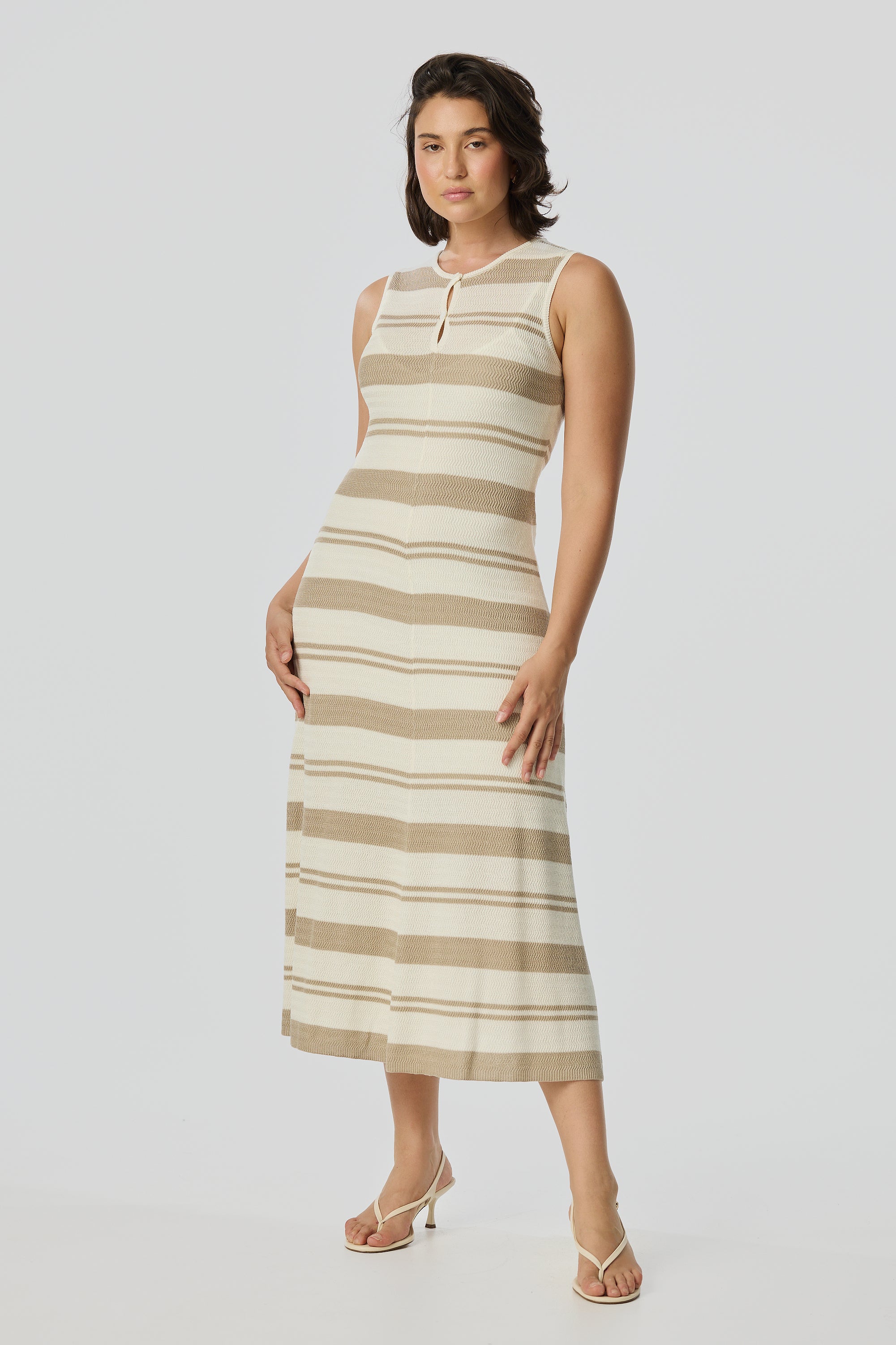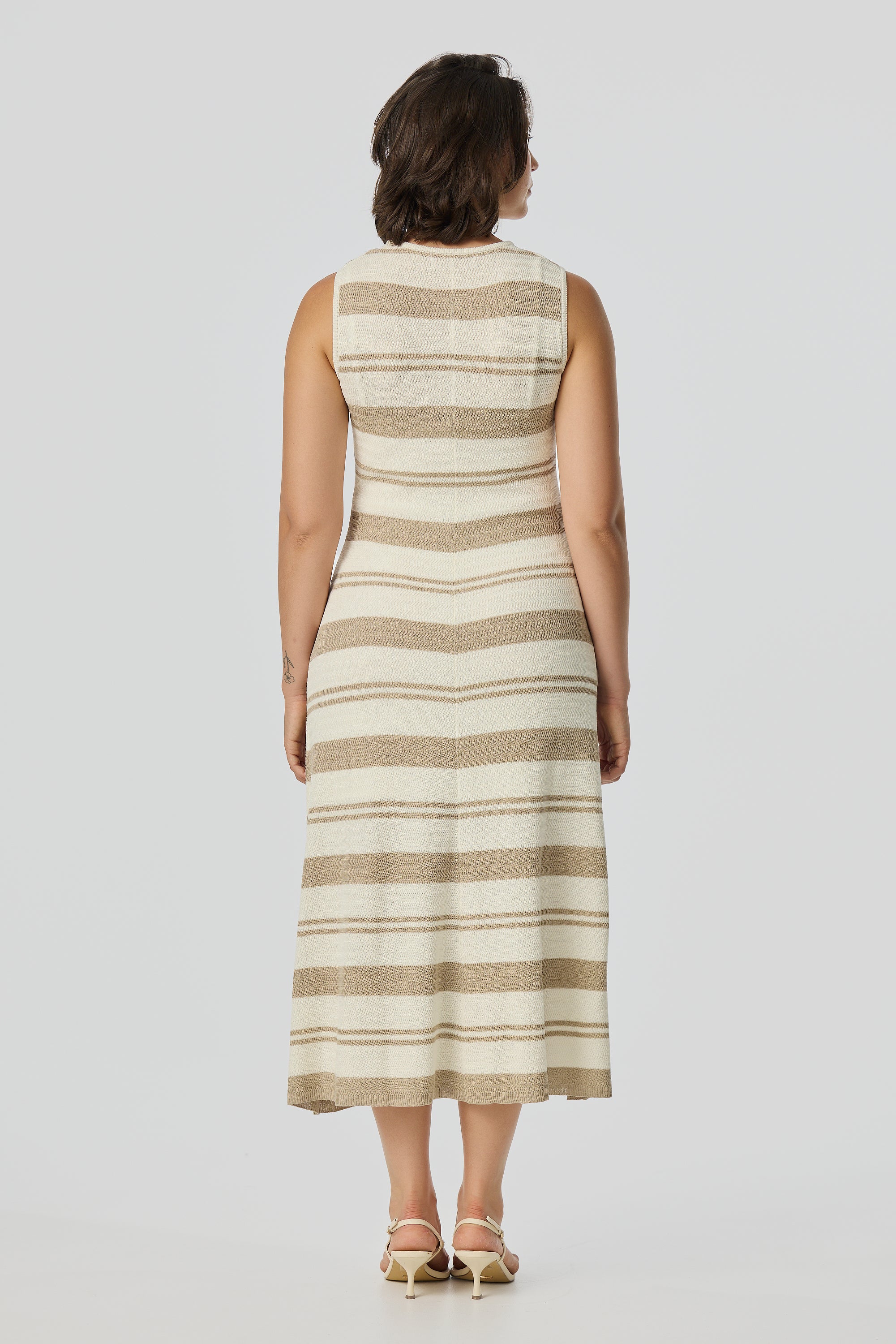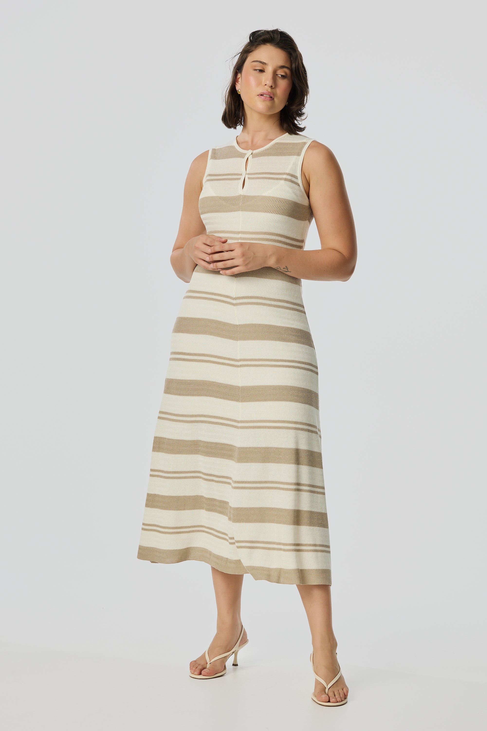 Effortlessly refined, the Crochet Sleeveless Dress in Wheat Stripe is crafted from a softly textured mid-weight crochet knit. Designed with a round neckline and subtle keyhole detail, it falls into an easy A-line silhouette. Finished with a detachable slip for comfortable coverage, it’s a versatile dress suited to both everyday wear and occasion dressing.