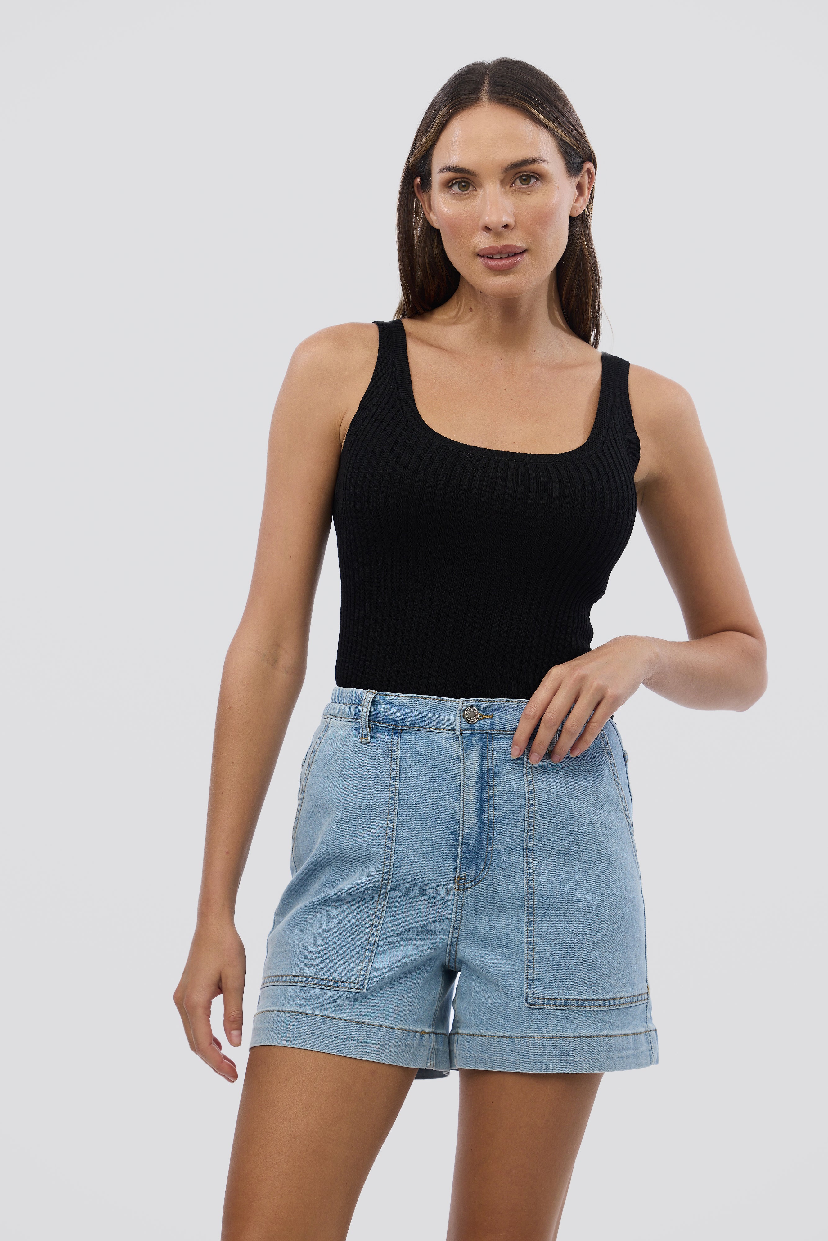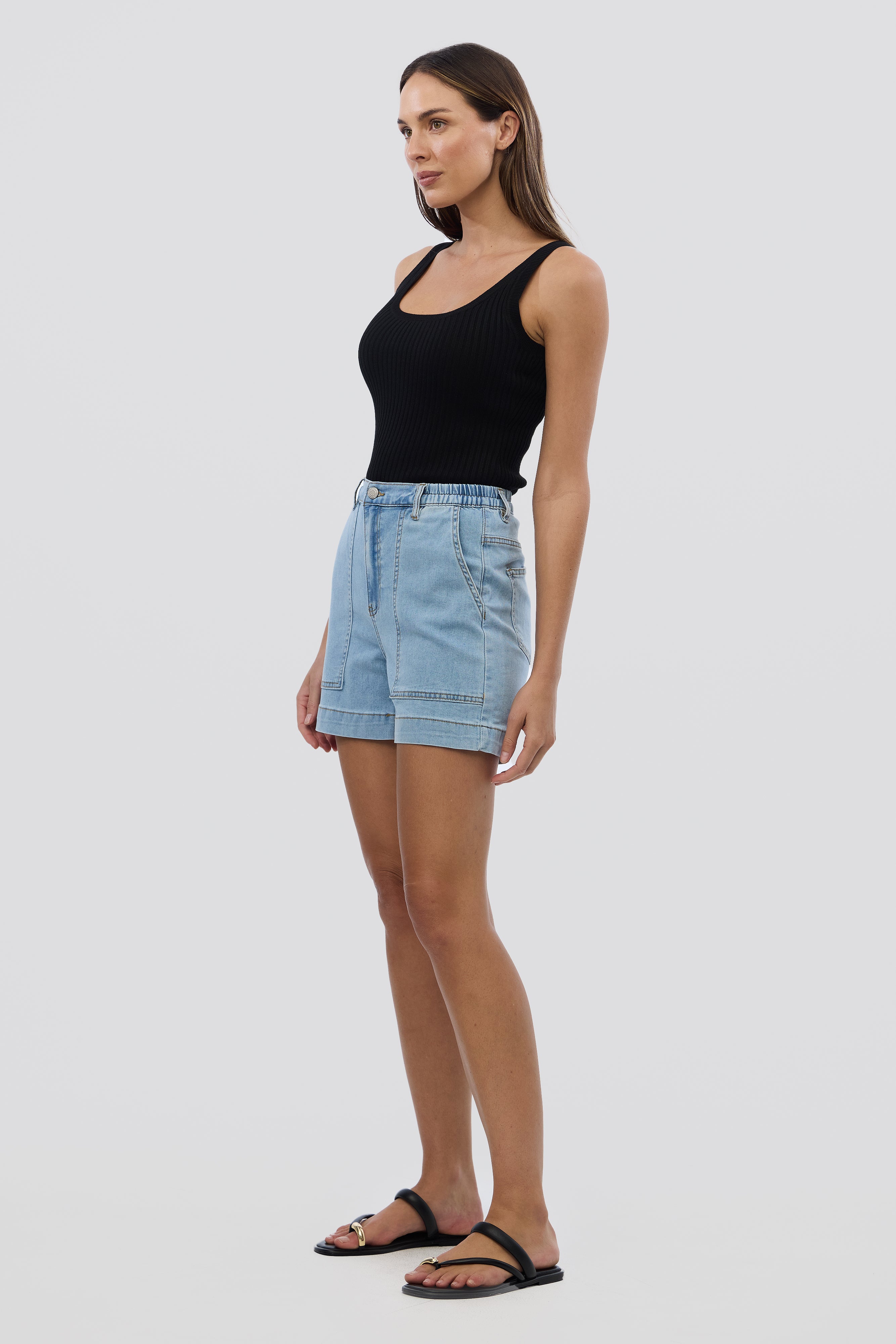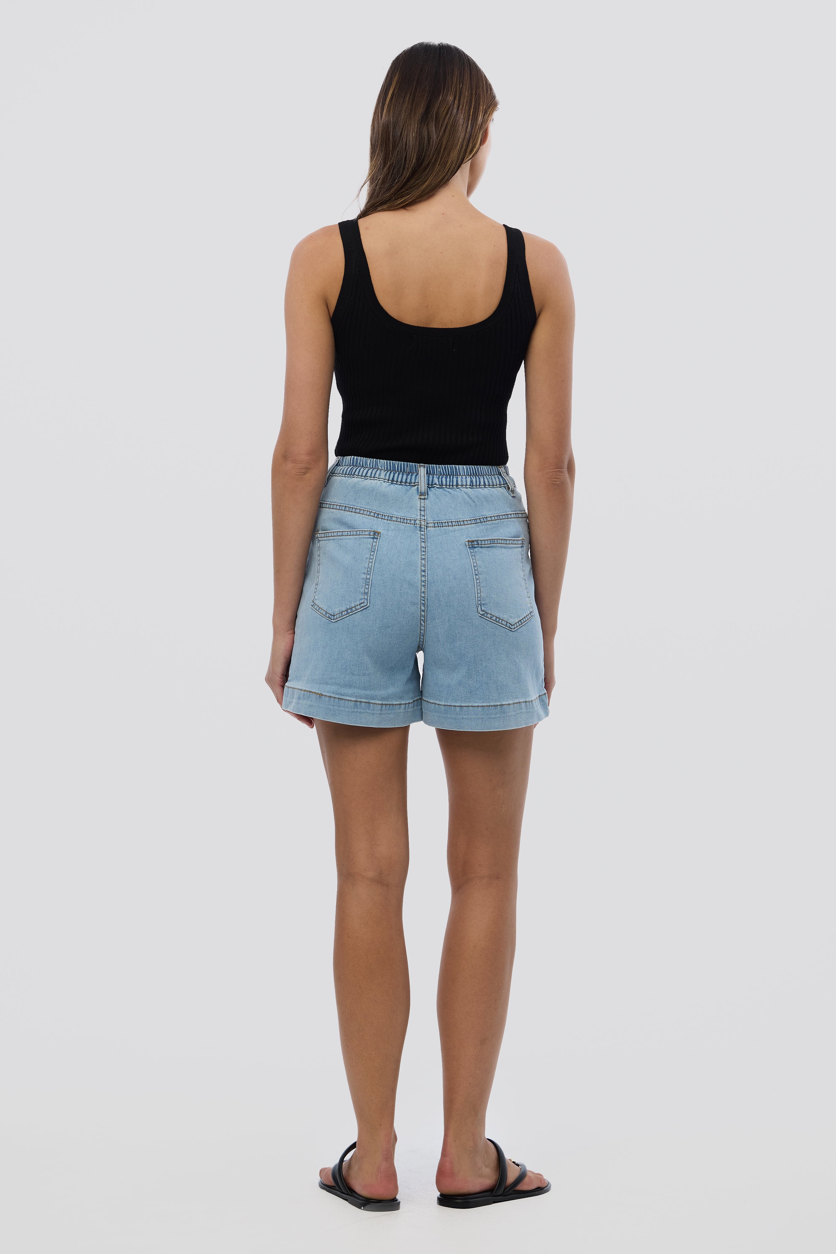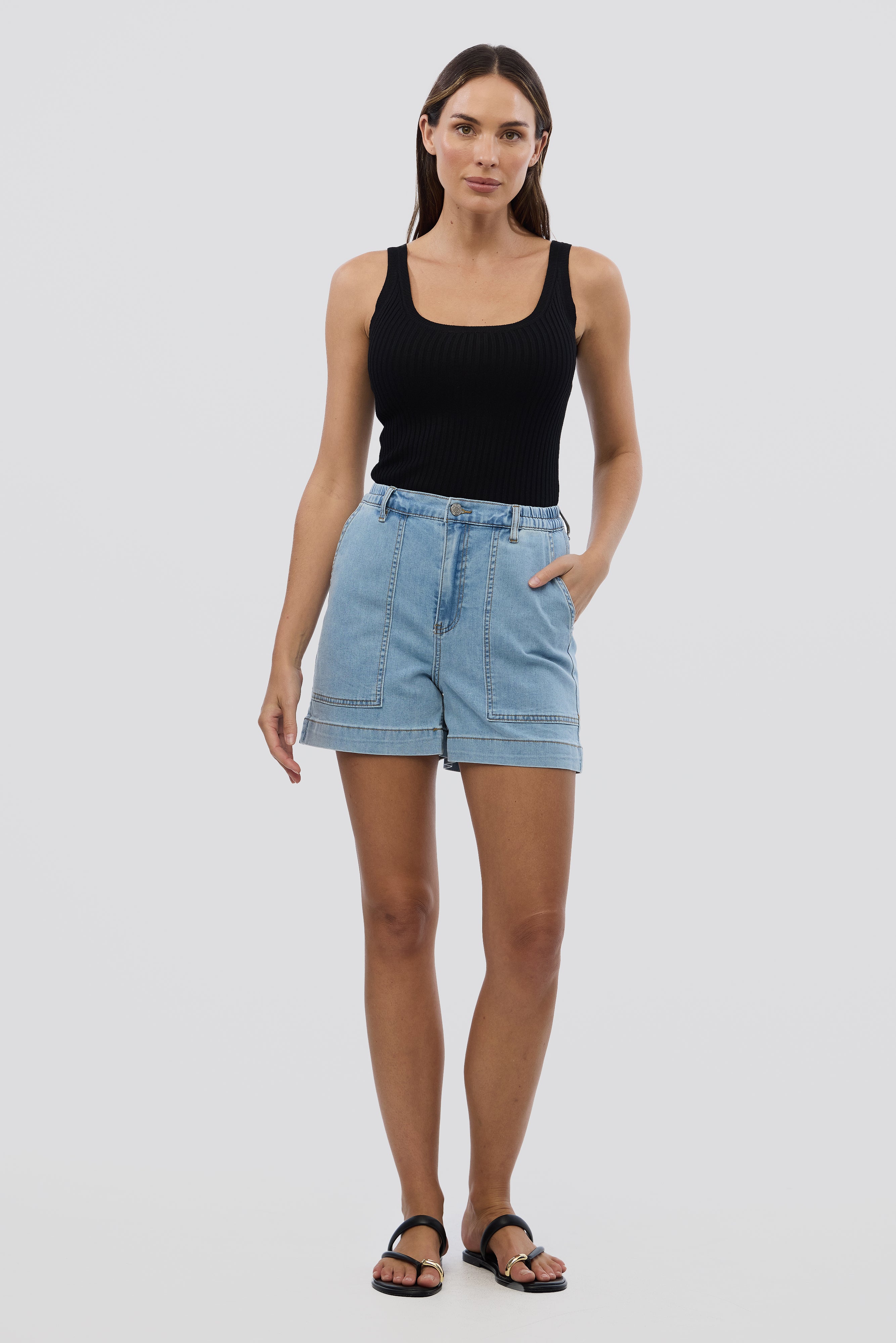 Laid-back yet polished, the Denim Patch Pocket Shorts in Light Blue Wash are designed for off-duty ease. With a wide-leg silhouette, functional patch pockets, and an elasticated waistband, they offer all-day comfort in a flattering high-waisted cut. Pair with the matching Denim Vest for an effortless look.