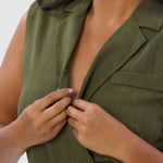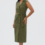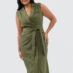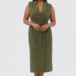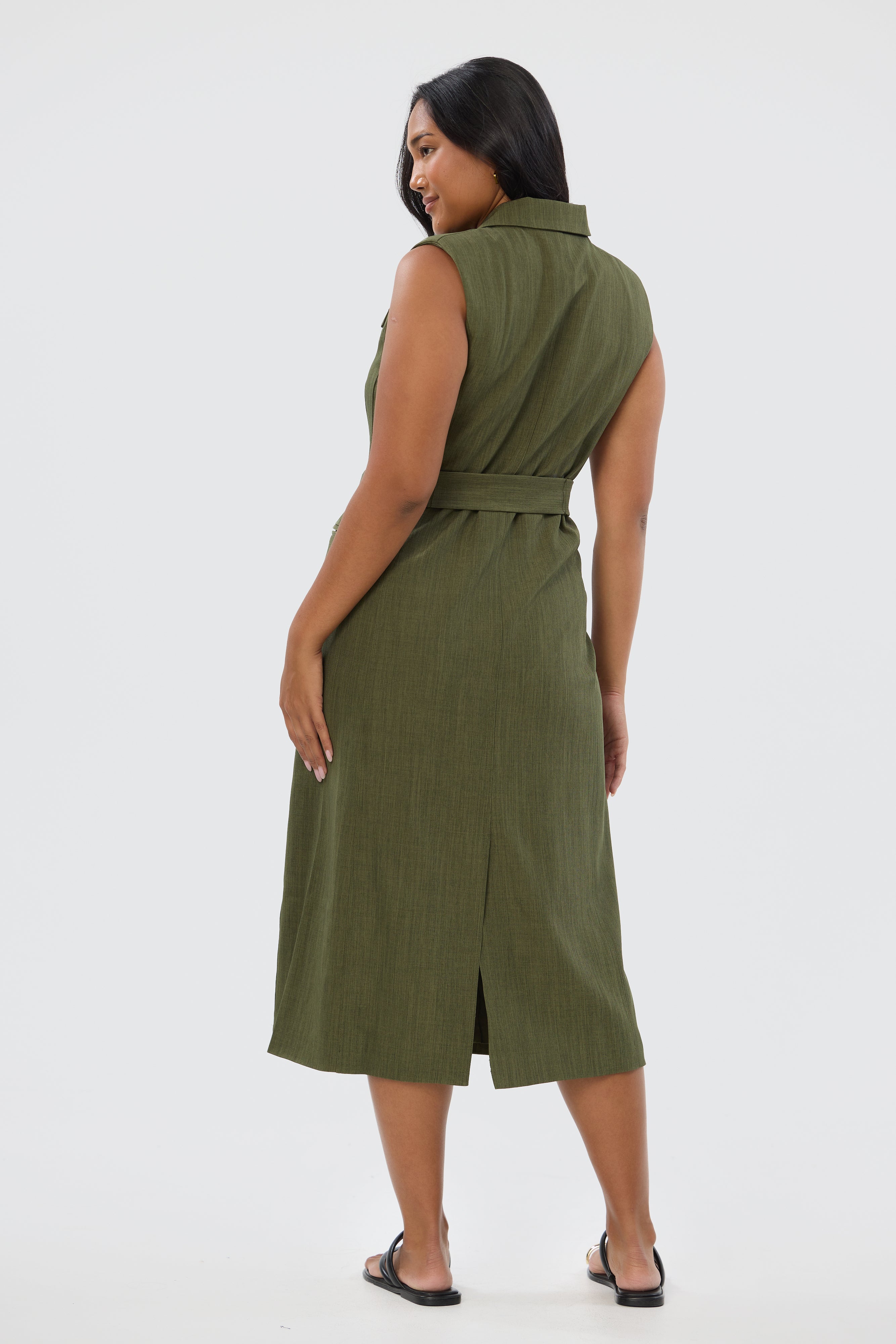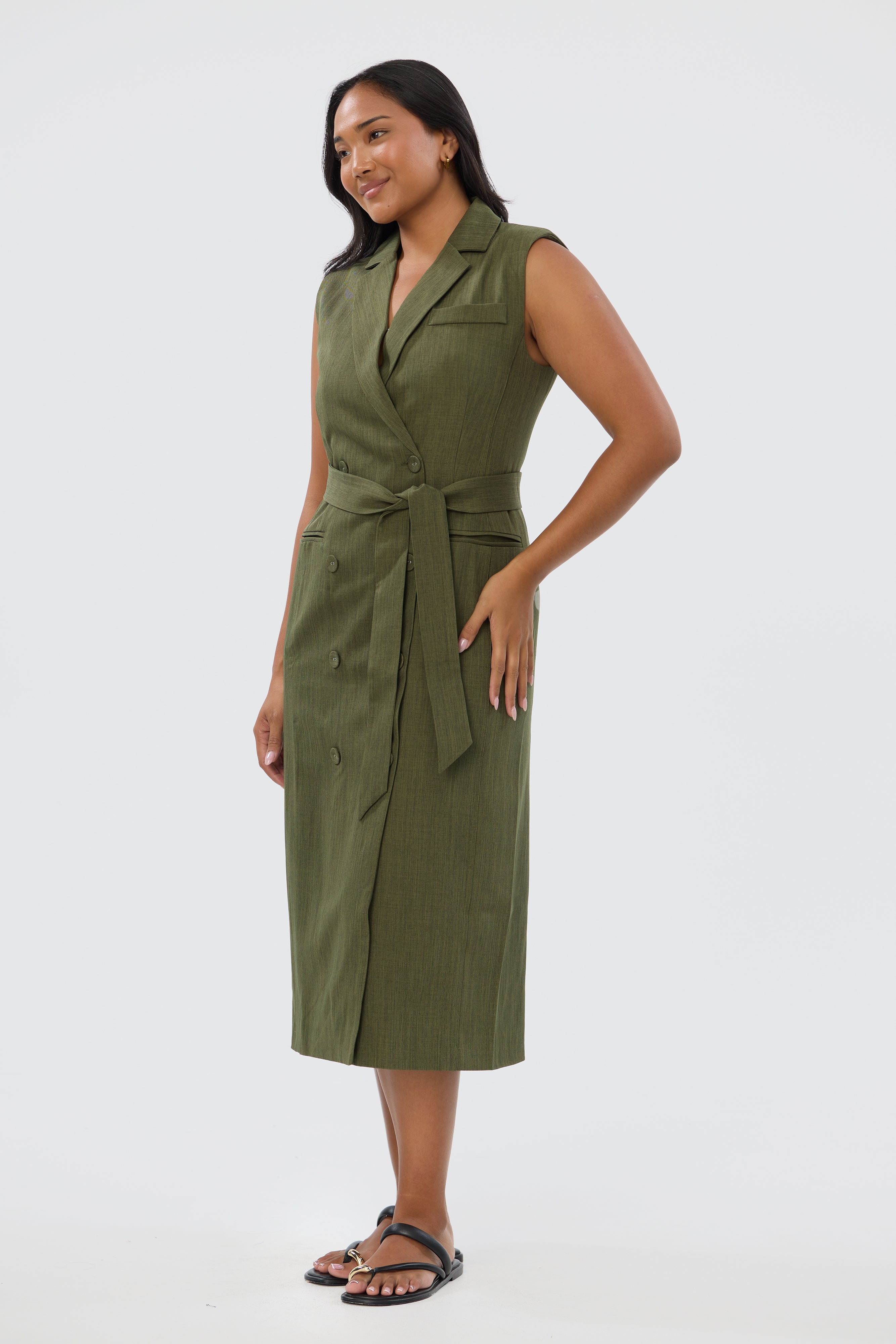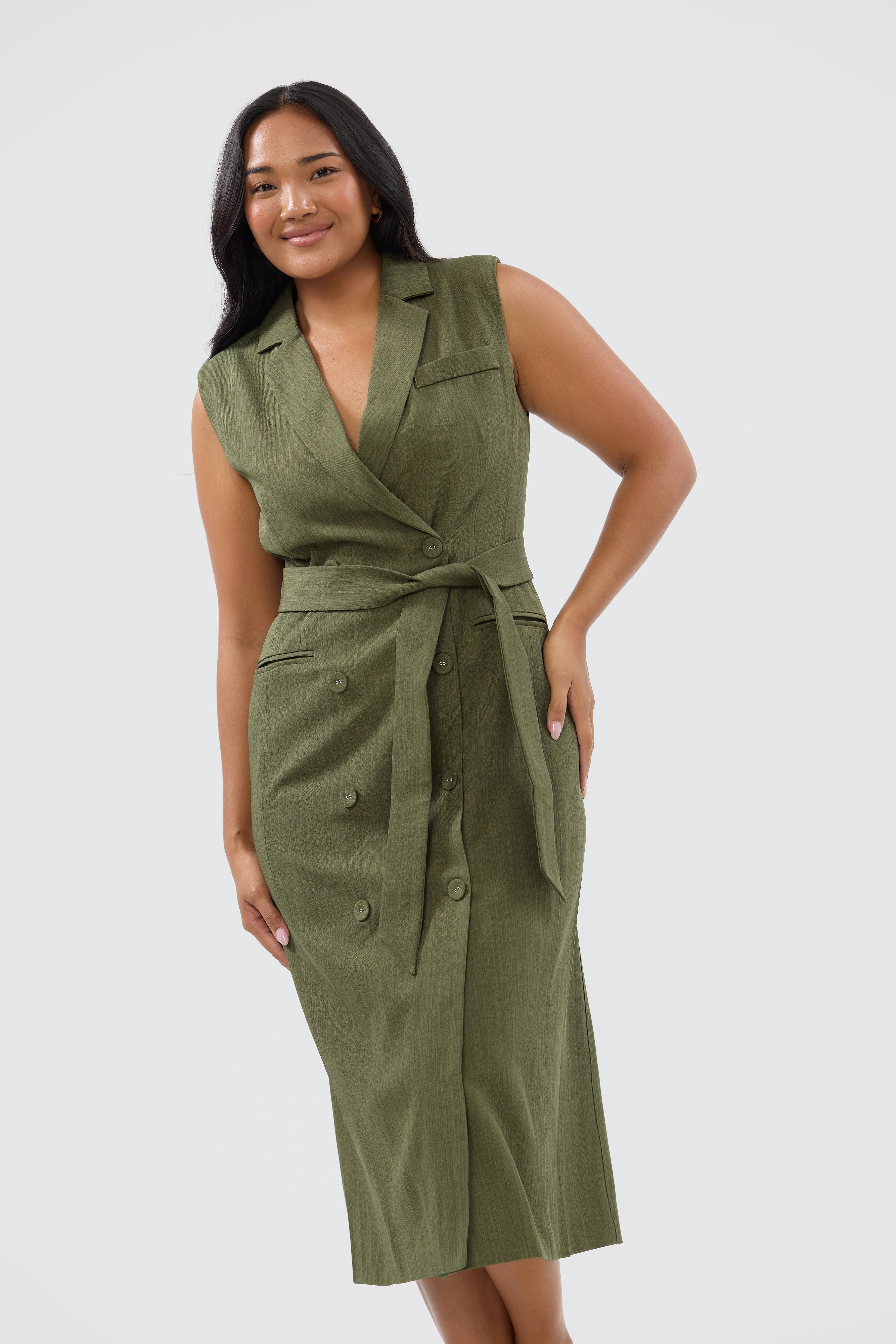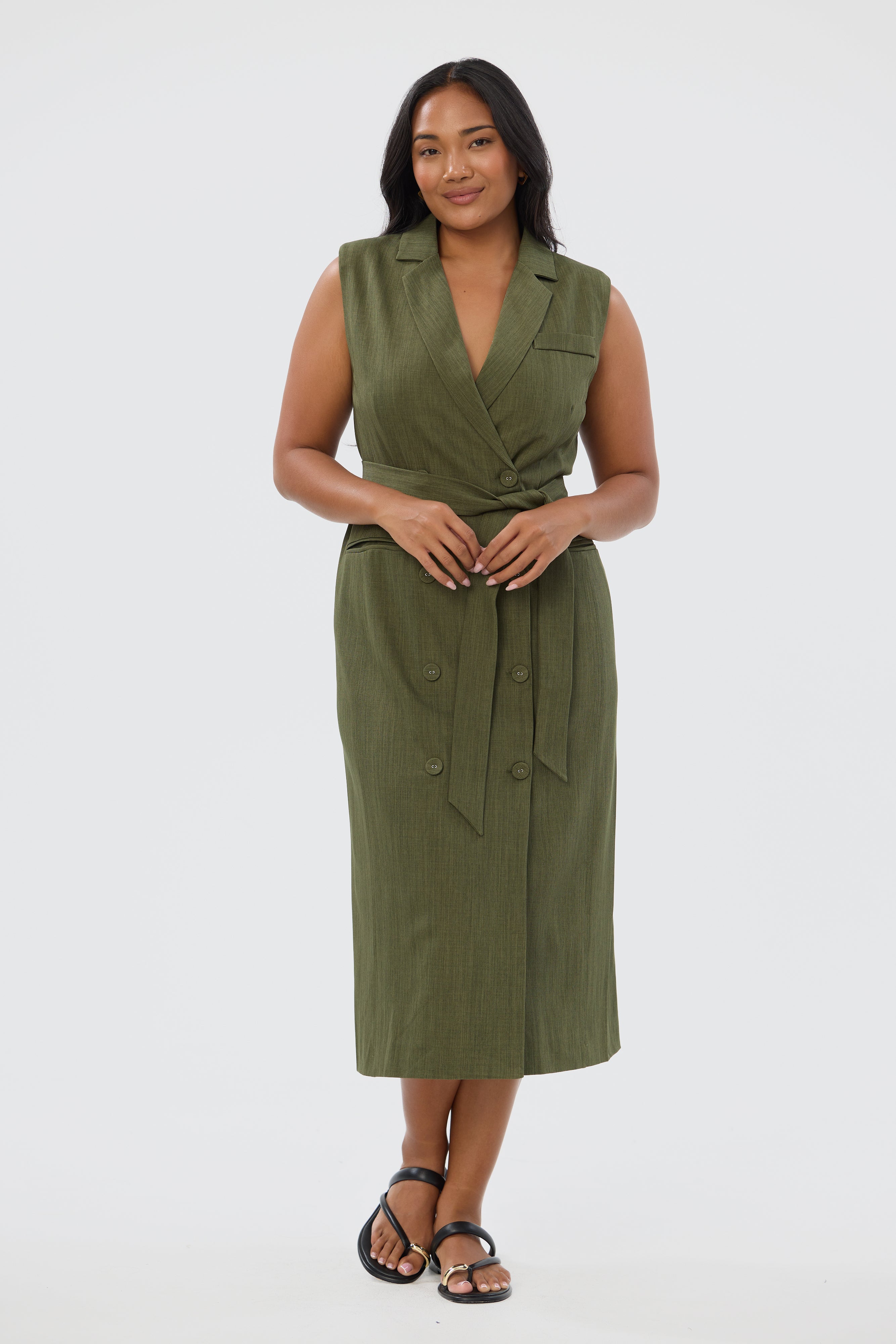 The Double Breasted Midi Dress in Khaki is a refined take on modern tailoring. Cut to a regular fit, it features fabric-covered buttons and subtle welt pockets. Finished with a detachable waist tie and back hem vent, this fully lined midi dress offers an elevated option for both day and evening wear.
