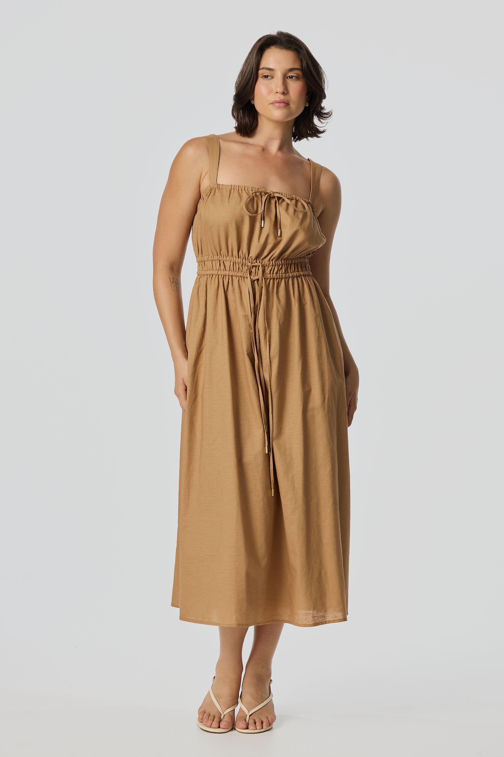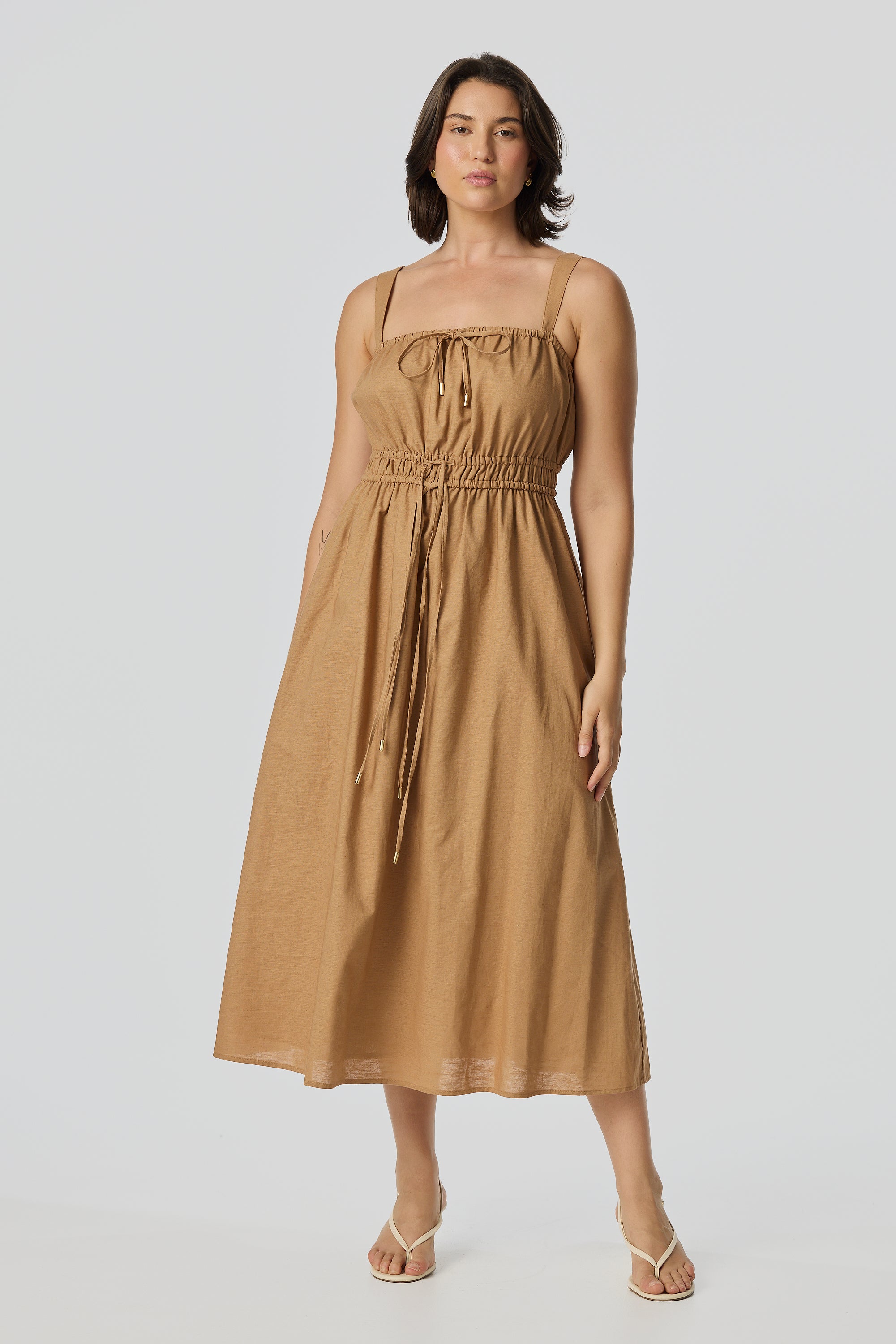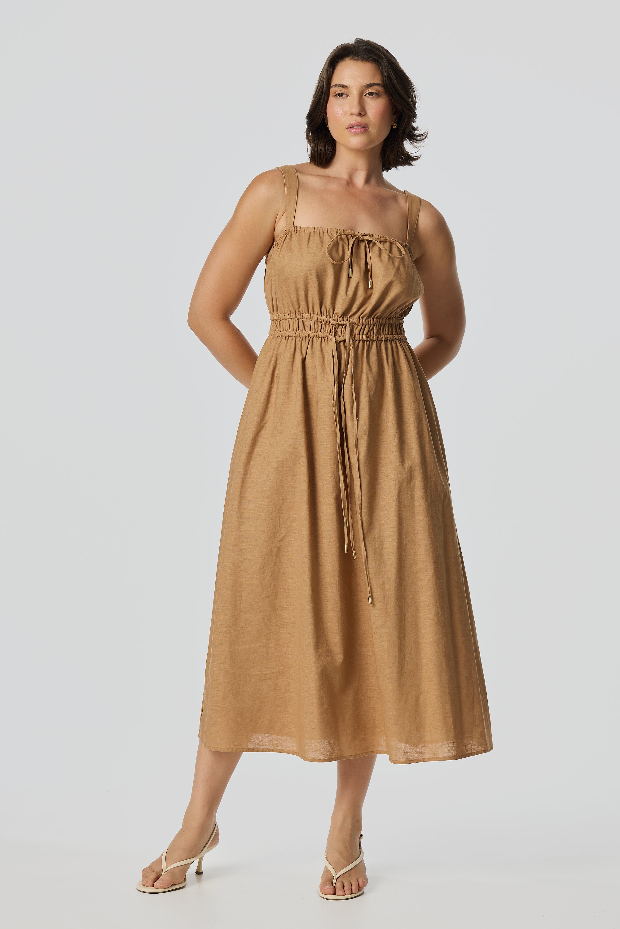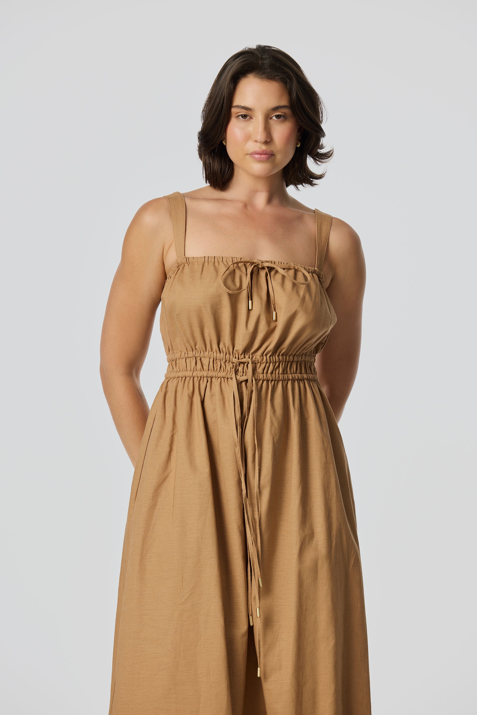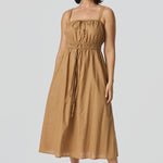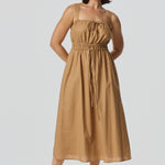 The Gathered Midi Dress in Copper is crafted from a mid-weight cotton-linen blend for a soft, structured drape. Featuring a square neckline and adjustable drawstrings at the top and waist, it falls to a relaxed midi length for all-day comfort.