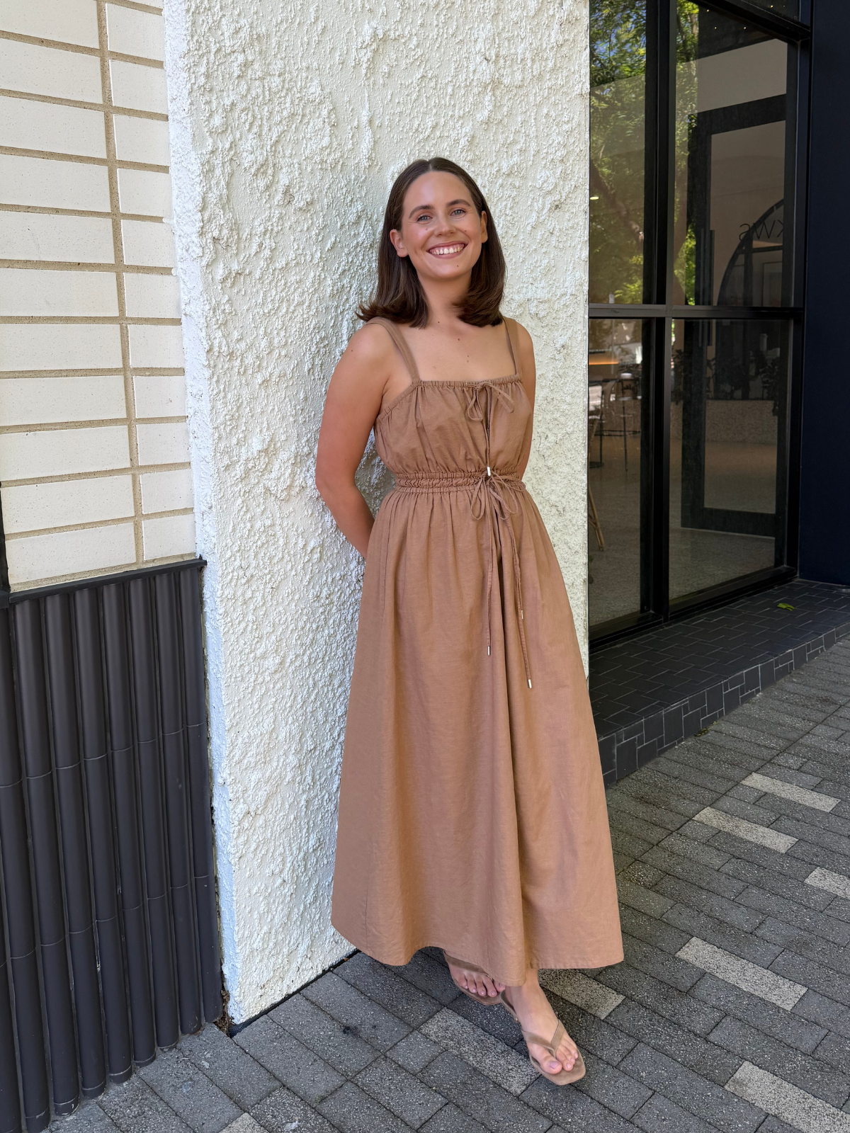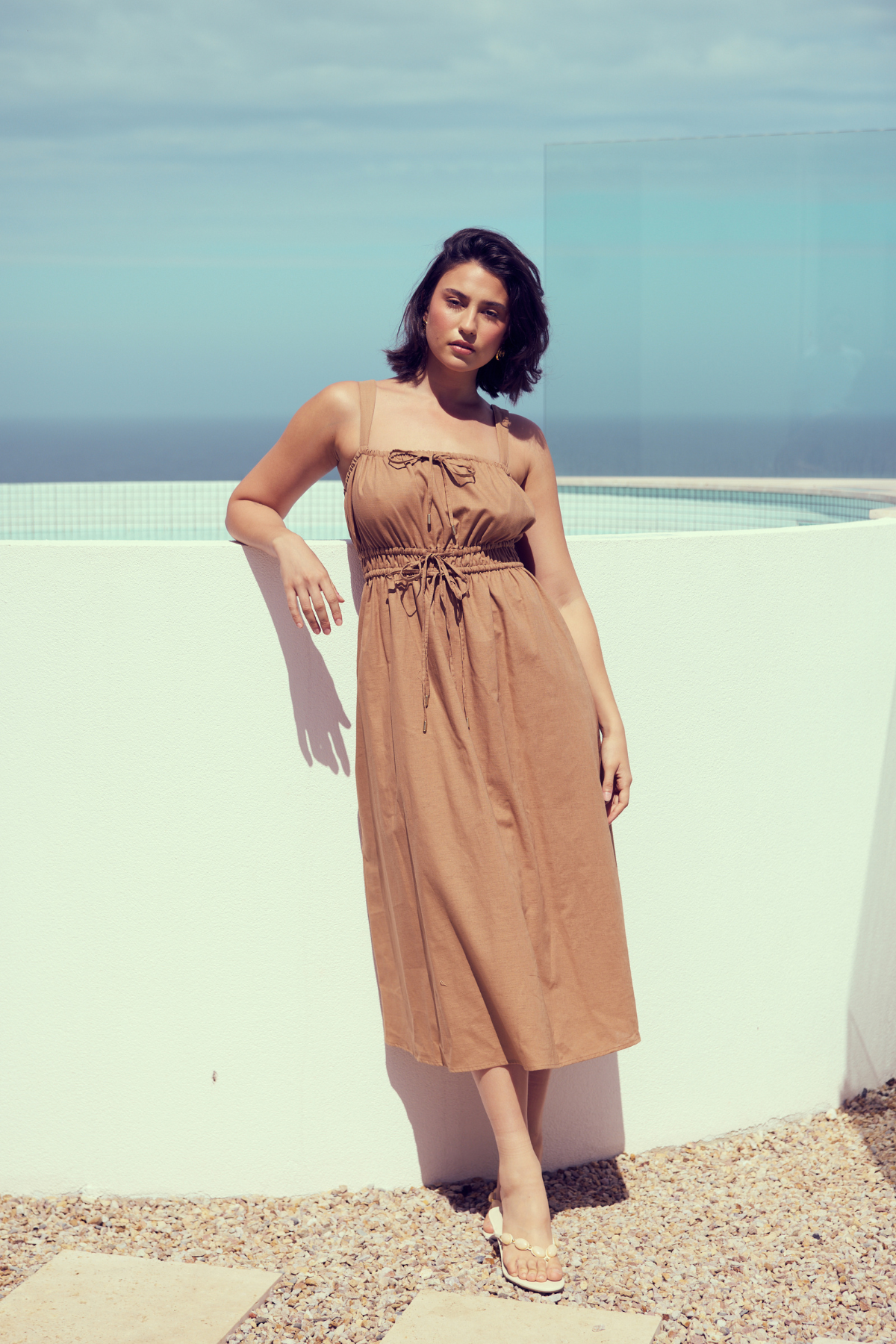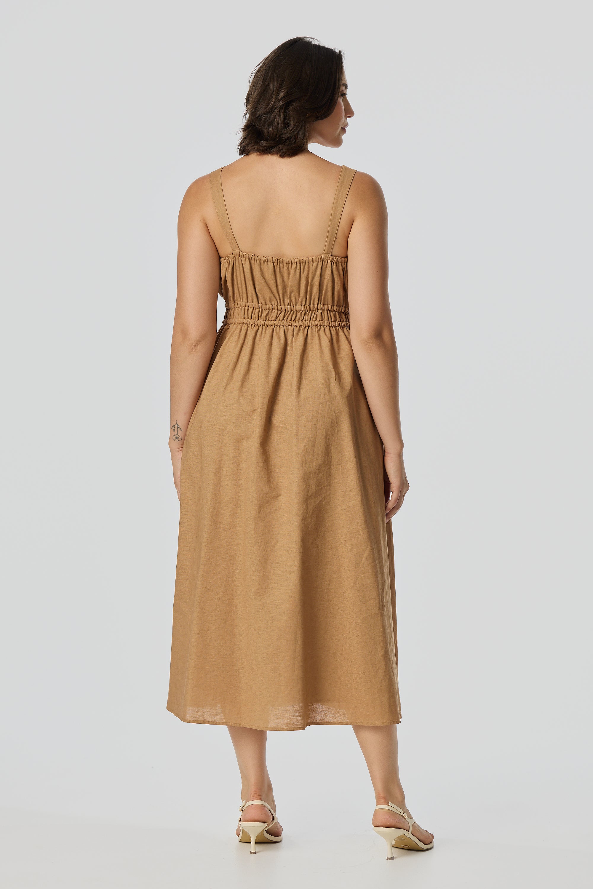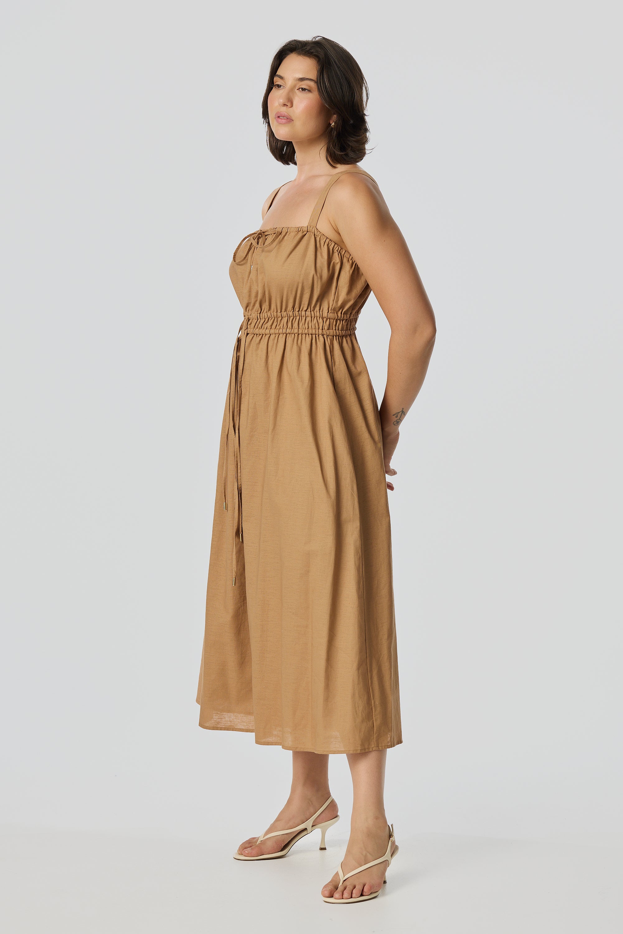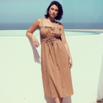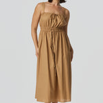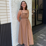 The Gathered Midi Dress in Copper is crafted from a mid-weight cotton-linen blend for a soft, structured drape. Featuring a square neckline and adjustable drawstrings at the top and waist, it falls to a relaxed midi length for all-day comfort.