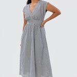The Gathered V Neck Midi Dress in Black/White Gingham features an invisible side zip closure, a shirred elasticated waistband at the back for comfort, and a concealed hook and eye at the bust. With gathering under the bust and an A-line silhouette, this mid-weight cotton midi dress offers effortless comfort for everyday wear.