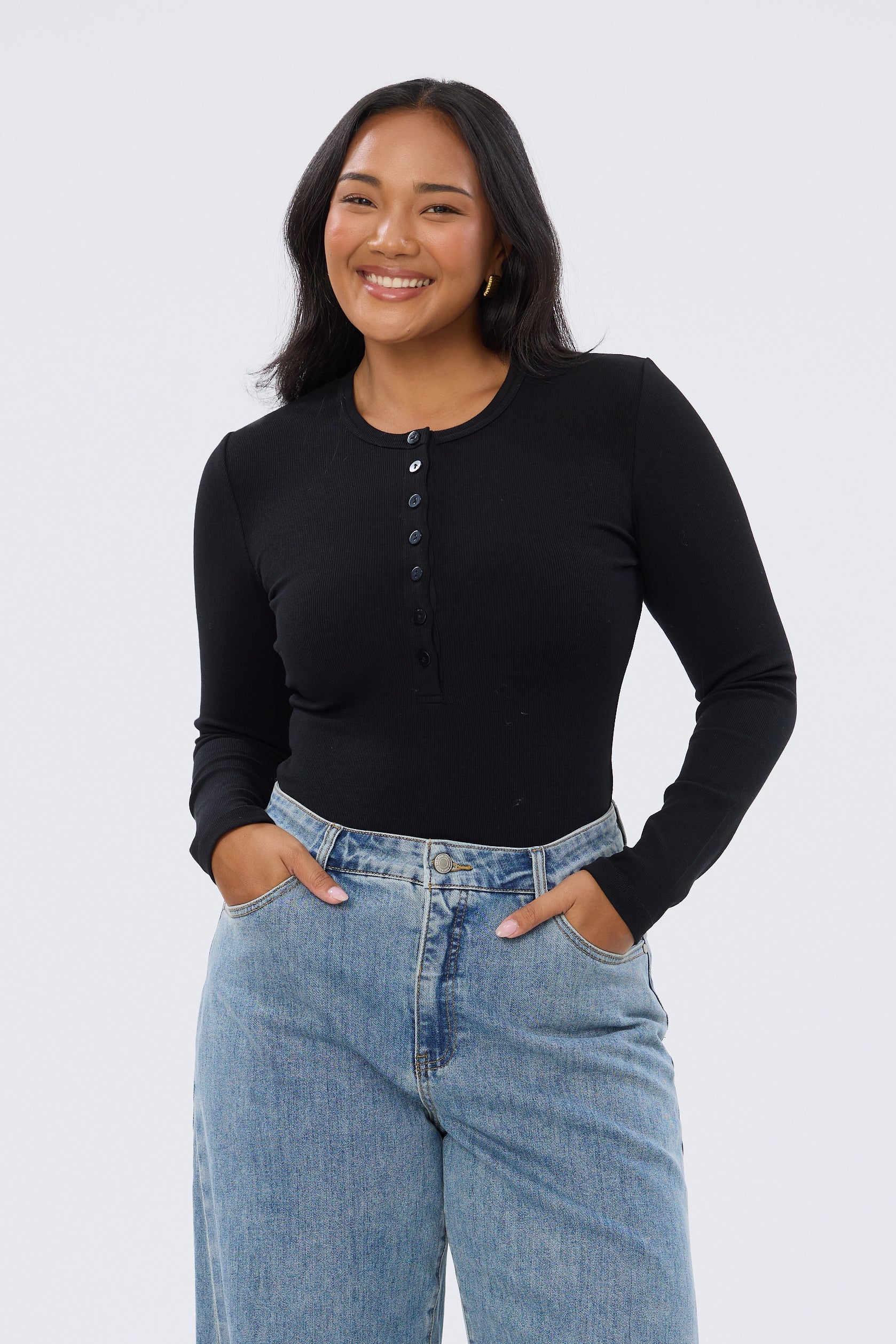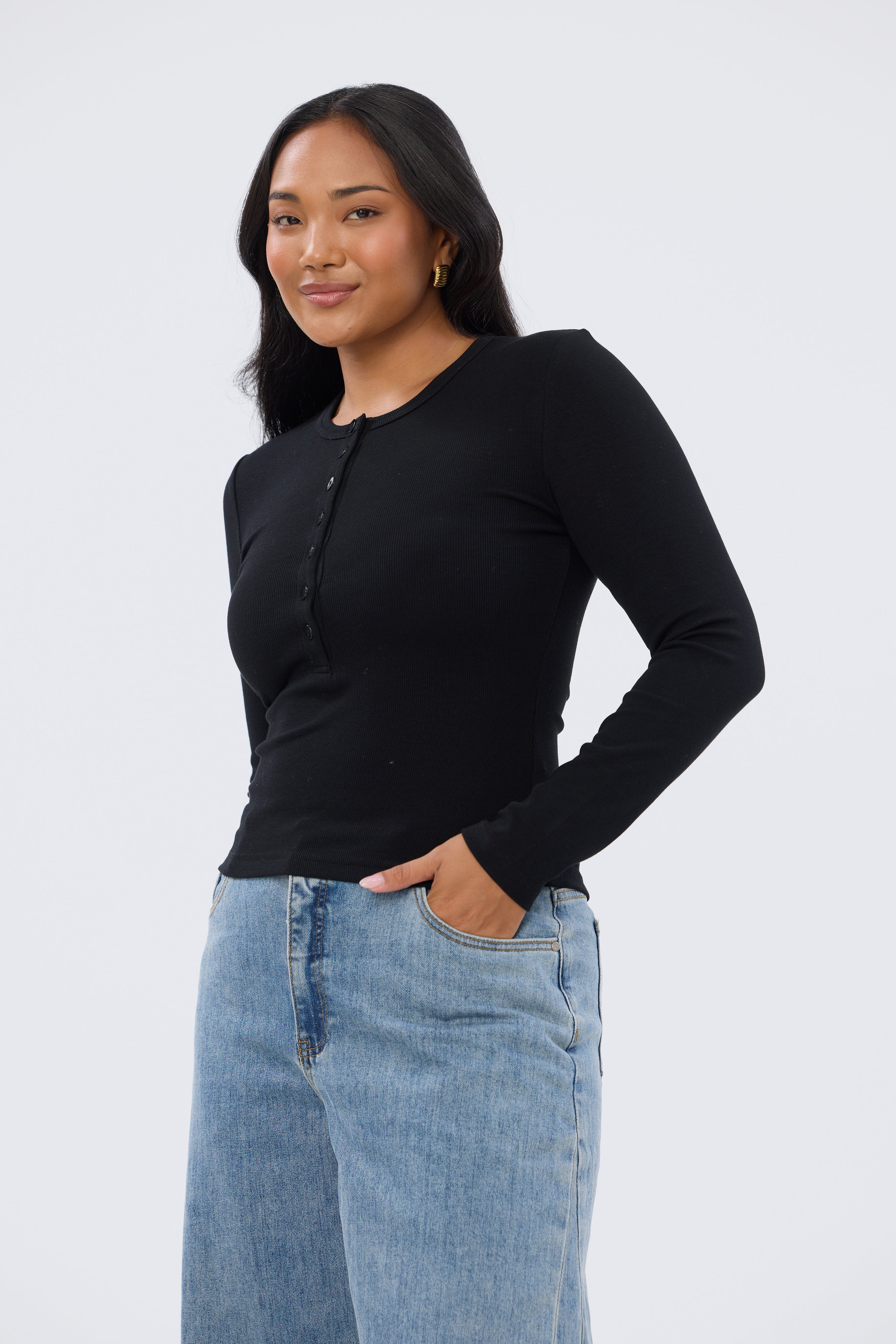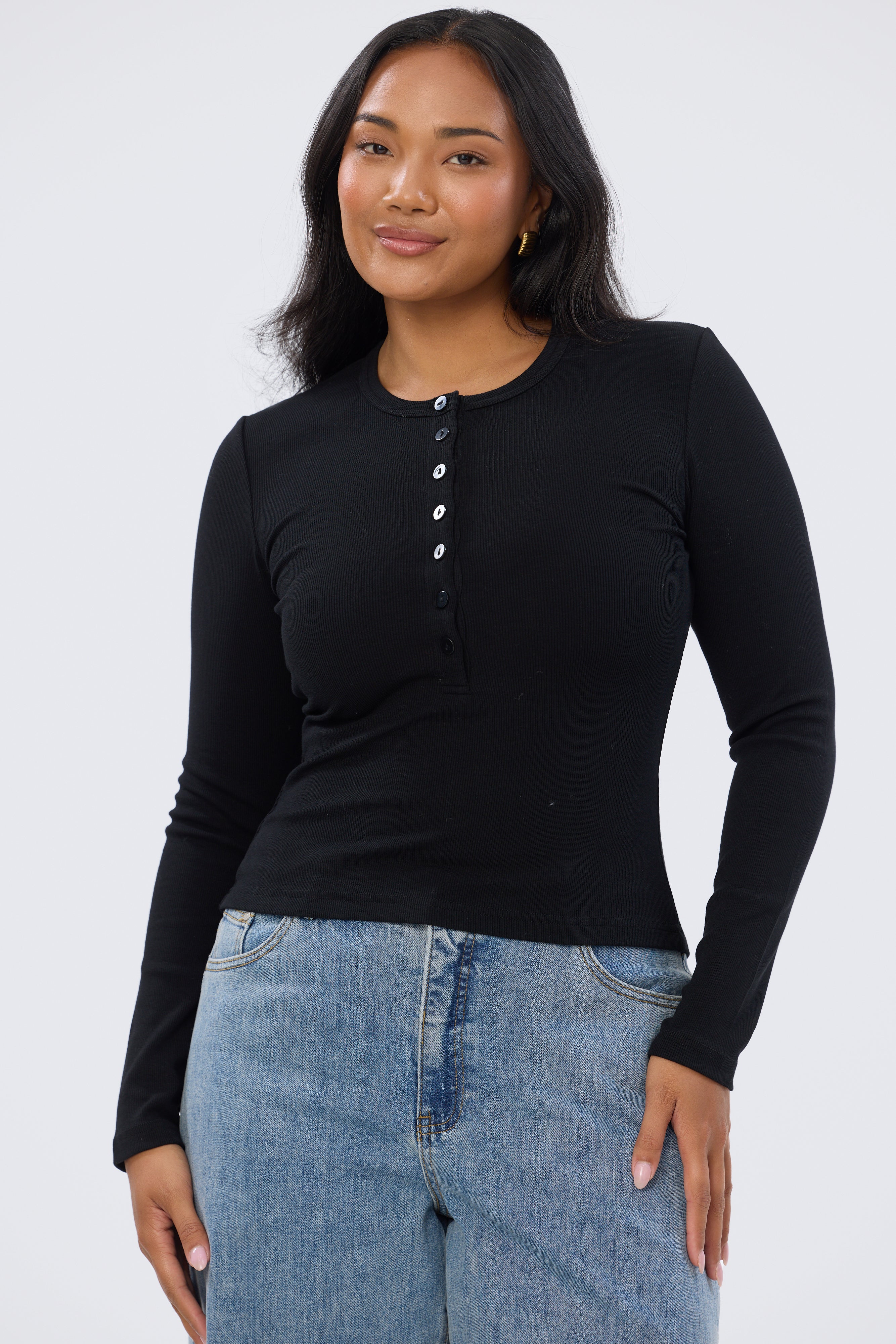 An elevated everyday essential, the Henley Long Sleeve Top in Black is a fitted, mid-length style crafted from mid-weight stretch jersey. Designed with a classic crew neckline and half placket with functional buttons, it’s a versatile staple for effortless styling.