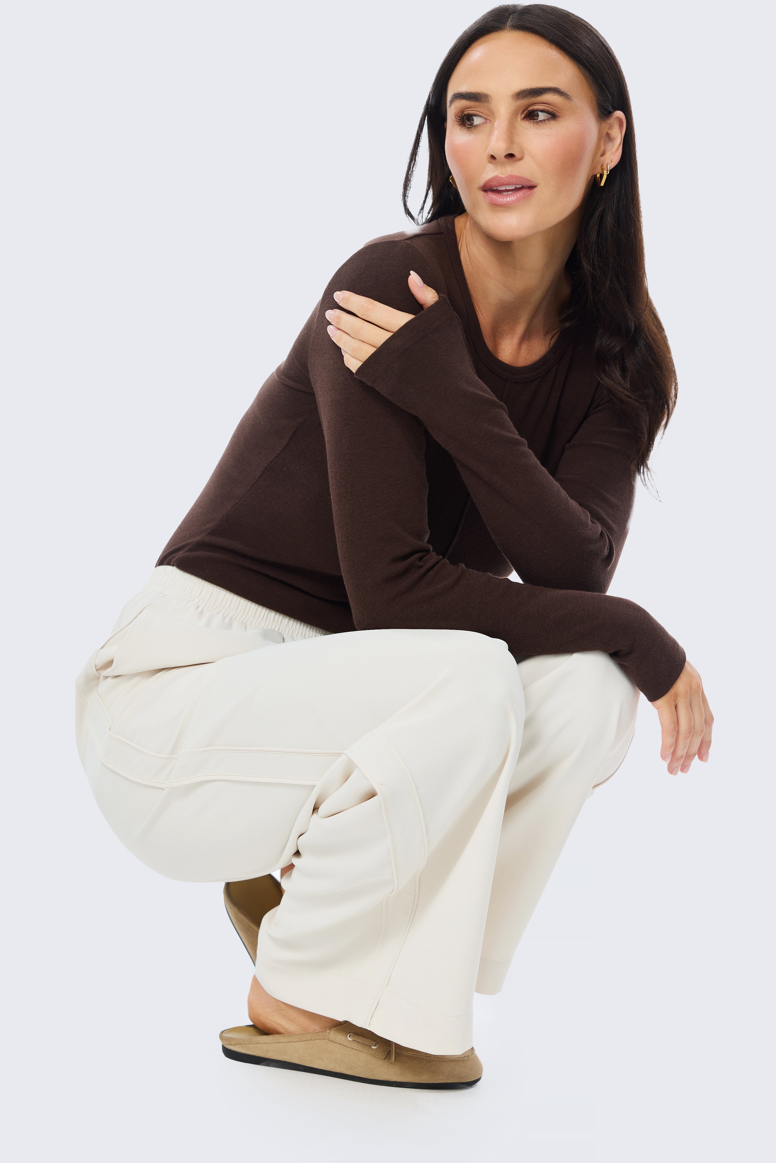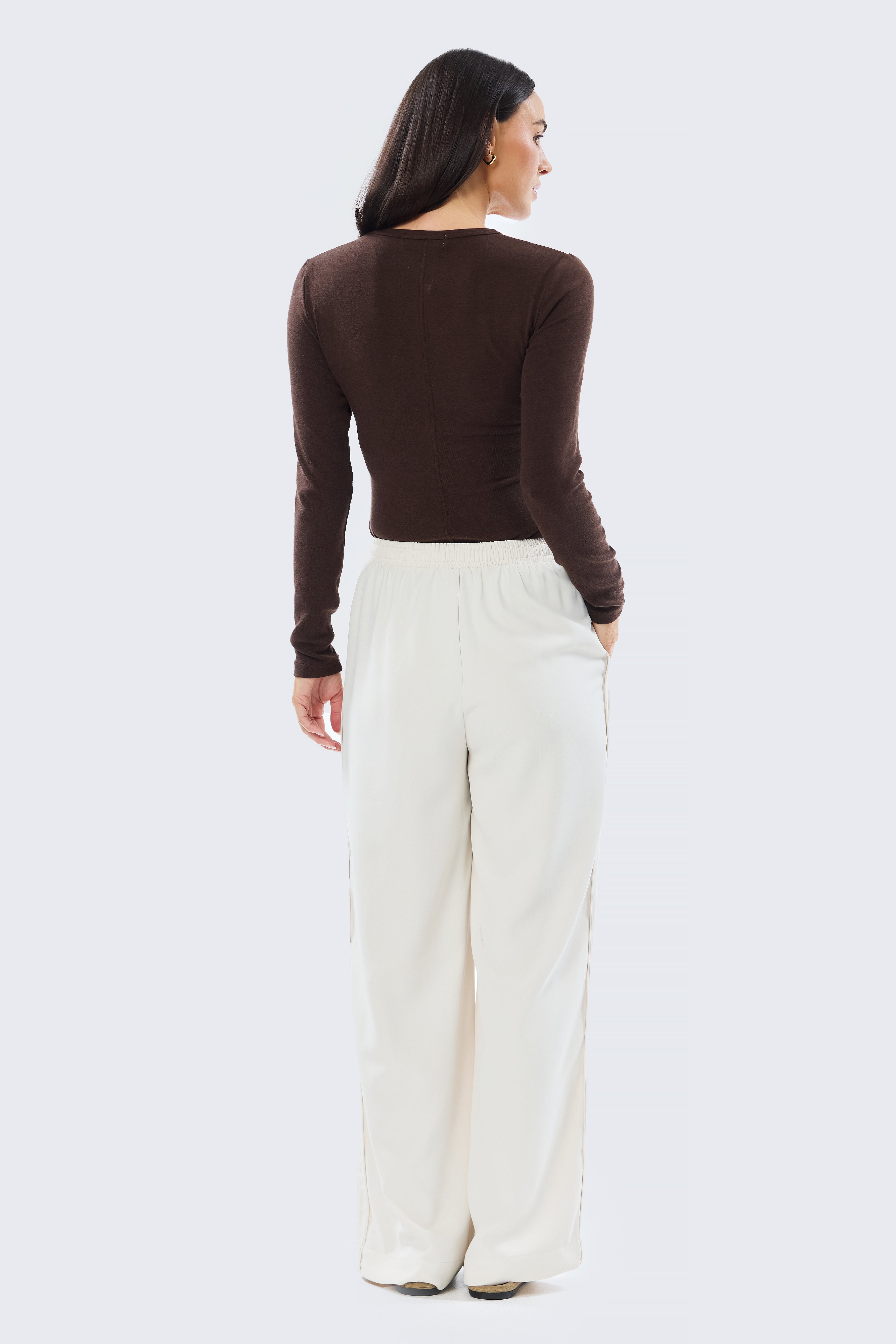 A versatile wardrobe essential, the Long Sleeve Jersey Top in Dark Chocolate is crafted from ultra-soft, mid-weight stretch jersey, with subtle topstitched centre-front and centre-back seam details for a flattering, fitted silhouette. Perfect worn alone or layered under your favourite jackets and knits.