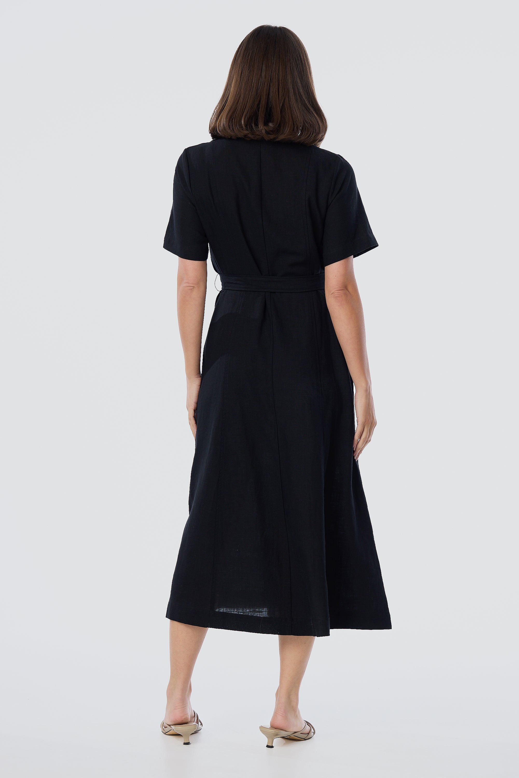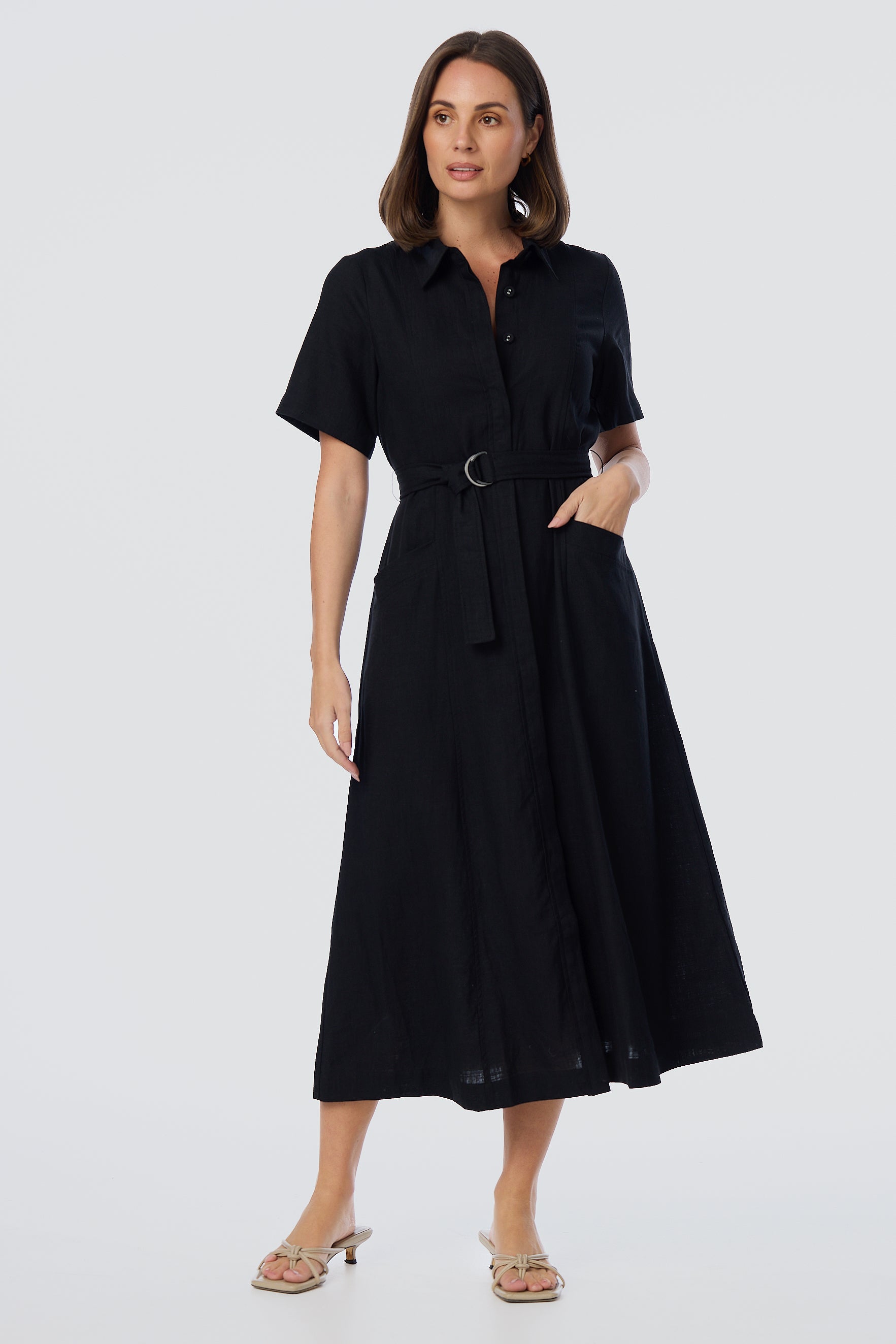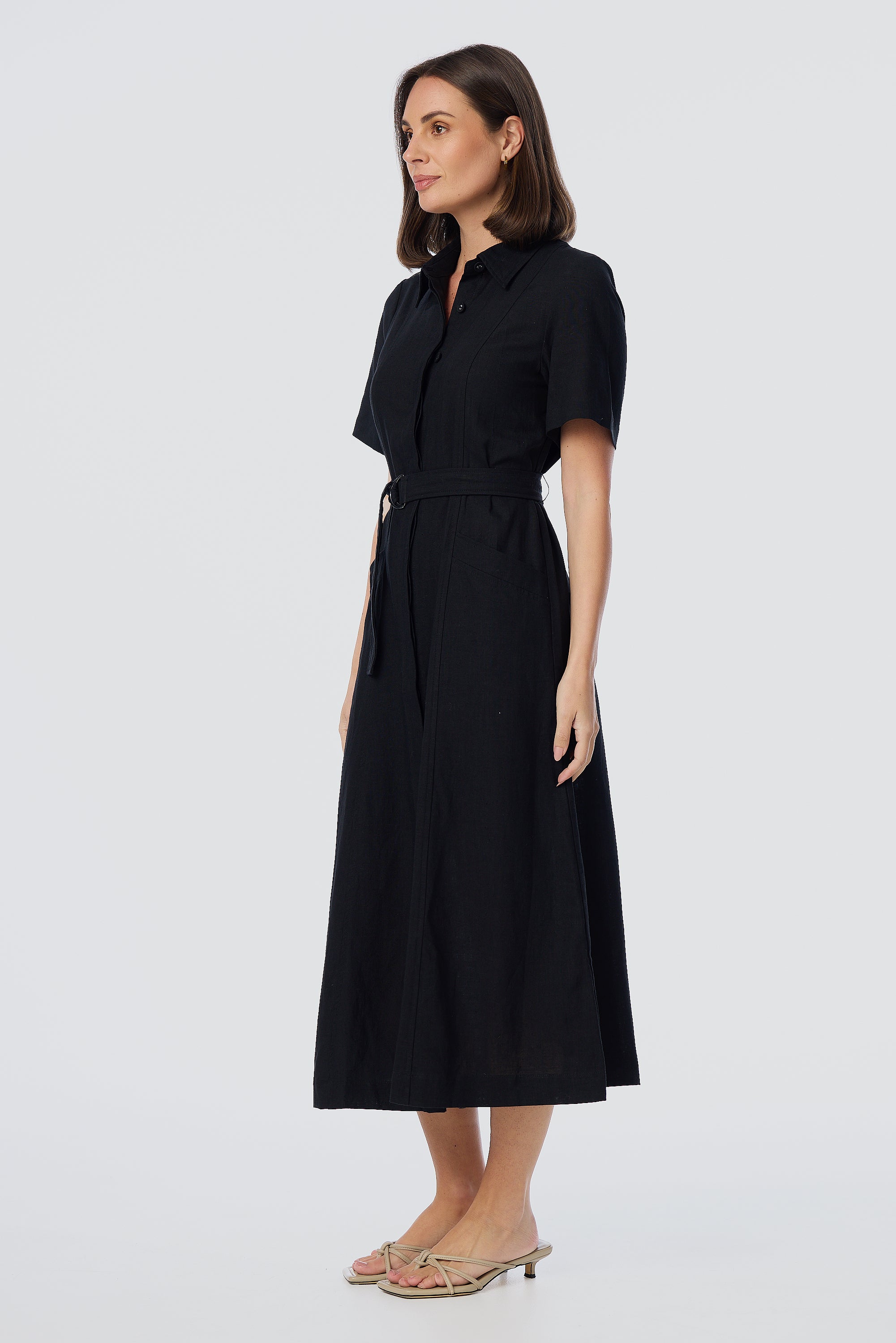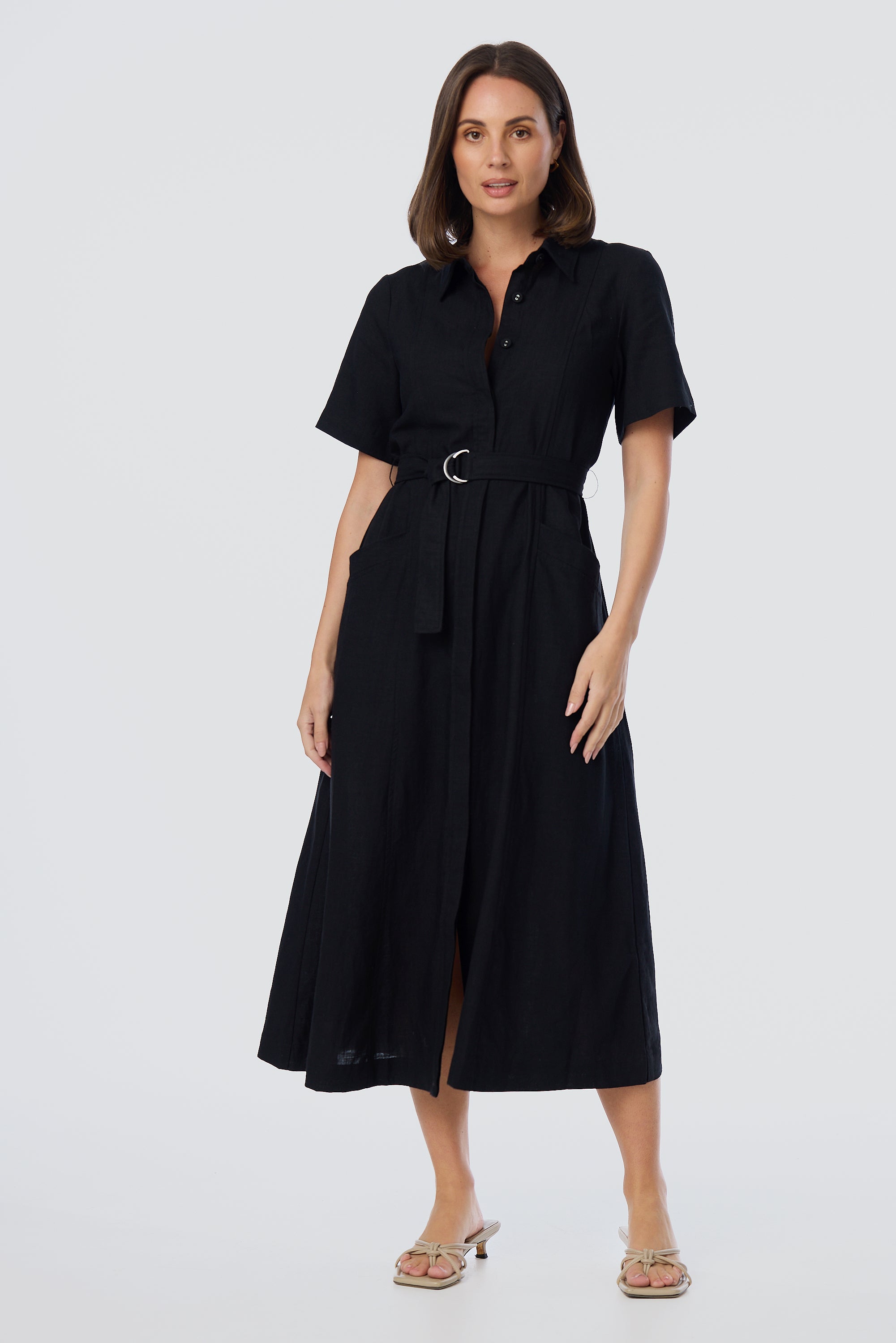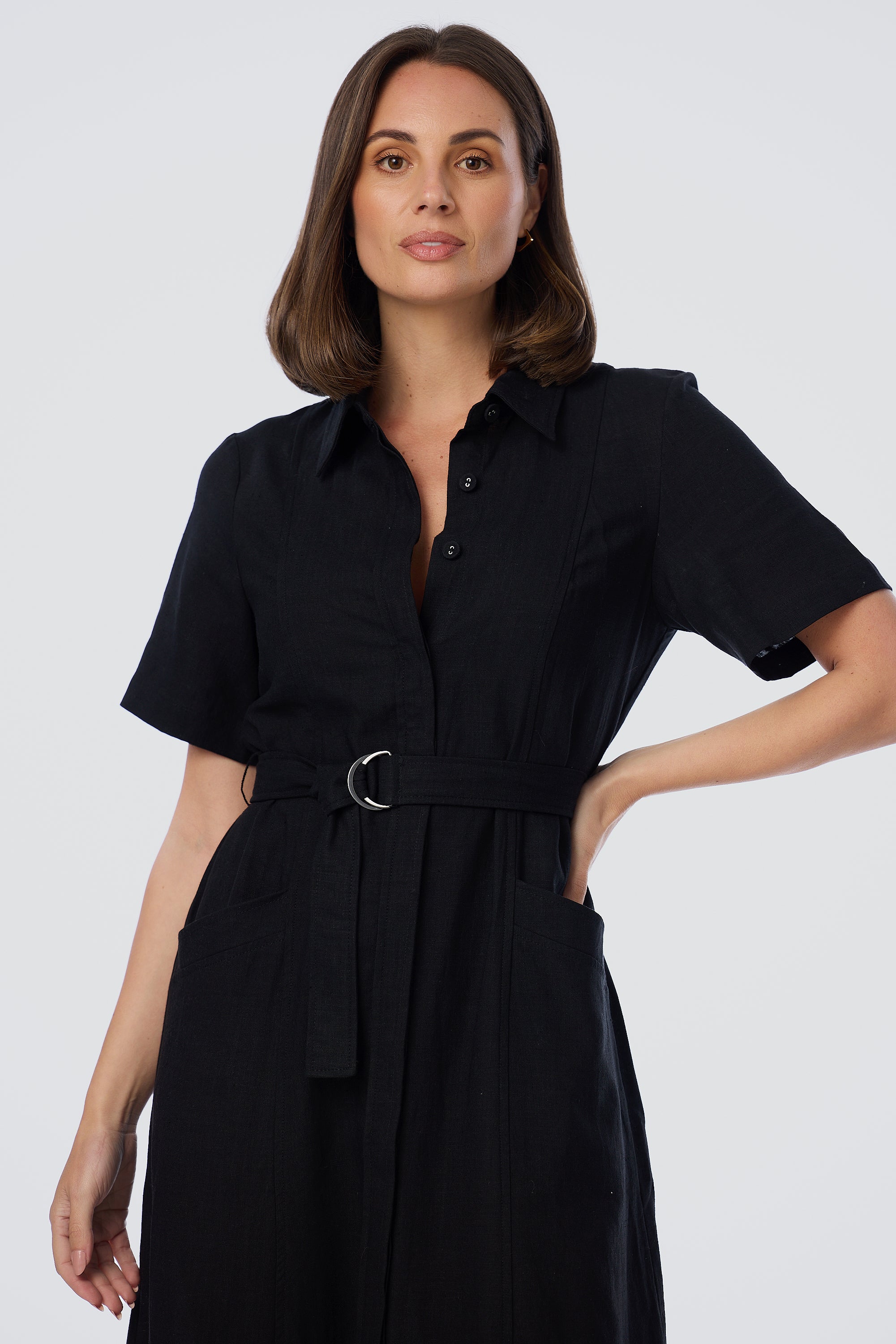 Tailored yet relaxed, the Panelled Shirt Dress in Black brings timeless structure to an easy silhouette. With concealed buttons, feature pockets, and a D-ring belt, it’s a versatile midi-length style that’s equally at home in the office or off-duty.