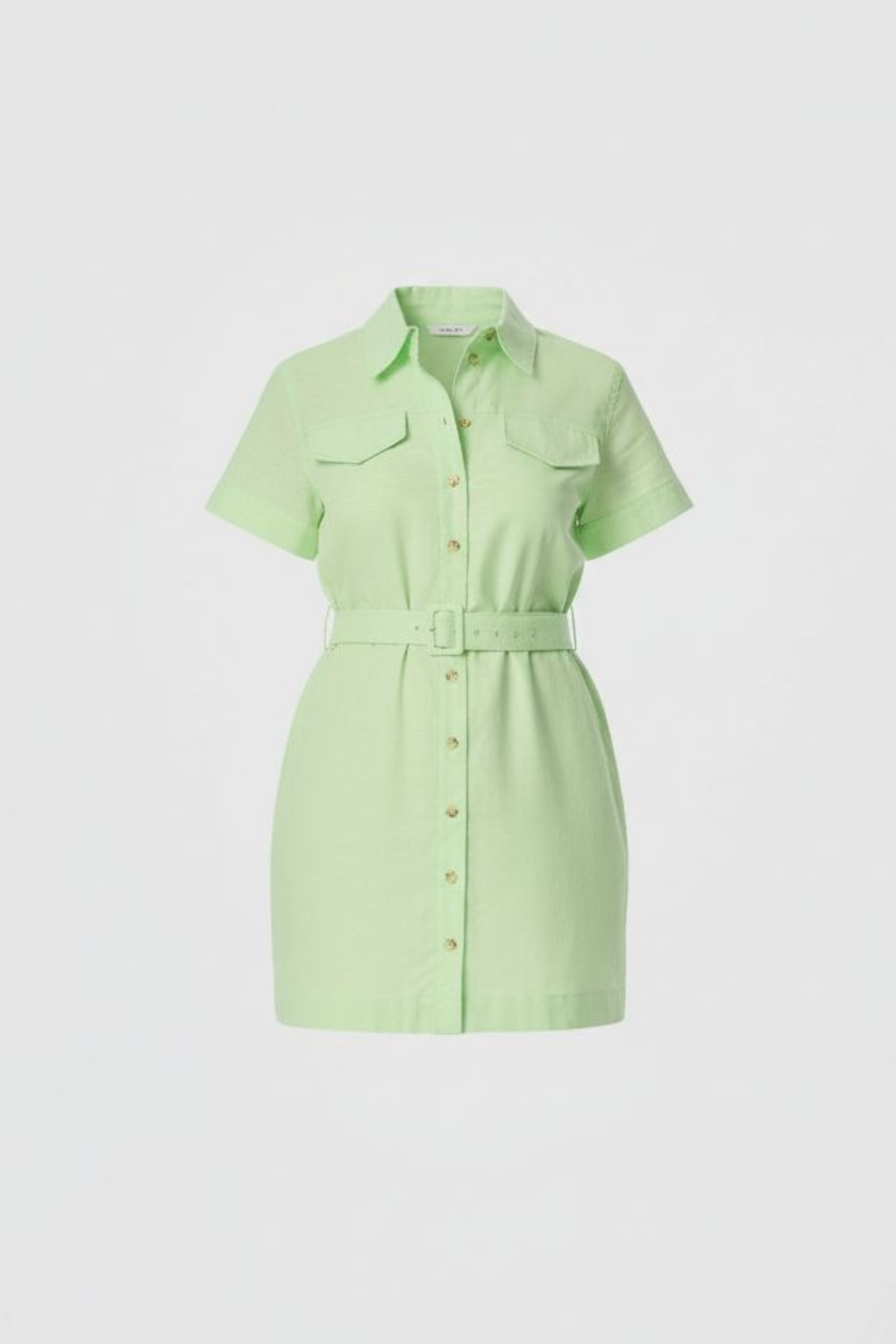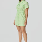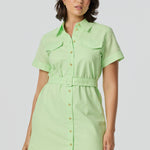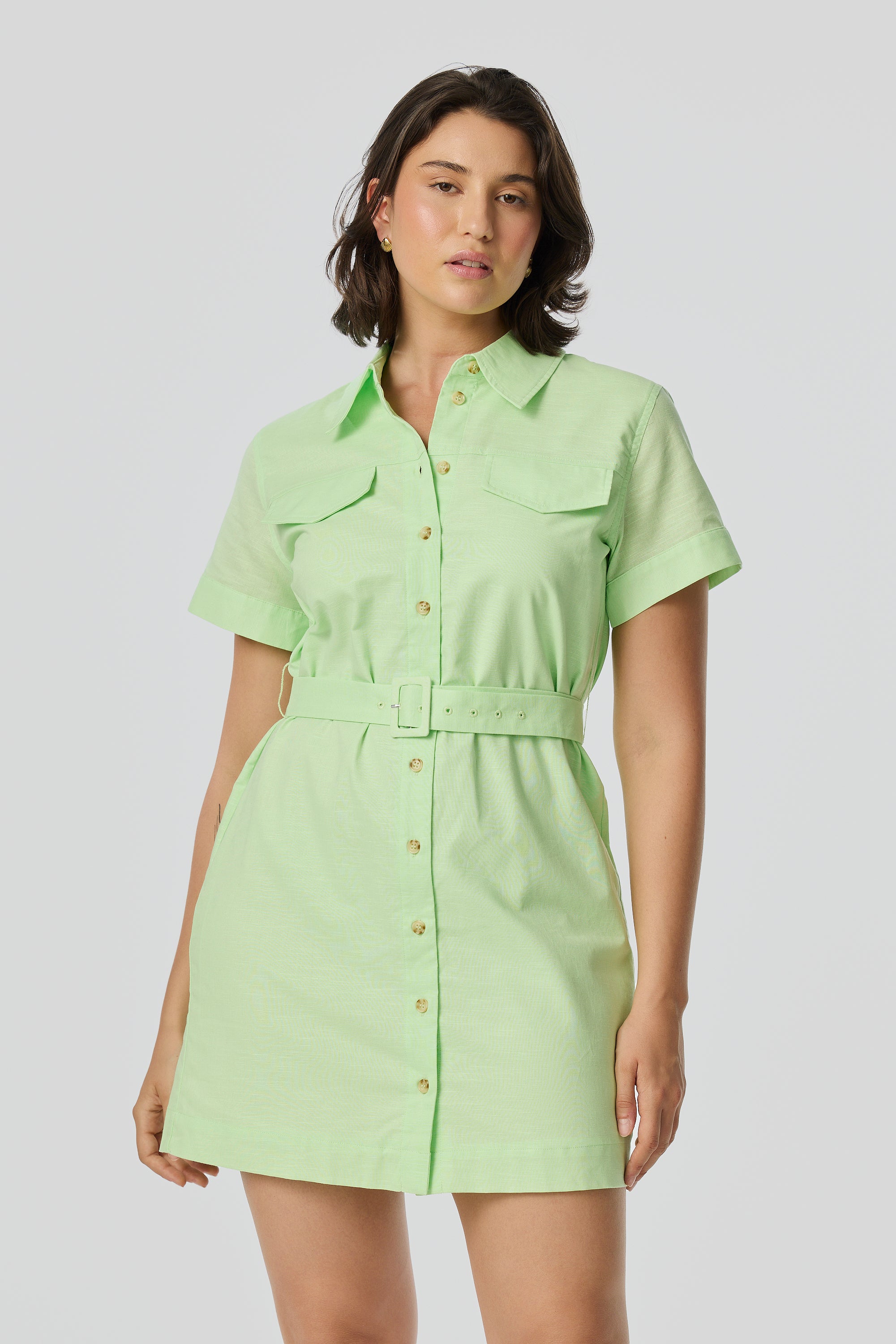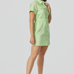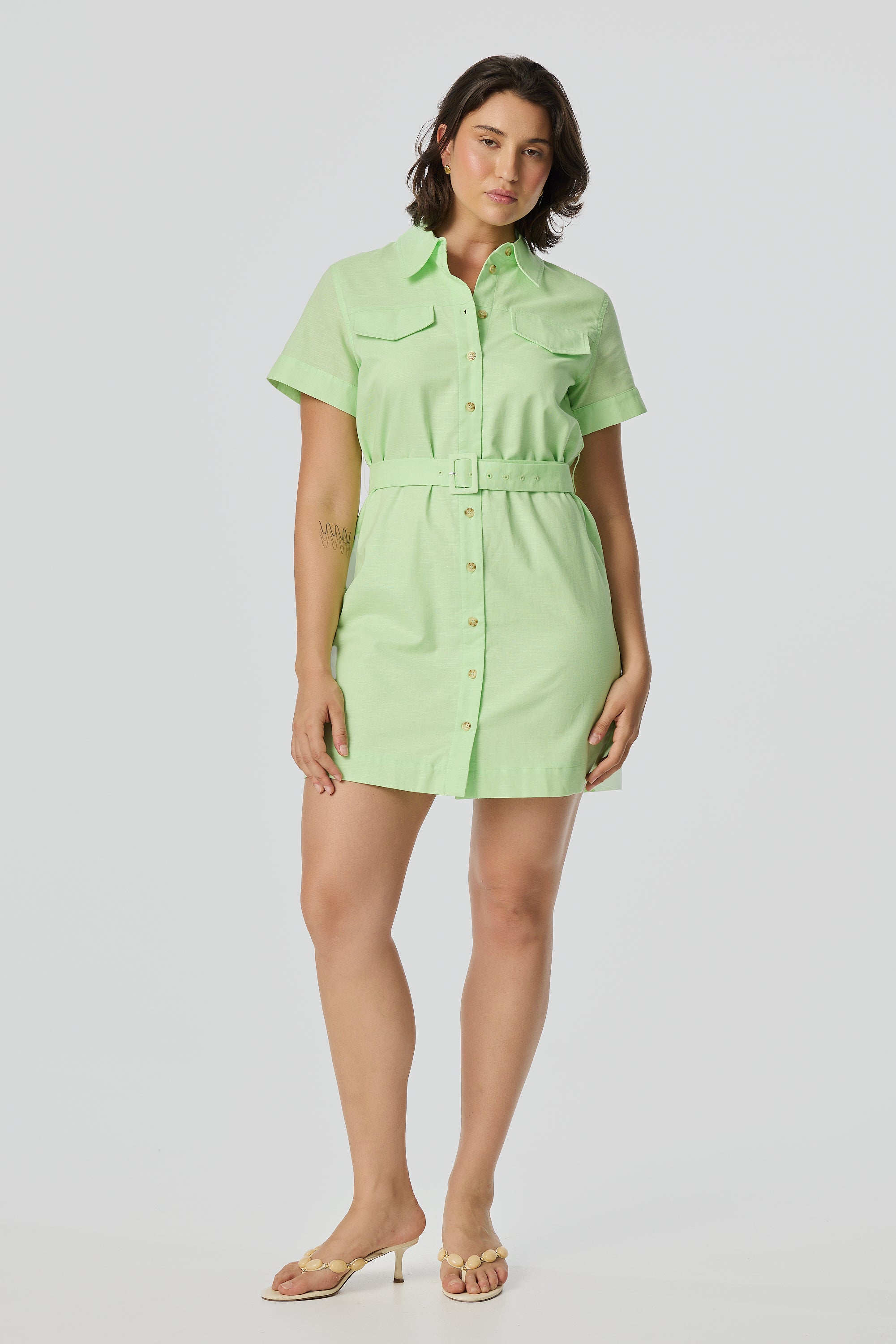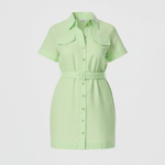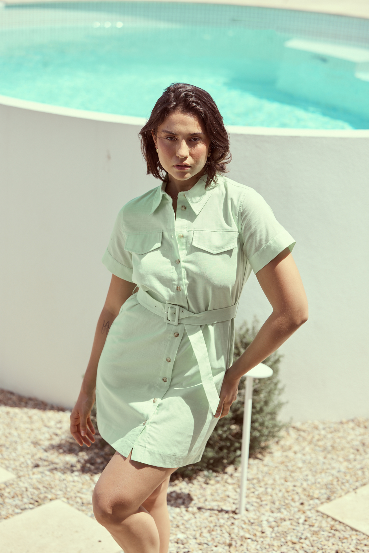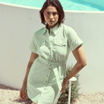The perfect summer staple, the Pocket Shirt Mini Dress in Matcha features a relaxed fit and short sleeves for effortless everyday wear. Subtle topstitching and faux chest pockets add refined detail, while the adjustable belt lets you define the waist and elevate your look with ease.