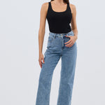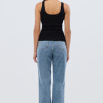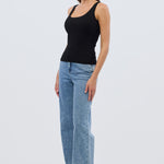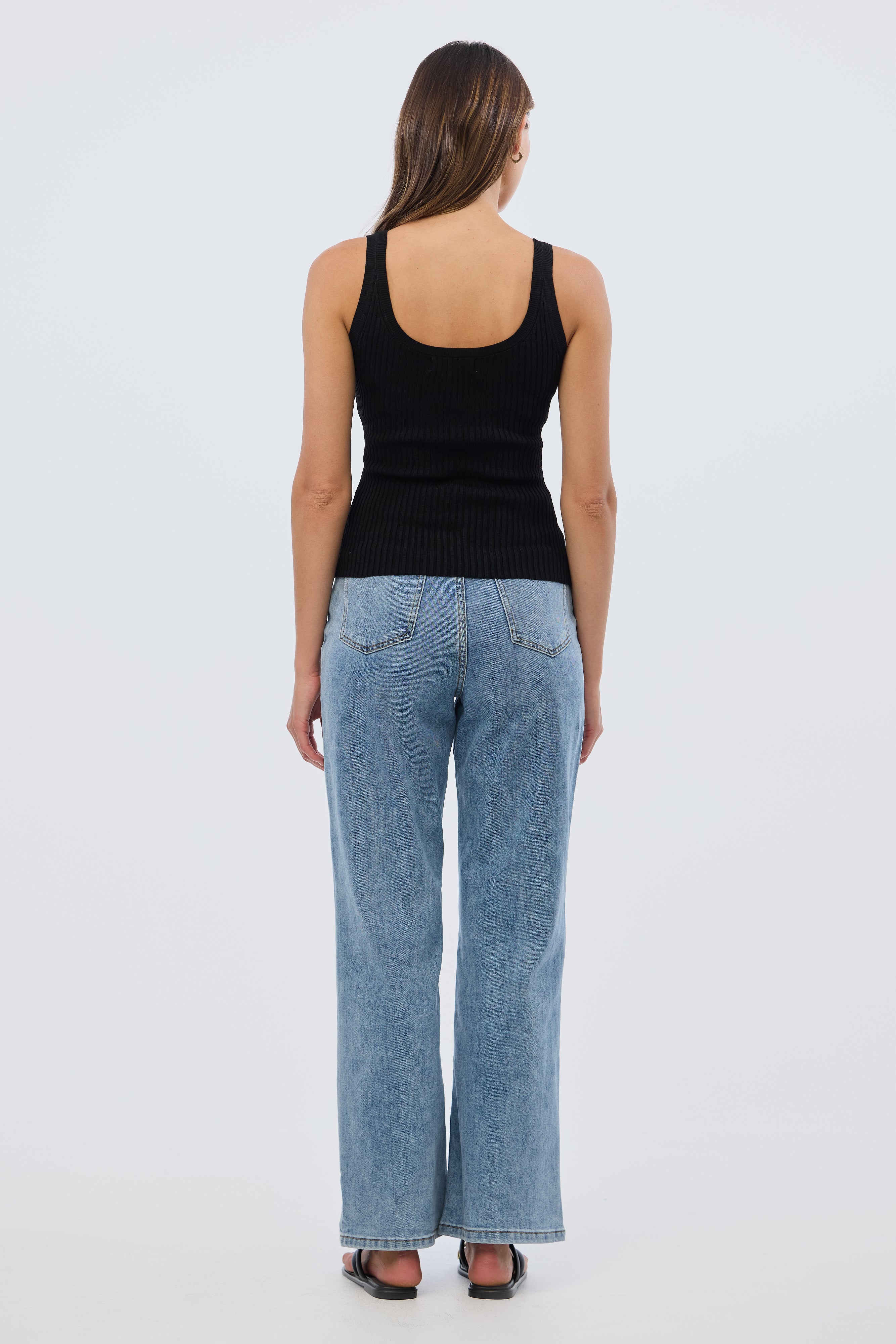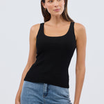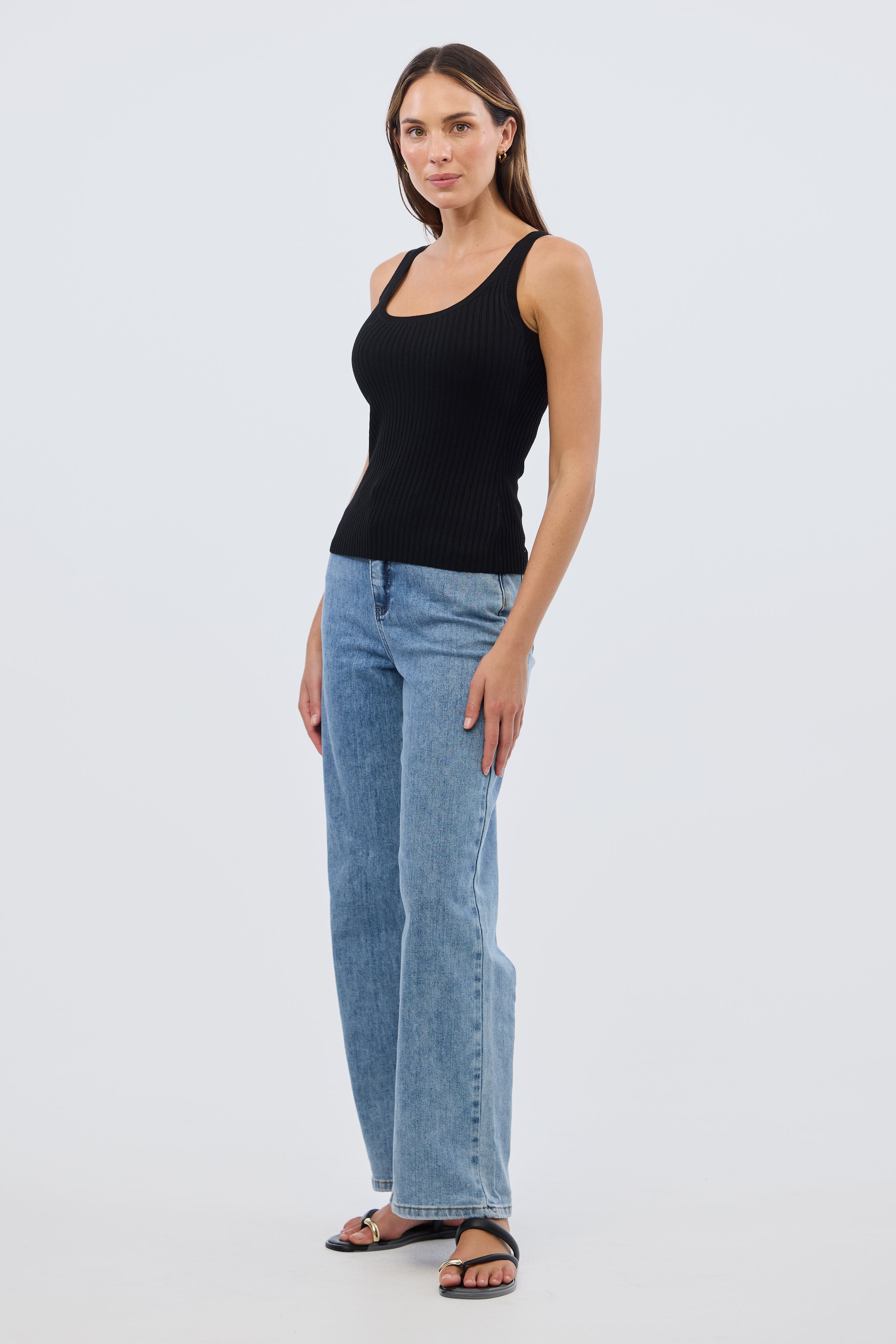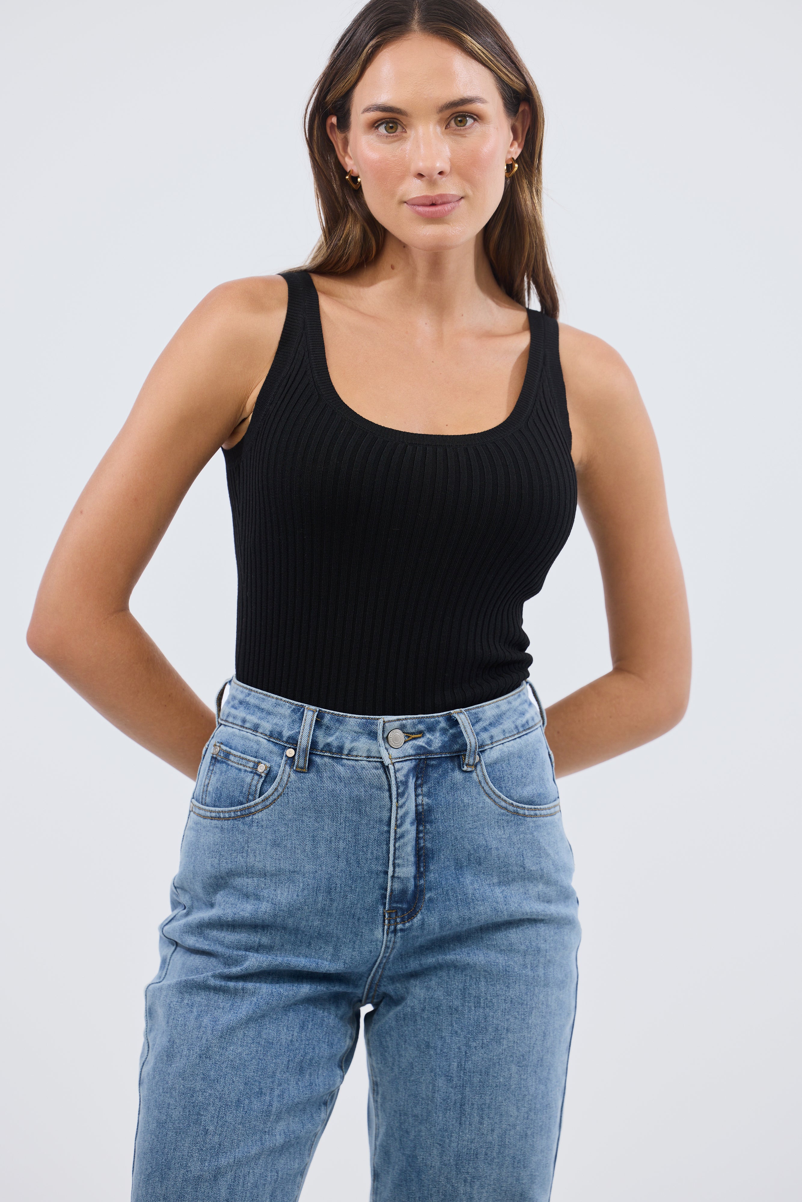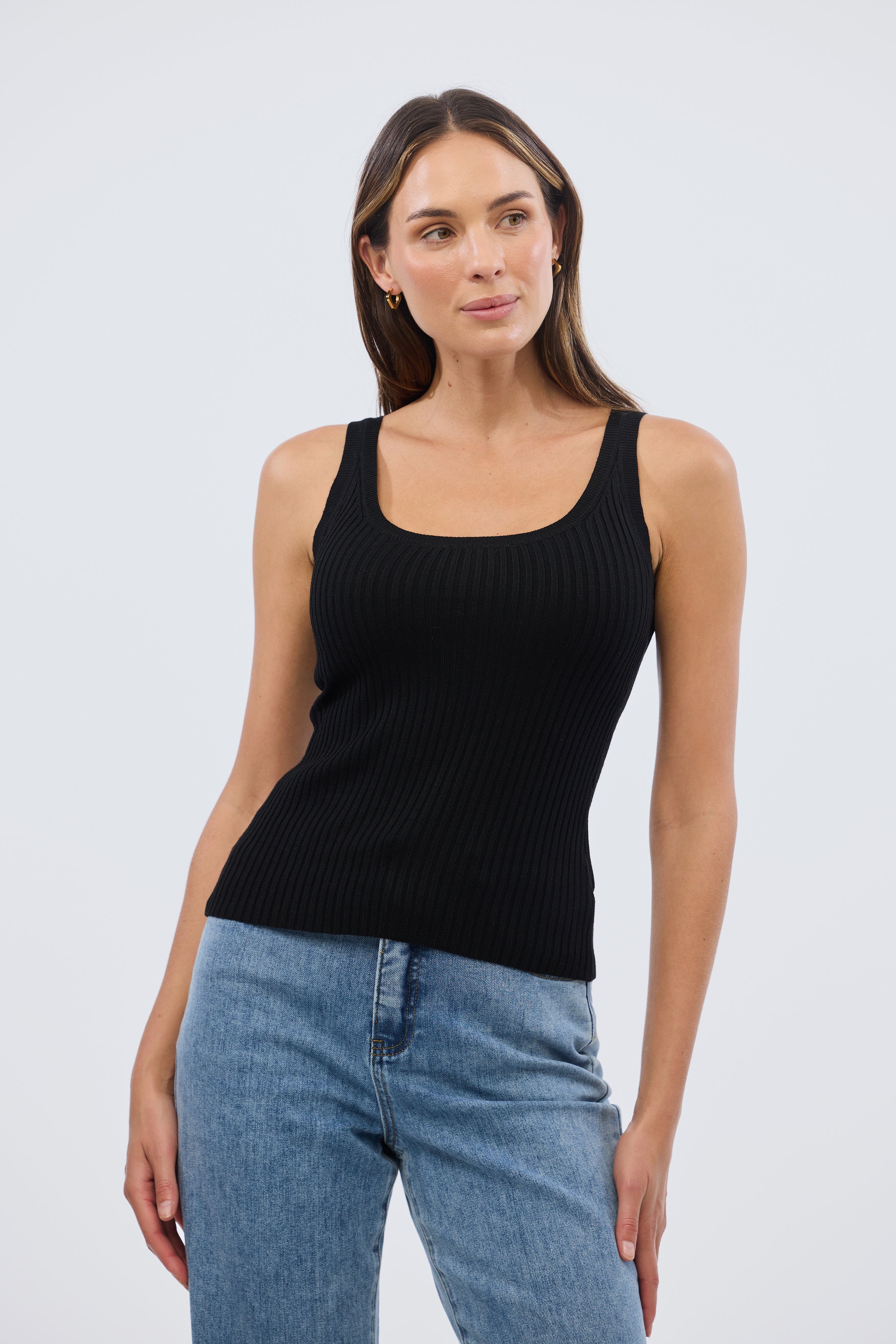 The Scoop Neck Knit Tank in Black is a versatile layering piece with a flattering fitted silhouette. Crafted from stretch mid-weight rib knit, it features a classic scoop neckline and sleeveless design, making it perfect for pairing with everything from tailored trousers to casual denim.