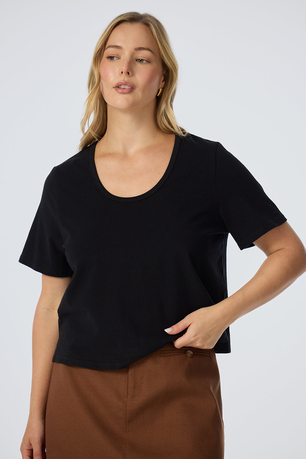 An everyday staple, the Scoop Neck T-Shirt in Black is a regular-fit, mid-length style crafted in mid-weight stretch jersey, designed to pair effortlessly with everything in your wardrobe.