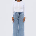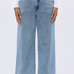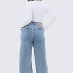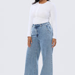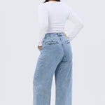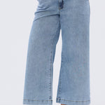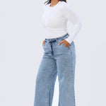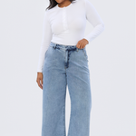 I really love these in the light blue wash — the colour is beautiful and the denim feels soft and comfortable. With this lighter wash, I found I needed to size down to 8. I’m a standard size 10 in all the darker washes and also in the light barrel leg, but this style had plenty of room for me to comfortably downsize. I think the wide‑leg cut allows for that nicely too.I’d definitely recommend considering a size down and chatting with the lovely Serafina team to get the fit right. The returns process is also excellent if you need to try a couple of sizes.