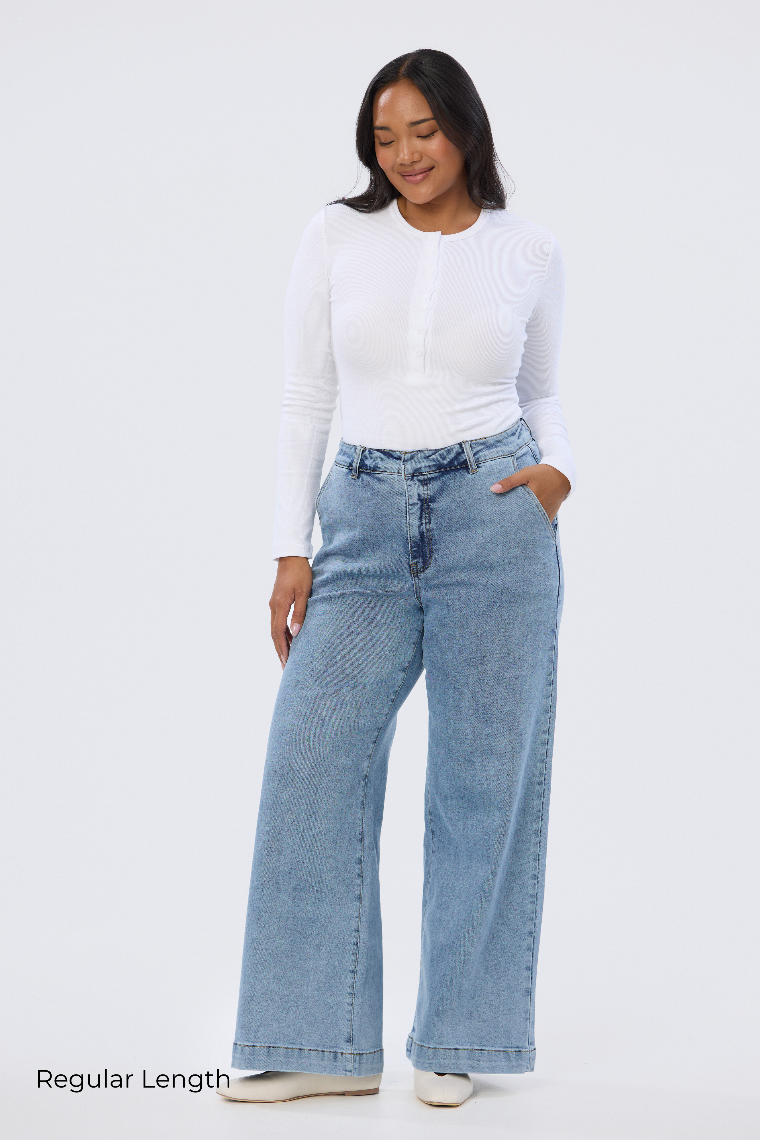Experience our Signature Wide Leg Jeans in Mid Blue Wash, crafted for timeless style and effortless ease, tailored to every shape and size. With a touch of stretch for comfort and premium fabric that holds its form, this is denim designed to endure. Find your perfect fit with our three lengths - regular, petite and tall.