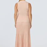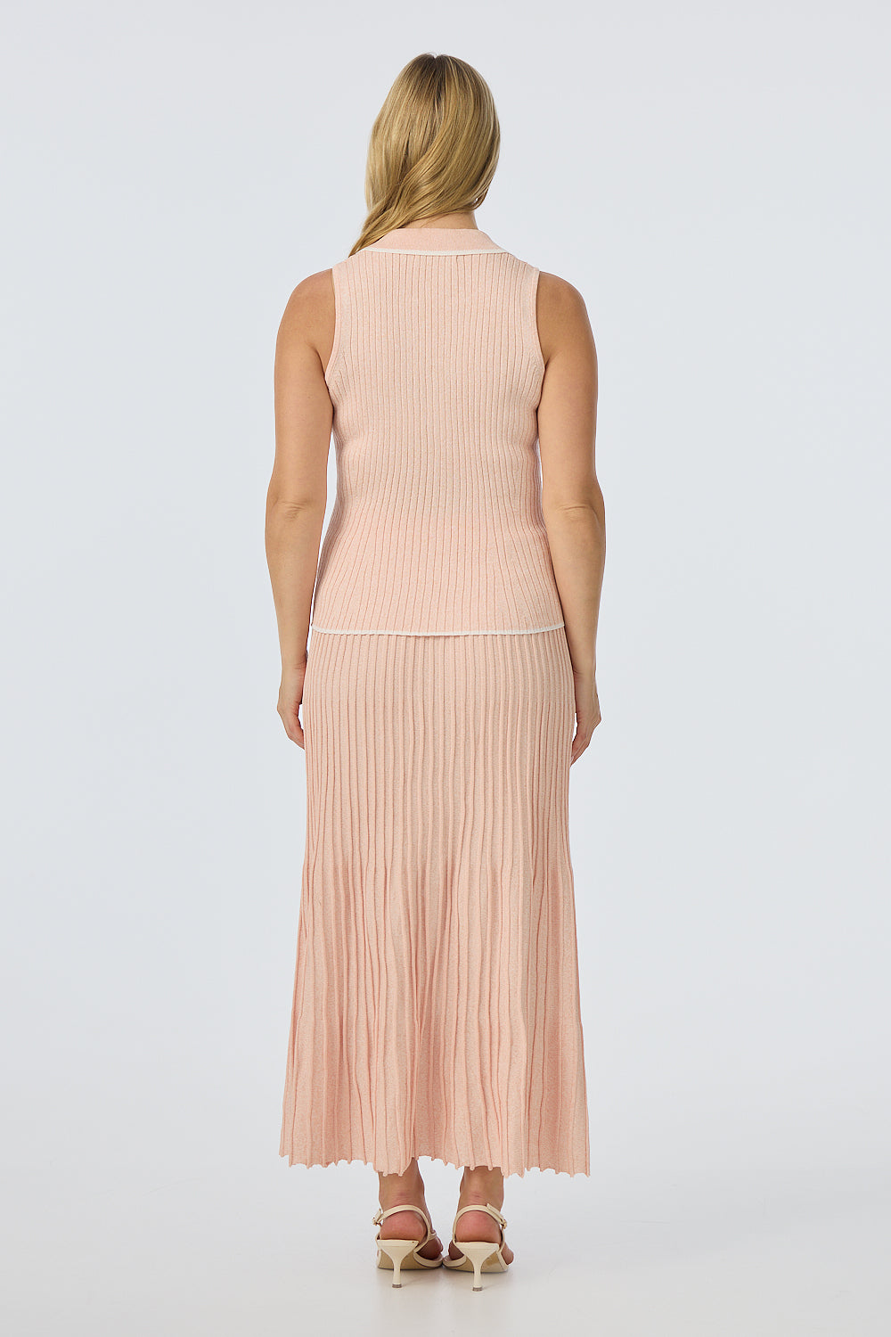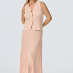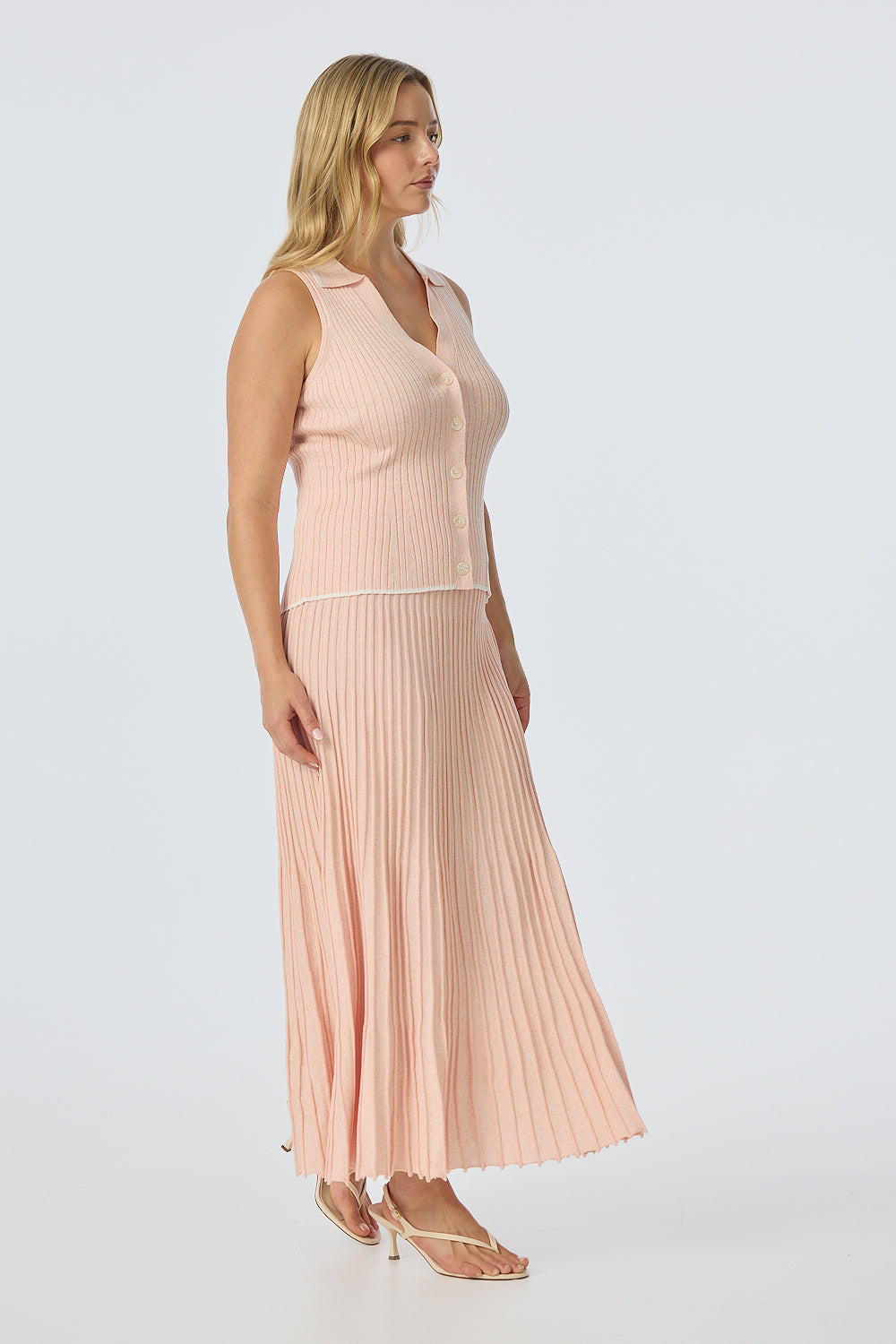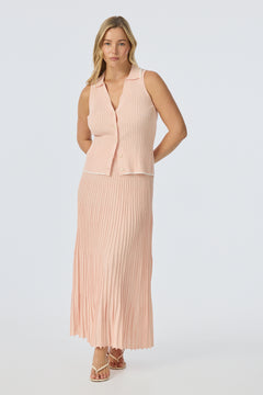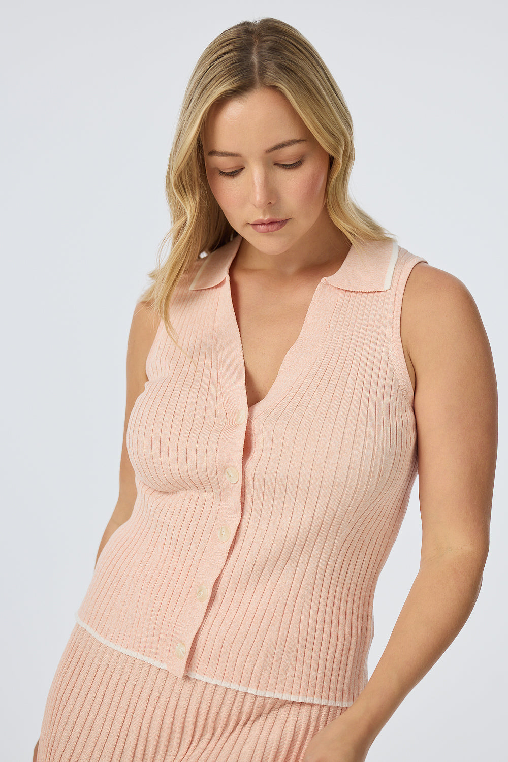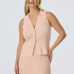 The Sleeveless Buttoned Knit Top in Peach Marl is a fitted, mid-length style with a V neckline, collar, and front placket with marble-effect buttons. It pairs perfectly with the matching Rib Knit Skirt for a coordinated, effortless look.