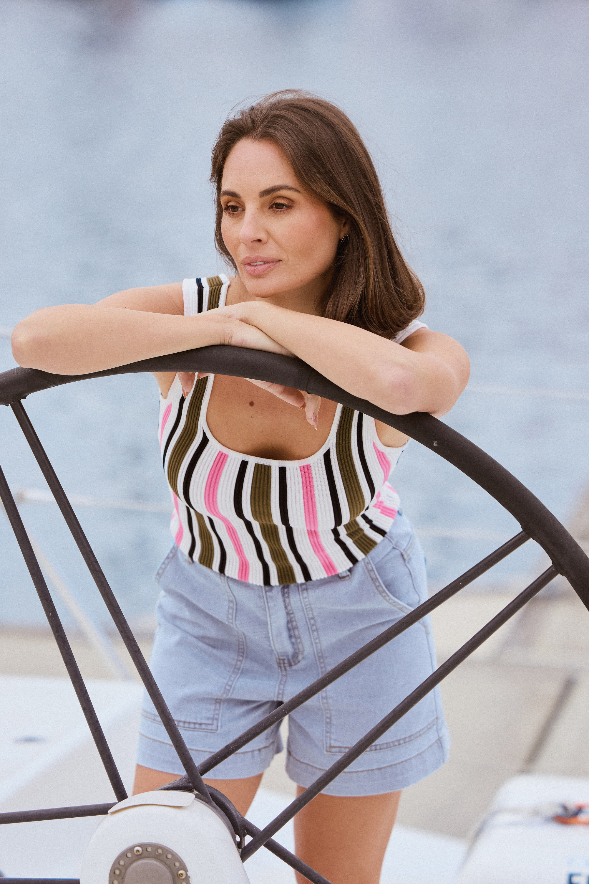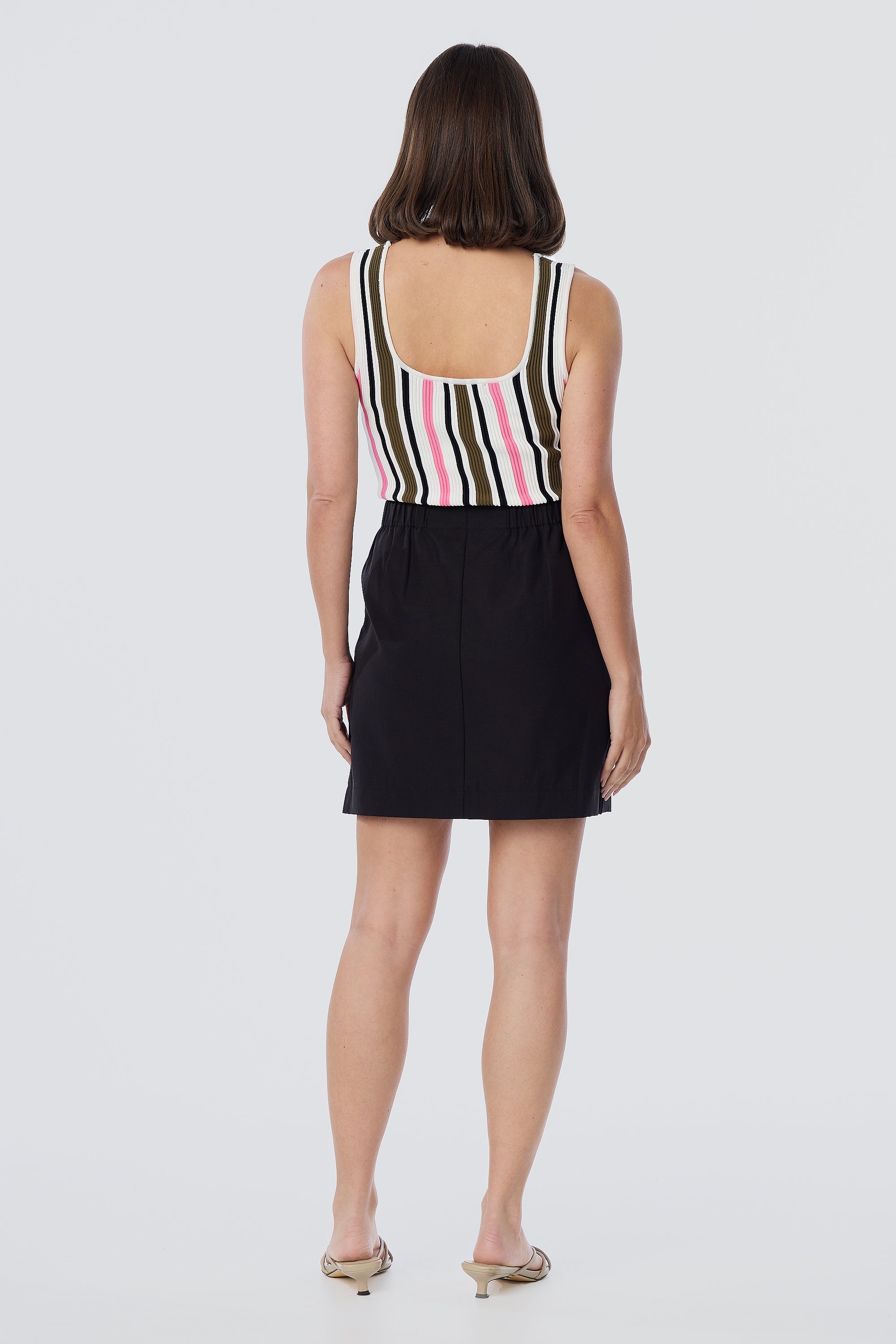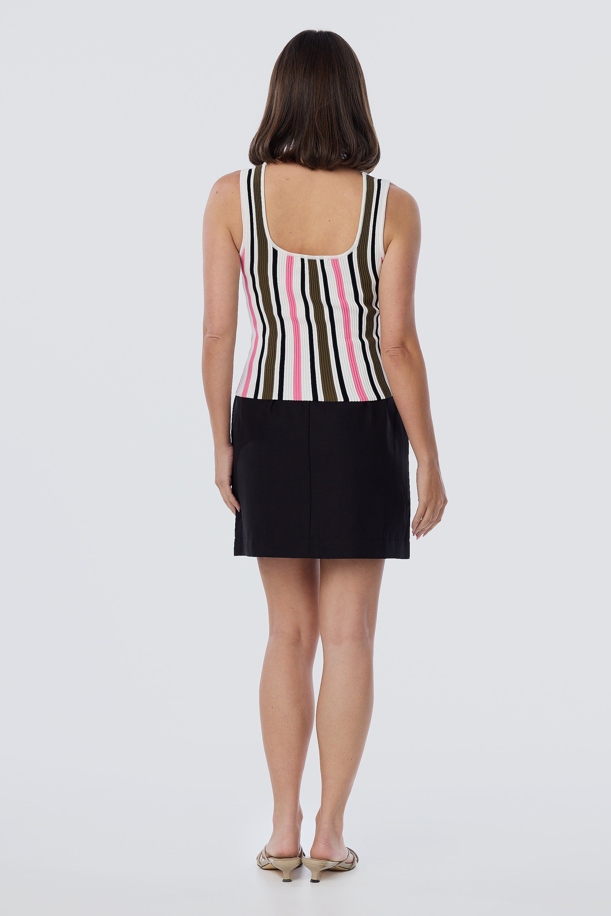 A sleek staple with a flattering neckline. The Square Neck Knit Tank in Olive/Pink Multi Stripe features a clean square neckline and a fitted silhouette for a modern, streamlined look. Cut to a mid length in a mid-weight rib knit, it offers both structure and stretch for all-day comfort.