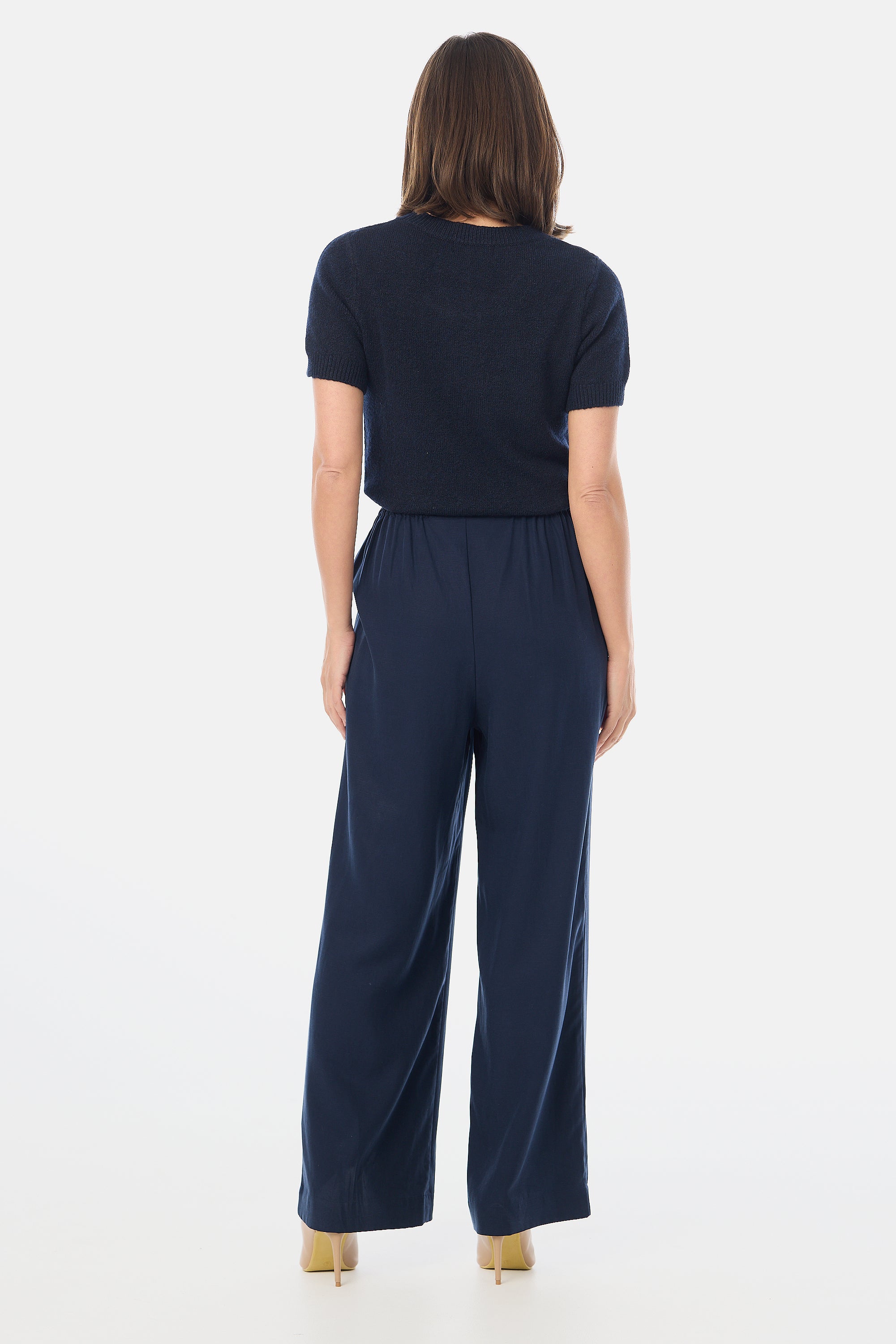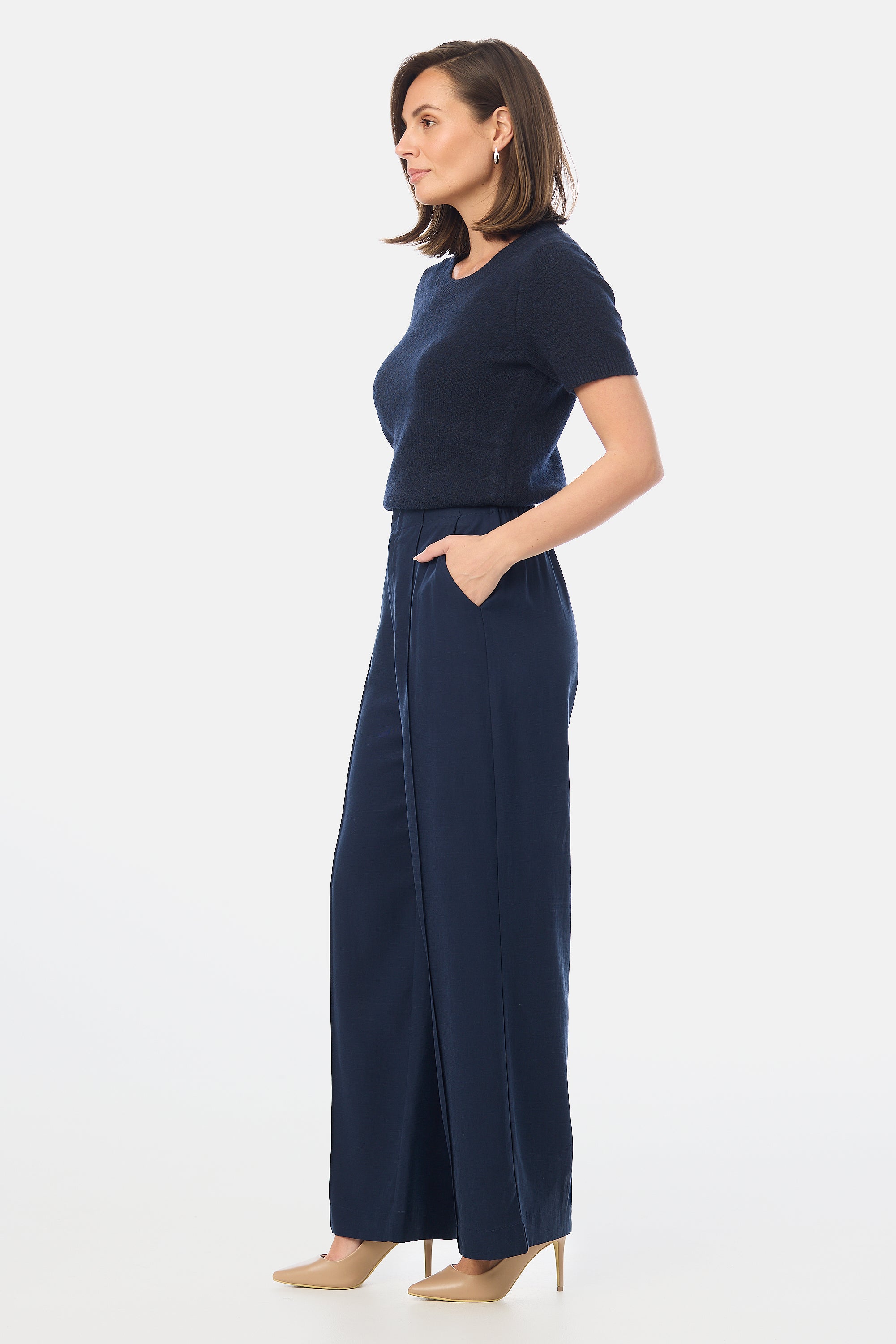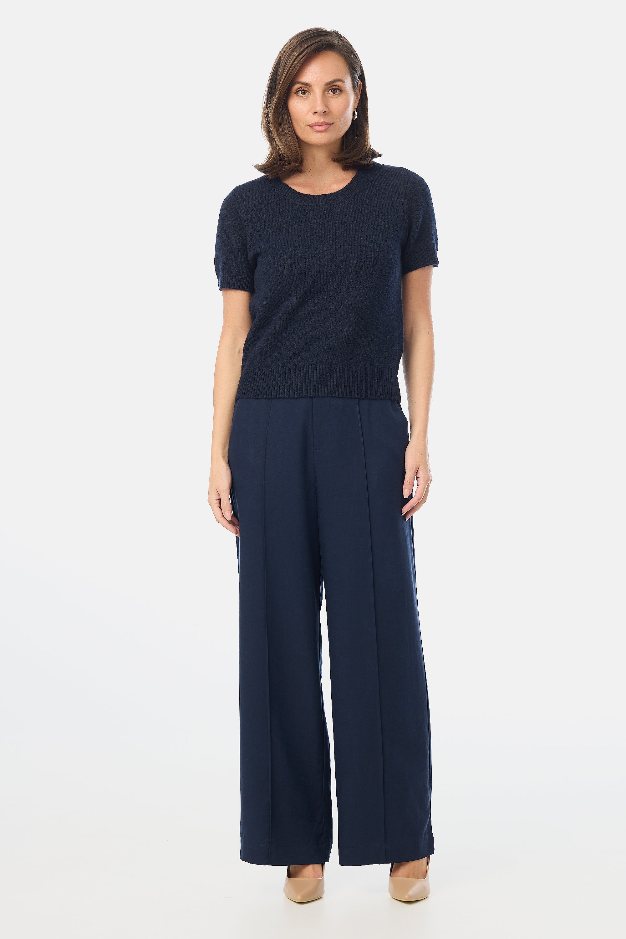 Meet your newest elevated basic, the Textured Short Sleeve Knit Top in Navy. The tactile finish and relaxed silhouette offer a refined option for everyday wear, easily paired with trousers, skirts, or denim.