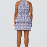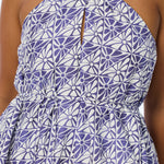 The Twist Neck Halter Top in Blue Mosaic is a structured yet airy piece featuring a twisted neckline and flattering A-line silhouette. The included tie belt defines the waistline while the cotton lining ensures all-day comfort.