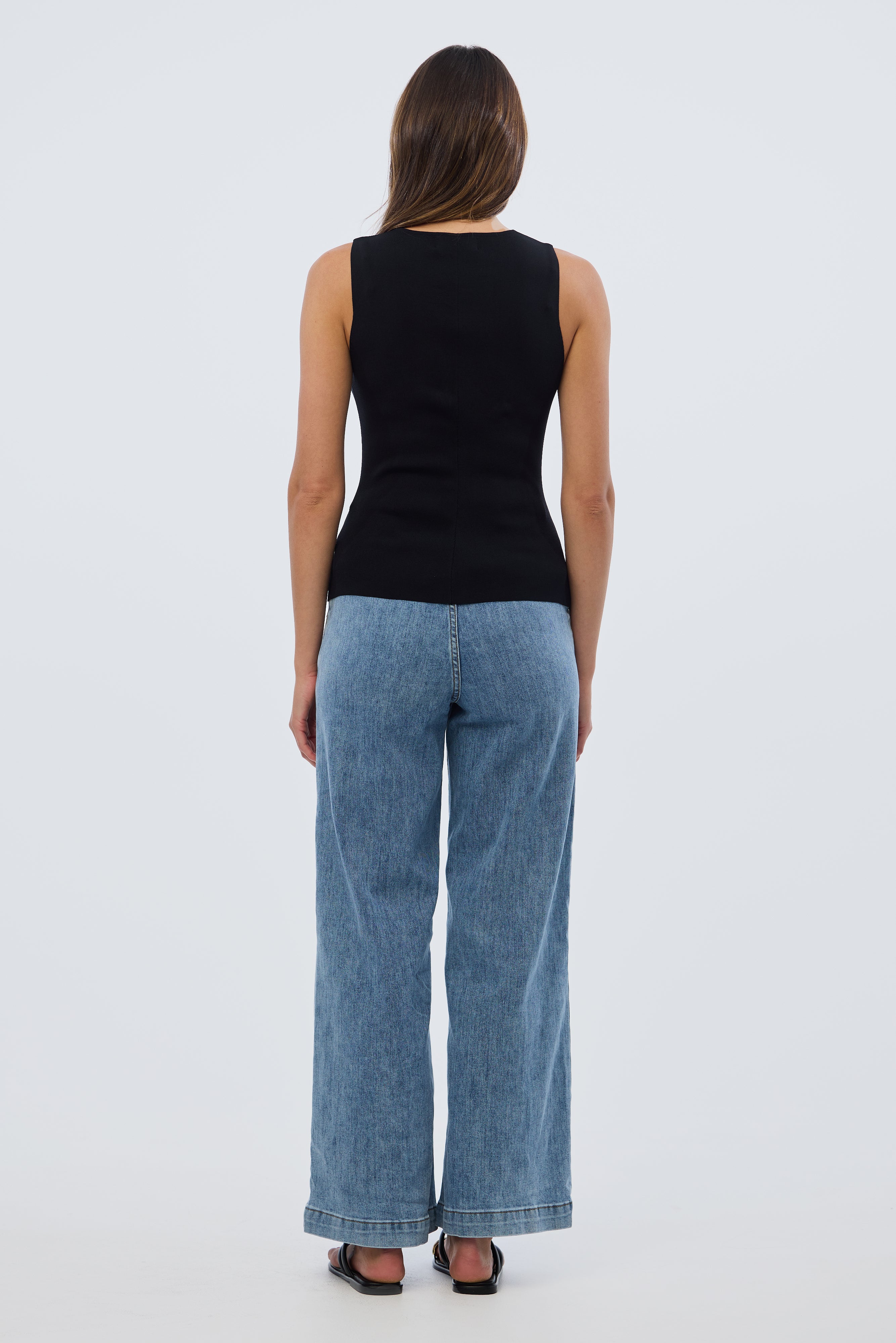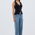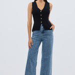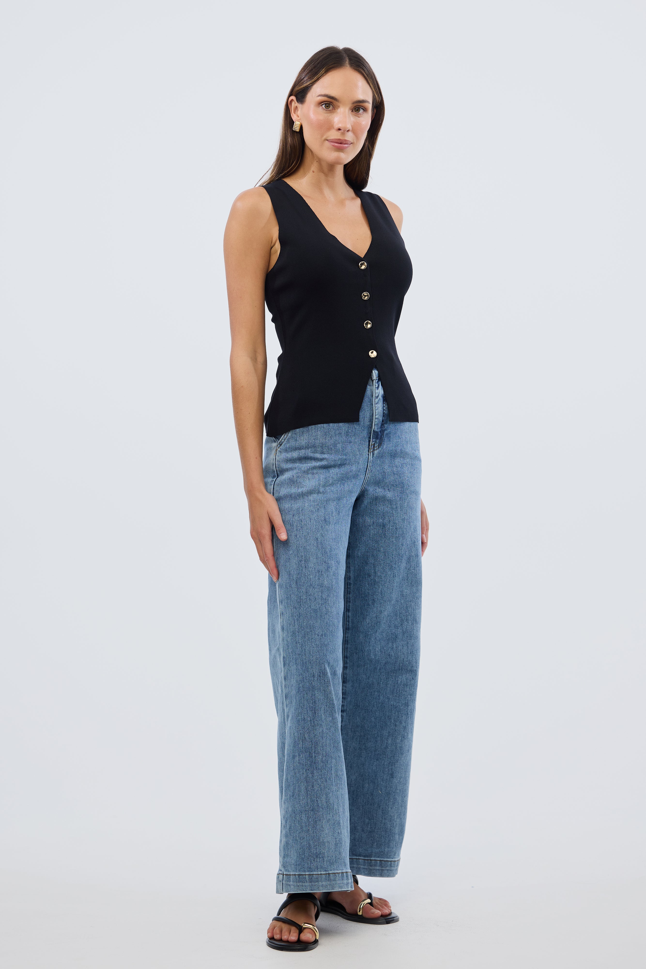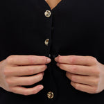 Elevated and refined, the V Neck Knit Vest in Black features a classic V neckline, gold button closure, and concealed snaps at the bust for a seamless fit. Crafted from a stretch mid-weight knit, this sleeveless vest is a versatile piece, perfect for day-to-night styling.