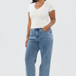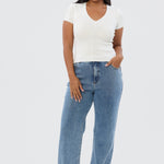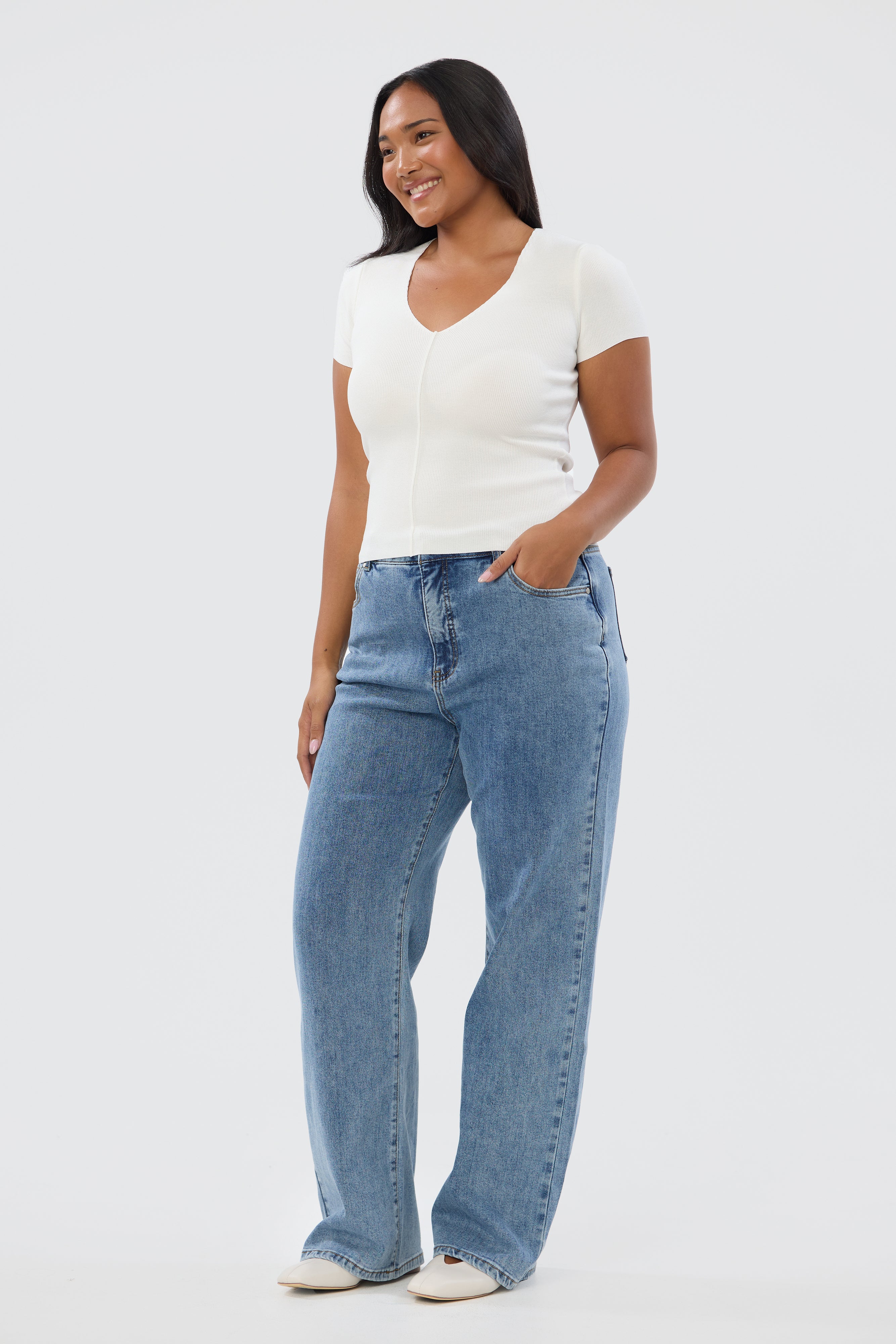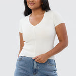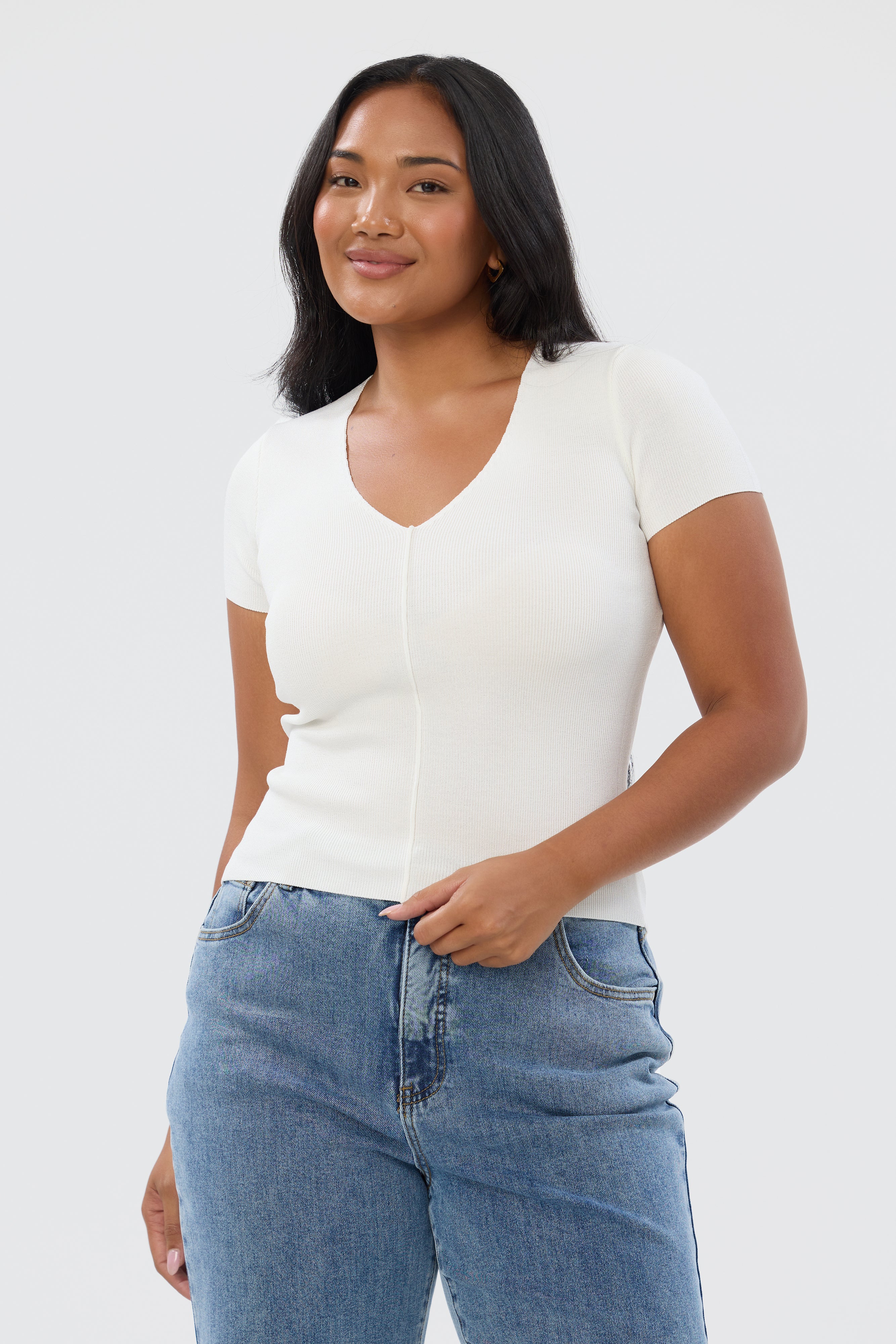 Refined and versatile, the V Neck Short Sleeve Knit Top in White features a fitted silhouette with a flattering V neckline and centre-front seam detail. Crafted in a mid-weight stretch rib knit, it offers a polished finish for effortless wear.