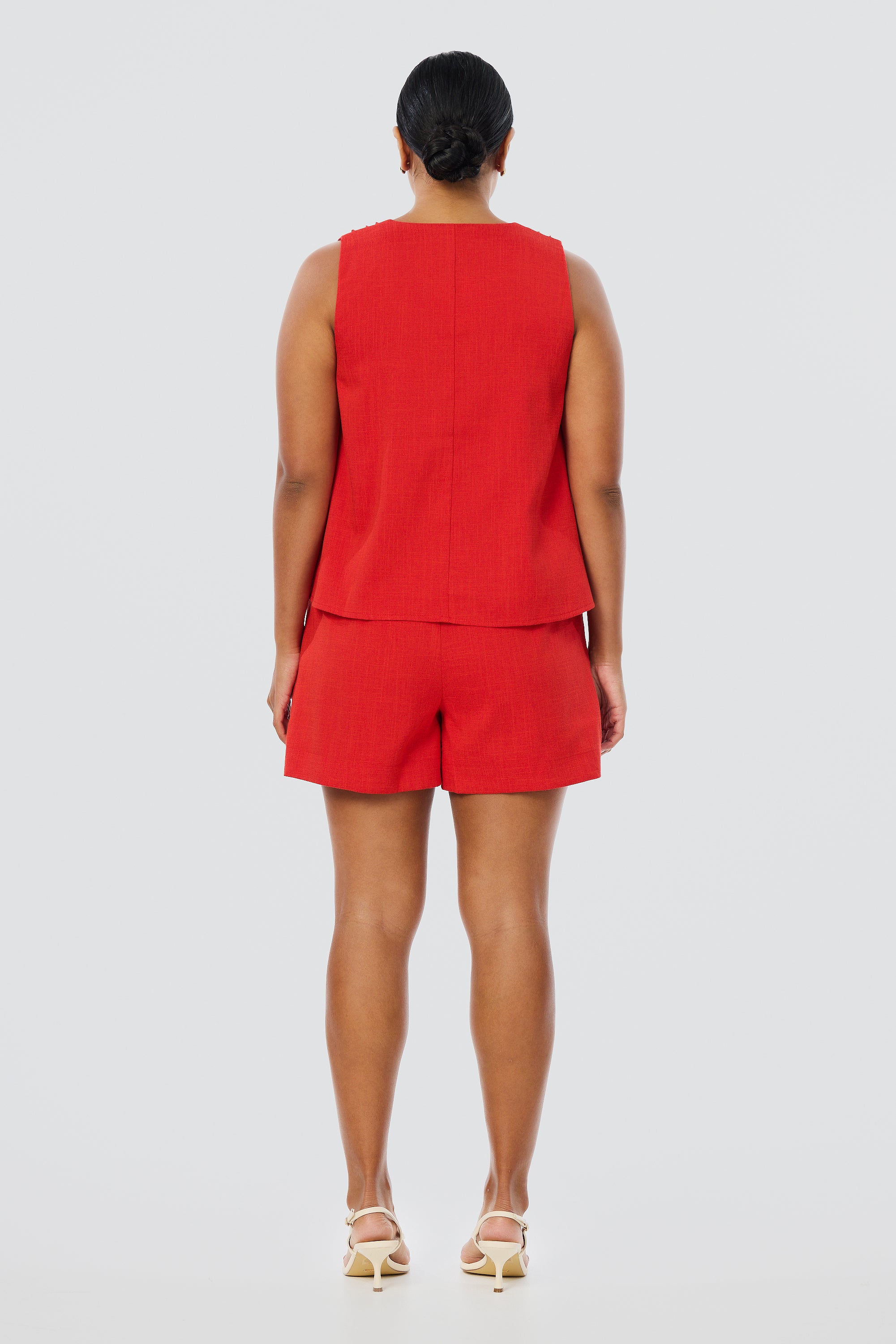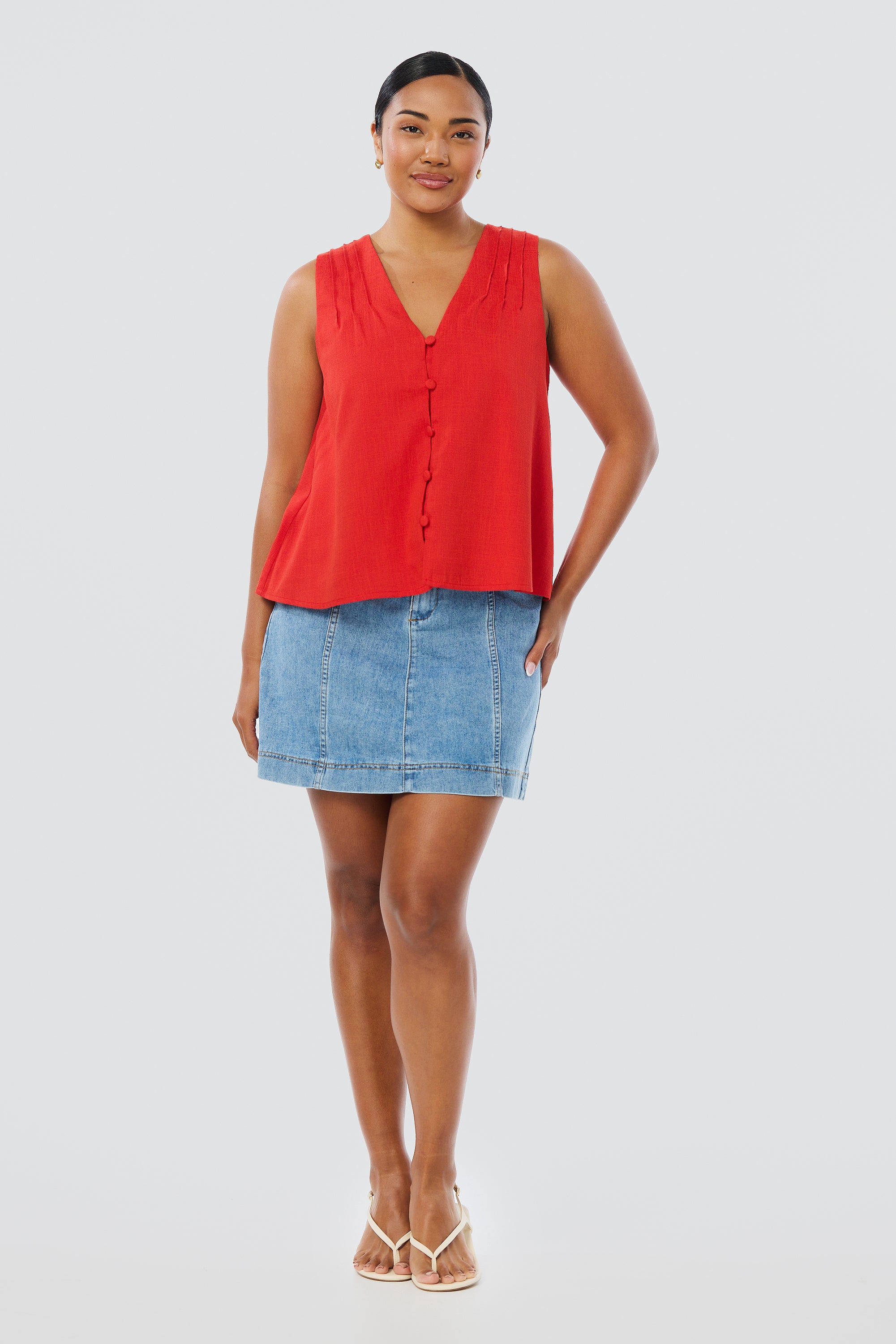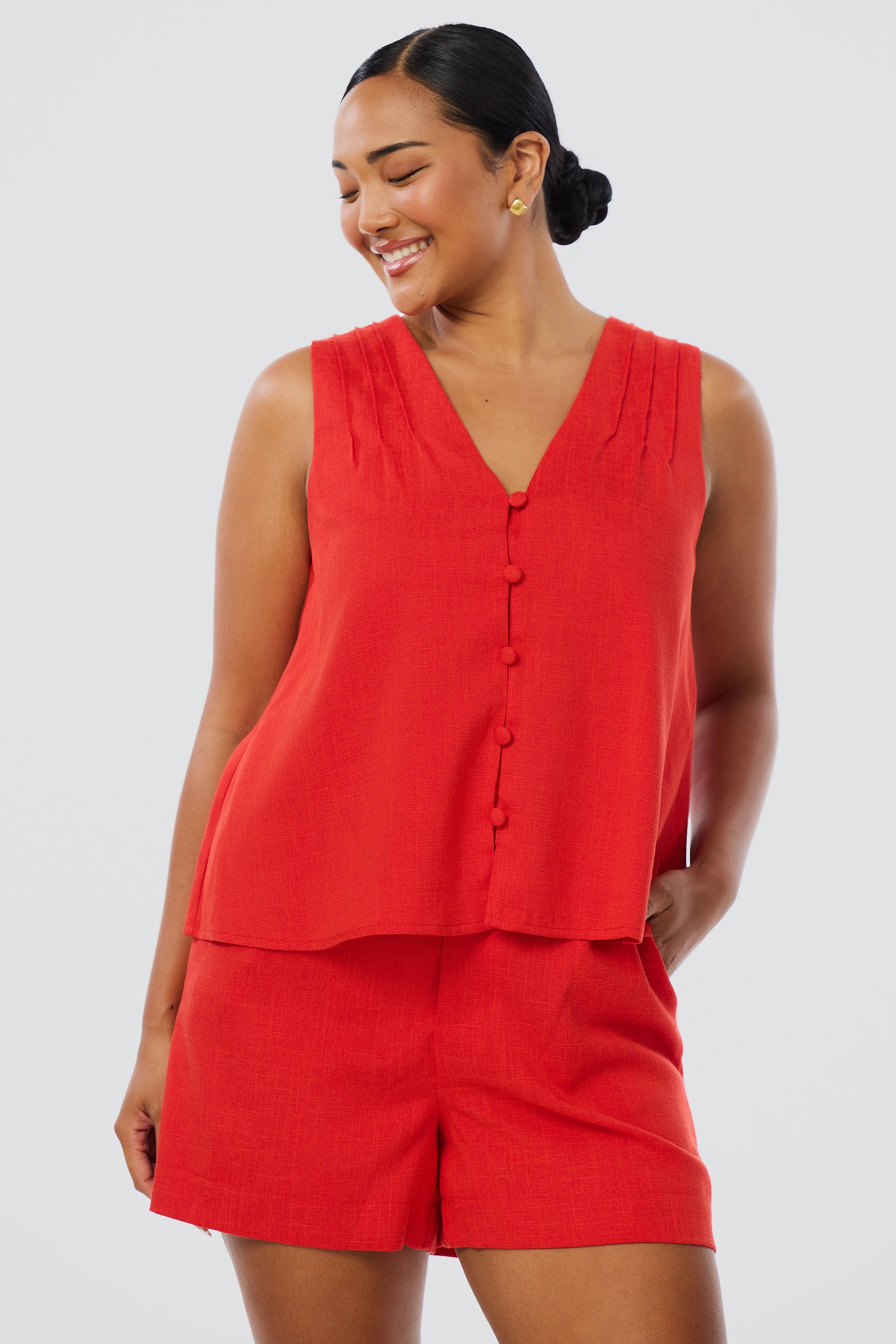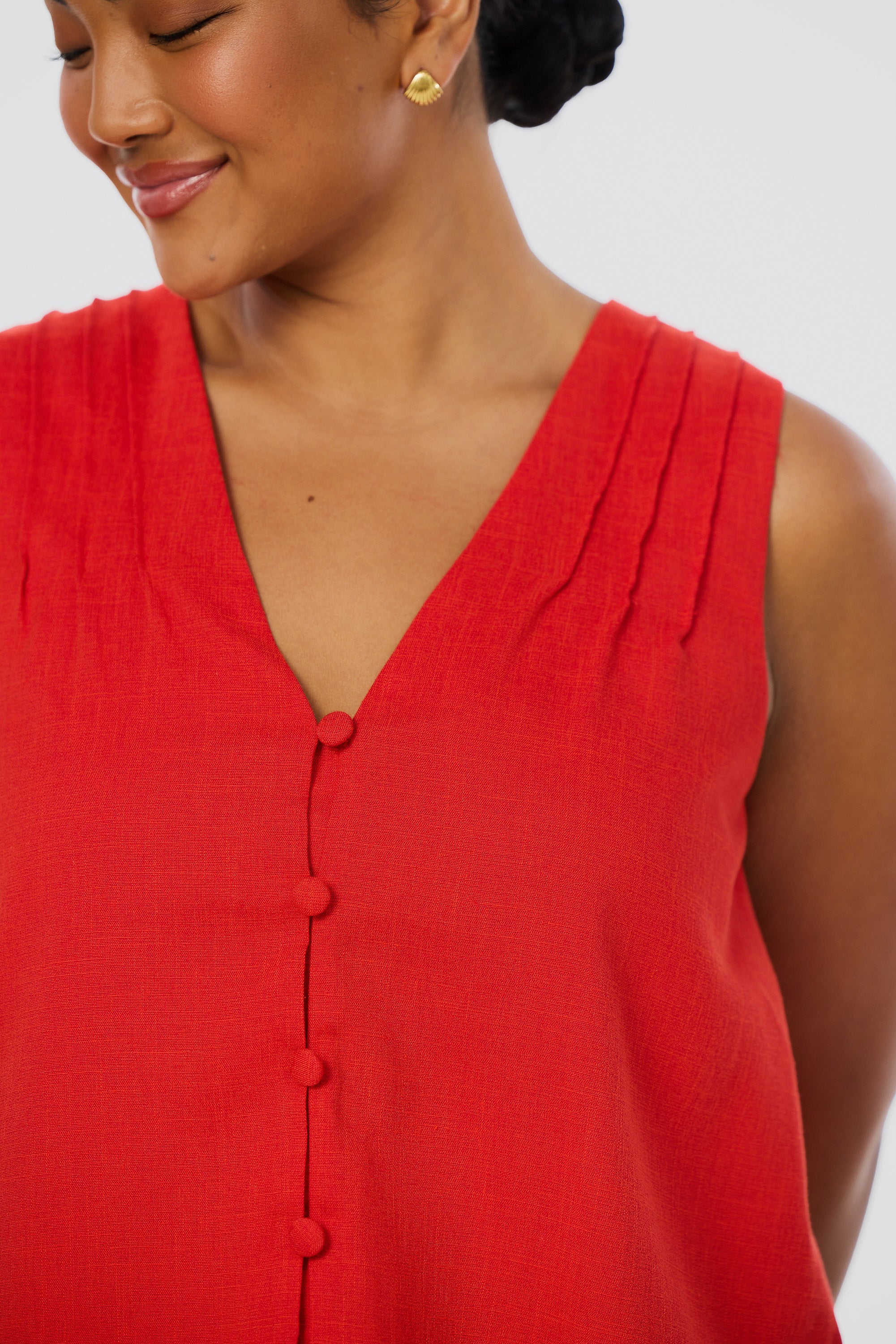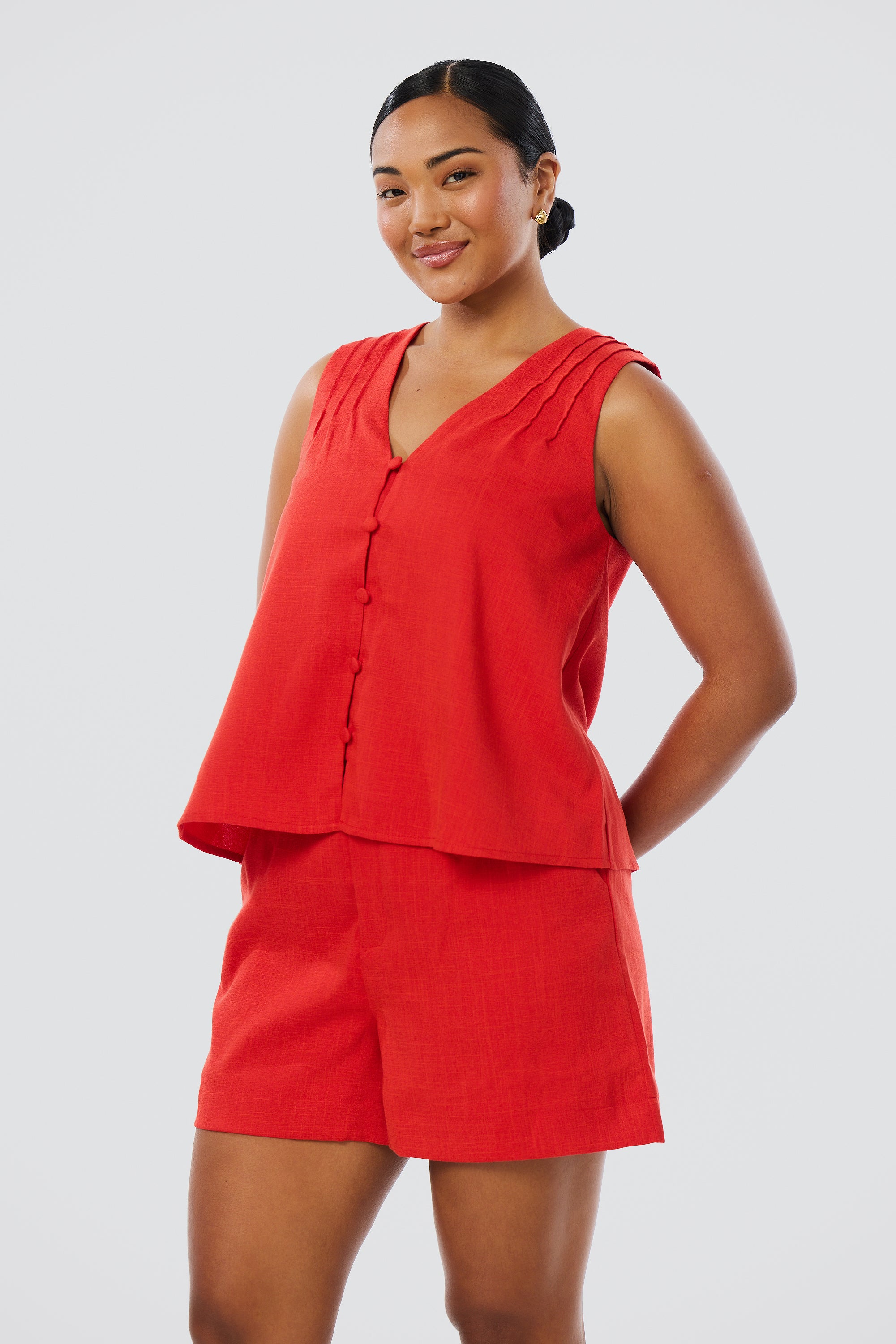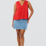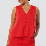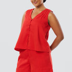 The V-Neck Swing Top in Crimson is lightweight and breezy, with pintuck details and a slightly cropped fit. Fully lined and easy to style, it’s a relaxed warm-weather essential.